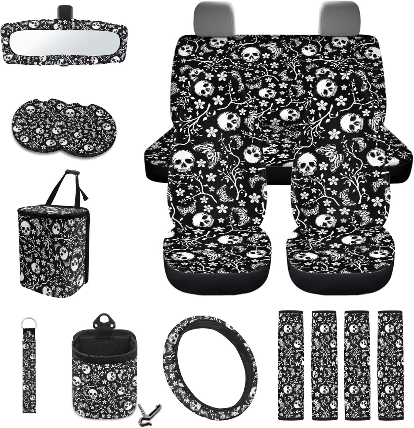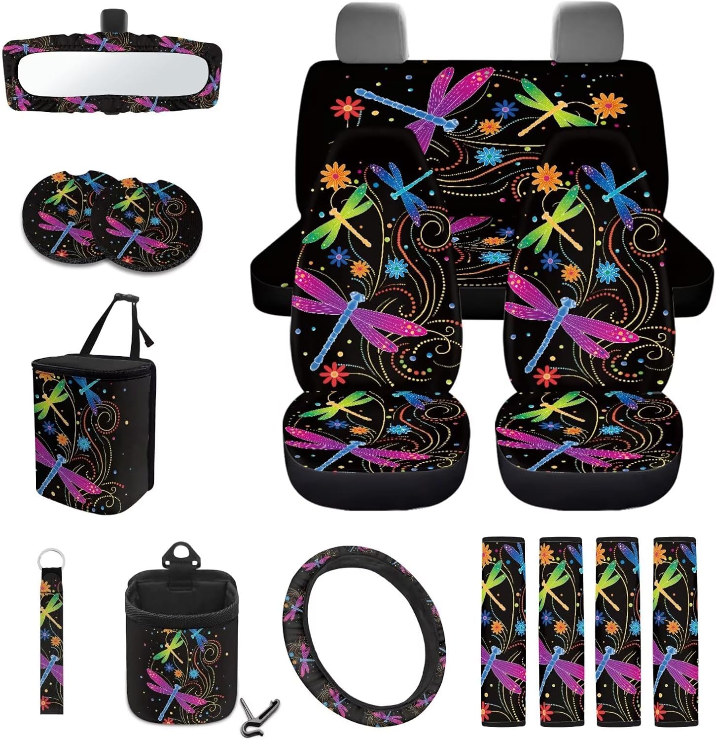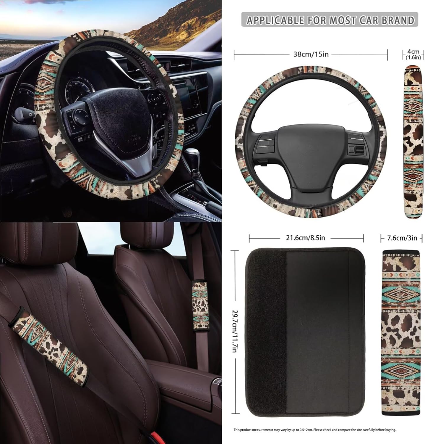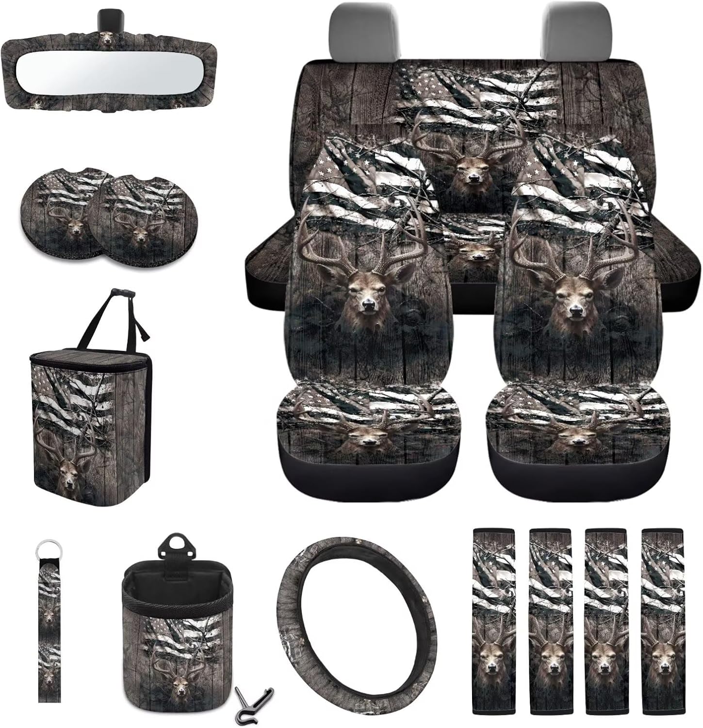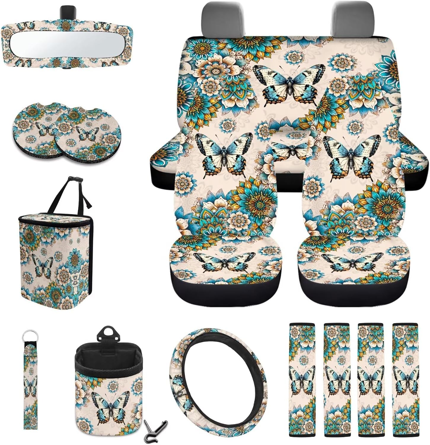 Package Includes: 2 front seat covers+2 split rear seat covers 1Pcs steering wheel cover(suitable for most 15 inch steering wheel cover) 4 seat belt covers 1 rearview mirror cover 2 coasters 1 keychain 1 car trash can+1 air vent storage bag How to Install: You can easily install the seat cover onto the seat and secure it with nylon buckles or straps; Just place the steering wheel cover on the steering wheel; The seat belt cover only needs to be easily threaded through the seat belt buckle and tightened. Even for the first time, it can be installed in a short amount of time, instantly giving your car a brand new look Multiple prints for you to choose from, such as Aztec, American flag, stripes, flowers and animal prints, which not only decorates your car, but also protects the interior from dust, tears, abrasions, pet hair and other impacts. Extend the life of your car interior. Meet your everyday car interior needs Perfect Gift: Our car interior package is suitable for most cars, sedans, trucks, SUVs, and more. It is the perfect gift for family, friends, car owning families, and pet owners; Giving them these practical and fashionable gifts on holidays, birthdays, or important days can strengthen your relationship with each other Tips: Measurement discrepancies of 1-2 cm are normal due to variations in measurement methods Due to the influence of light and environment, small color differences are also normal