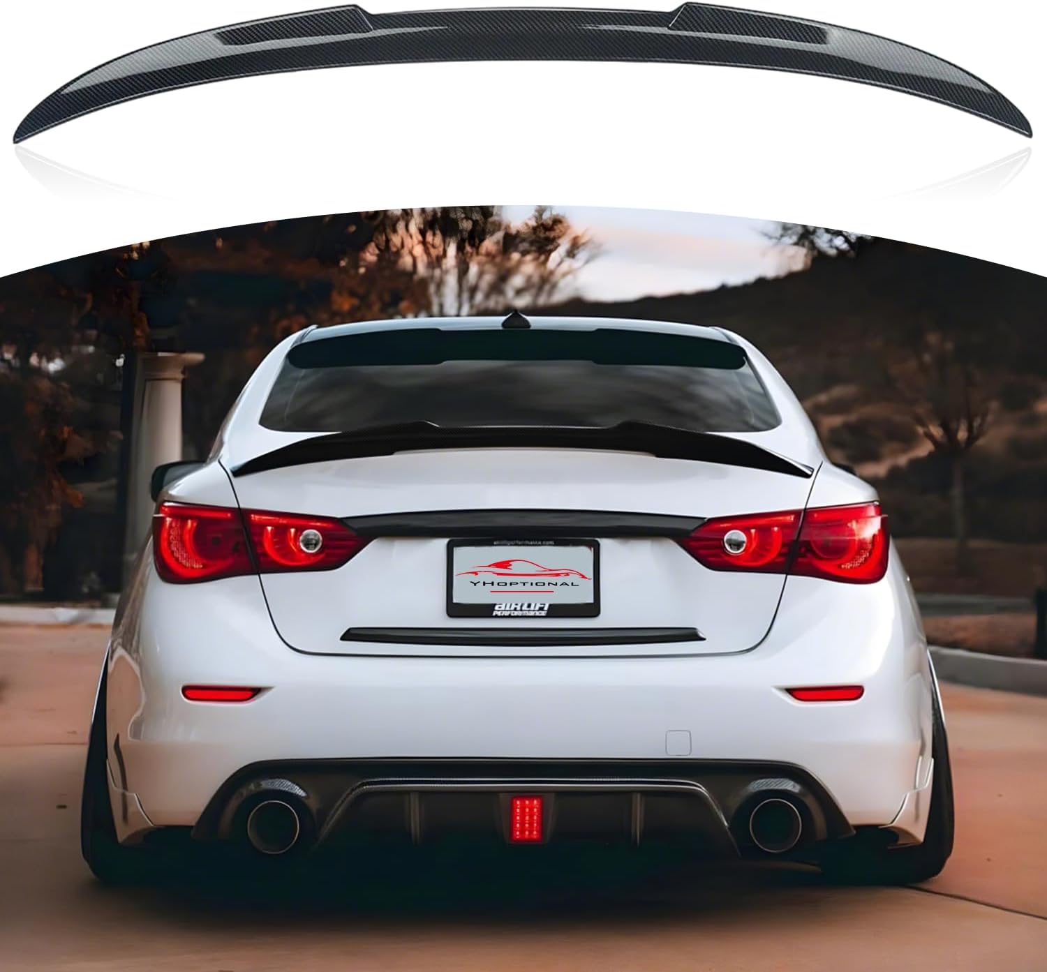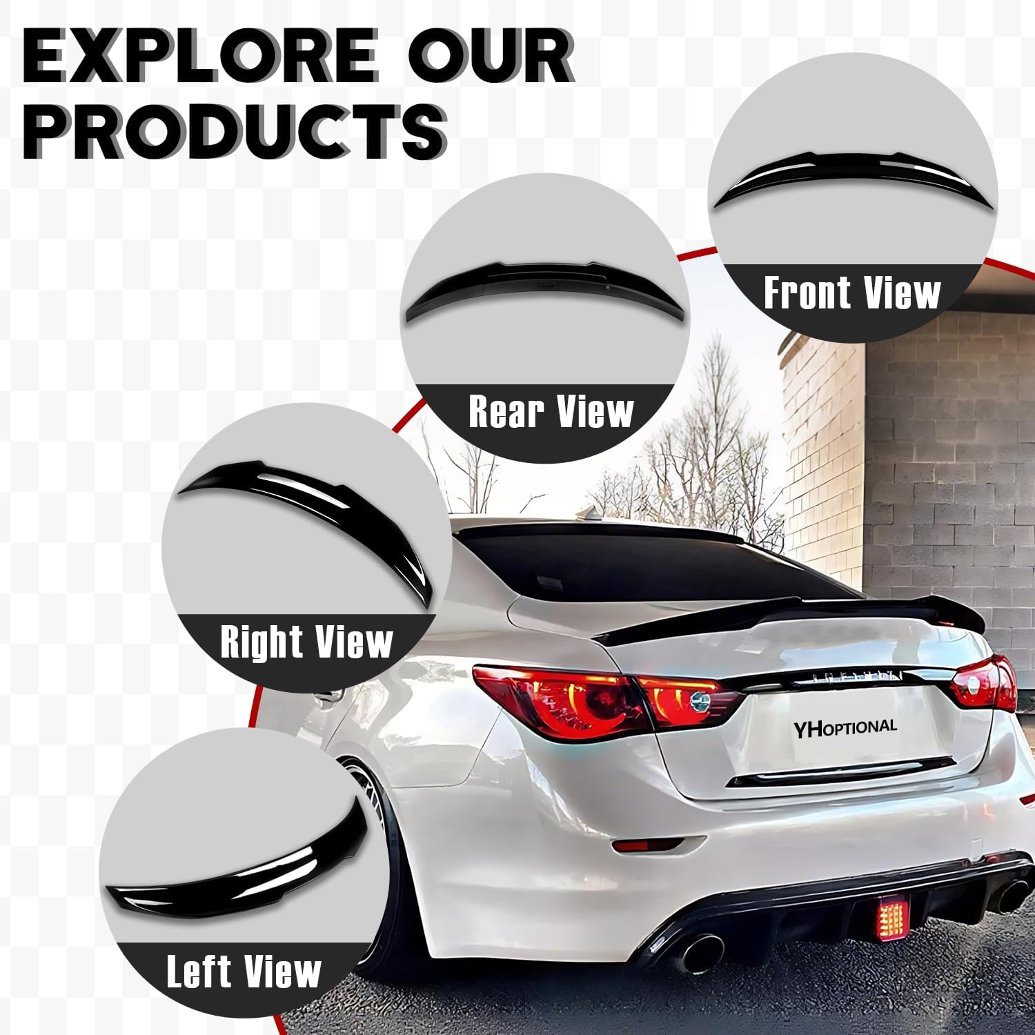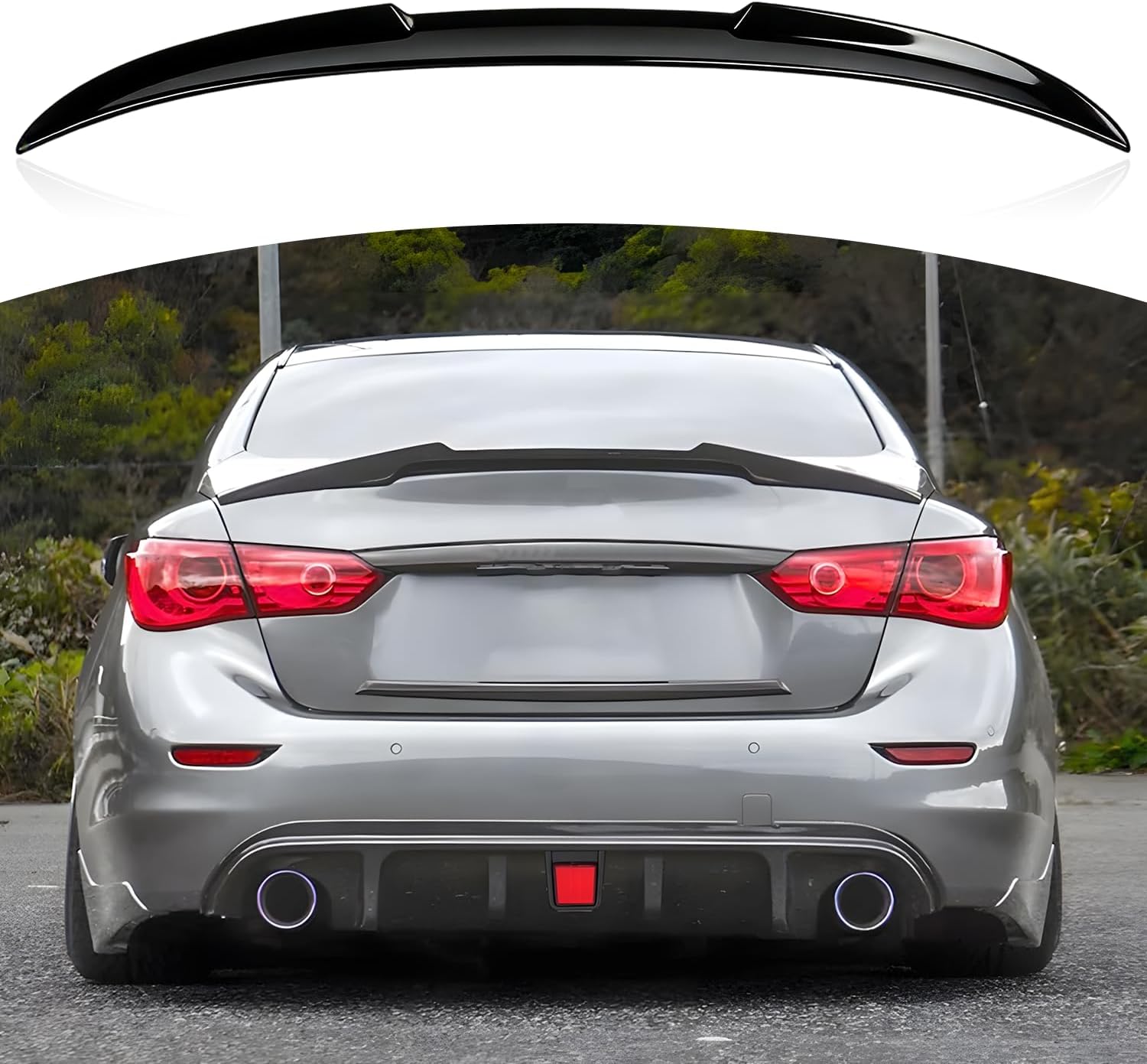 Transform the appearance of your 2014-2024 Infiniti Q50 with this sleek rear spoiler. The package includes both a rear spoiler and roof spoiler in glossy black finish, adding an aggressive yet refined aerodynamic profile to your vehicle. These spoilers are precision-engineered to complement the Q50's existing body lines while creating a more dynamic silhouette. The kit offers a perfect blend of style and functionality, enhancing your vehicle's sporty character. Installation is straightforward, designed specifically for Q50 models from 2014 through 2024. The glossy black finish provides a premium look that pairs seamlessly with any exterior color. Whether you're looking to customize your Q50's appearance or add a touch of sportiness, this spoiler kit delivers a professional-grade enhancement to your vehicle's exterior design.