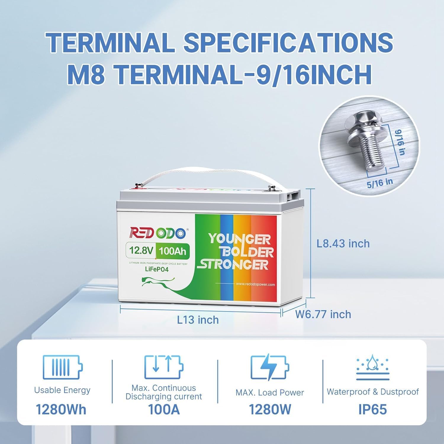 | Included Components | 12.8V 100Ah LiFePO4 Battery, Insulating Caps for Bolts, M8-5/8" Terminal Bolts |
