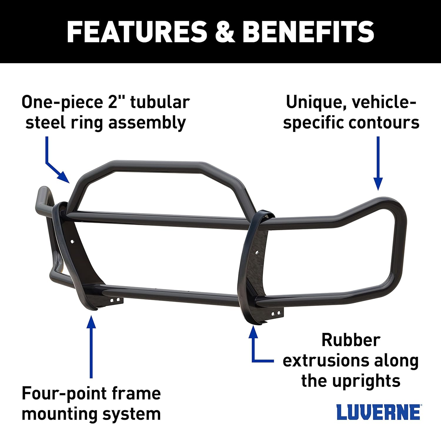 The LUVERNE SolidShield van grille guard is exactly what it sounds like: a truly solid grille guard that shields, preserves and protects your fleet day after day, mile after mile. SolidShield is the grille guard made for cargo van fleets, combining state-of-the-art technology with a stylish look to deliver quality protection and sophistication all in one. SolidShield is a step above the rest with its 4-point 26304560 mounting system, which adds extra strength, durability and fleet uptime compared to the more common 2-point mounting system. To make upgrading extremely convenient, it has light brackets available for mounting aftermarket lights (sold separately). It features a one-piece 2" tubular steel ring assembly for reliable strength and rubber extrusions that are formed over metal strips on the uprights. Its vehicle-specific construction contours to the front of the van, giving your fleet a unique appearance that stands out and makes a strong statement. This particular model fits select years of the Ford Transit (see application info to verify fitment). In addition to its unrivaled strength and sleek appearance, the SolidShield has an easy installation process using vehicle-specific, high-strength steel mounting brackets and a simple technique that doesn't require the use of a drill. Finished with an E-coat / semi-gloss black powder coating for dependable protection, SolidShield is the tough grille guard that combines strength, durability and style without sacrificing function.