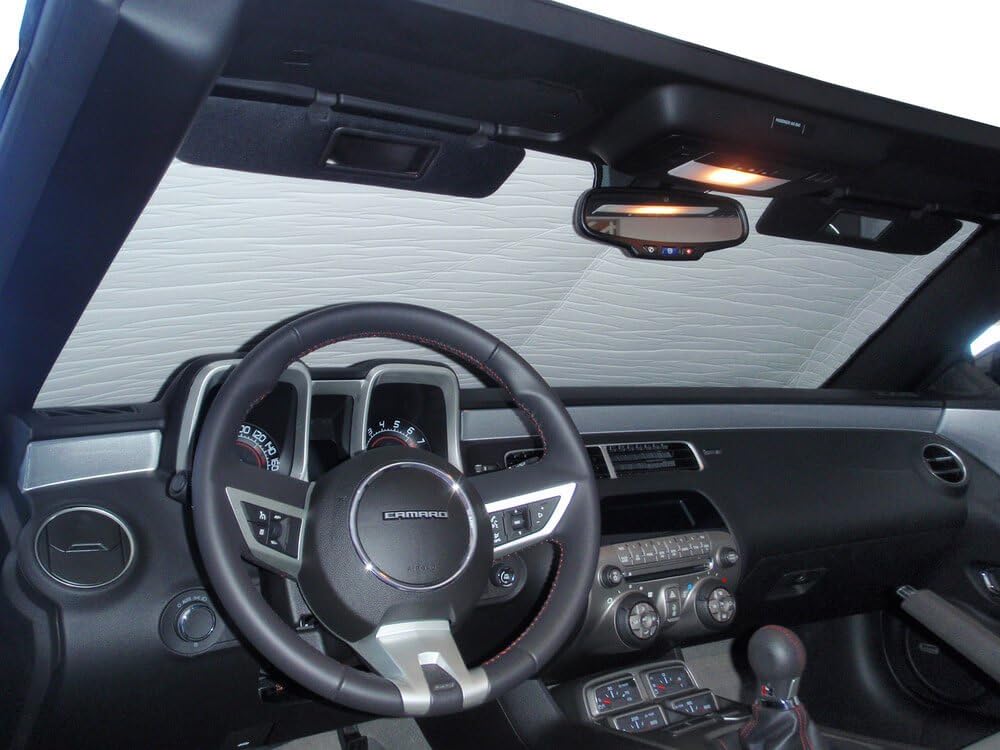 Heatshield Part #1330-G will fit a Chevrolet Camaro Convertible 2010, 2011, 2012, 2013. Heatshield Sunshades are the original custom fit sun shades for automobiles and aircraft made in the USA for over 30 years! All of our sunshades are sturdy enough to be supported by the sun visors alone, yet remain flexible enough to be bent behind the rear view mirror and roll for storage. To install, simply unroll across the dash, maneuver the Heatshield behind the rear view mirror and flip the sun visors down. For storage, simply roll it up and secure it with the attached velcro strap and put it in the back seat. The Gold Series features a metallic gold exterior with a black interior. Each Heatshield is bound with a soft polyester binding, providing a smooth edge against the headliner and dashboard. The Heatshield material has been developed to be both user friendly and robust to allow for a long useful life. Heatshield comes with a 1 year limited warranty, with proof of purchase and a 30-day money back guarantee.
