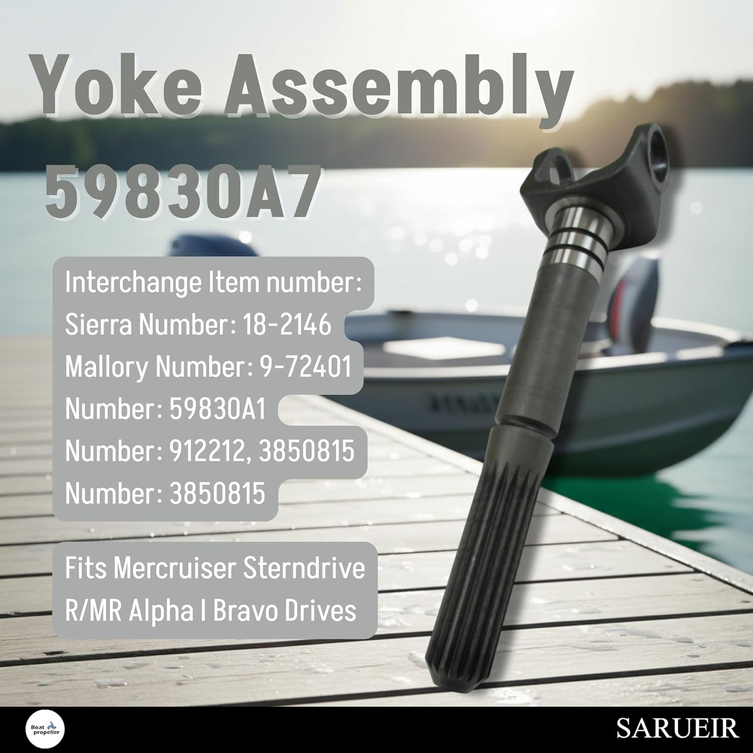 Premium Aftermarket Yoke Assembly Replacement (OEM 59830A7)Restore the drivetrain efficiency of your marine vessel with this heavy-duty Yoke Assembly. Engineered to meet or exceed OEM specifications, this component ensures a precise connection between the engine output and the upper gear housing, allowing for smooth power transfer and reliable steering articulation.Part Number Reference:OEM Replacement: 59830A7, 59830A1Volvo Penta / OMC: 3850815, 912212Sierra: 18-2146Mallory: 9-72401Fitment Compatibility Guide:Please check your engine model and year below to ensure proper fitment.Year Range Drive System / Model Notes 1983-1990 R/MR ALPHA ONE Fits R / MR / Alpha One Sterndrives 1991-1995 ALPHA ONE GEN II Fits Gen II Sterndrive & Transom Assembly 1994-1995 BLACKHAWK Fits Blackhawk Drive & Transom Assembly All Years BRAVO I, II, III Fits Bravo One, Two, Three Sterndrive & Transom Assembly Compatible Volvo Penta & OMC SX/DP Drives:DP Series: DP-S, DP-S1, DP-SM, DP-SMTDSX Series (C): SX-C, SX-C1, SX-C2, SX-CLT, SX-CT, TSK SX-C3ACSX Series (M/R/S/T): SX-M, SX-MTD, SX-R, SX-RT, SX-S, SX-SLT, SX-T, TSK SX-MEngine Displacement Compatibility:Fits a wide range of inboard/outboard engines including: 2.3L, 3.0L, 3.5L, 4.3L, 4.6L, 5.0L, 5.7L, 5.8L, 7.4L, 7.5L, and 8.2L models.Package Includes:1 x Yoke Assembly for SterndriveNote: This is an aftermarket replacement part. Manufacturer names and part numbers are used for reference purposes only.
