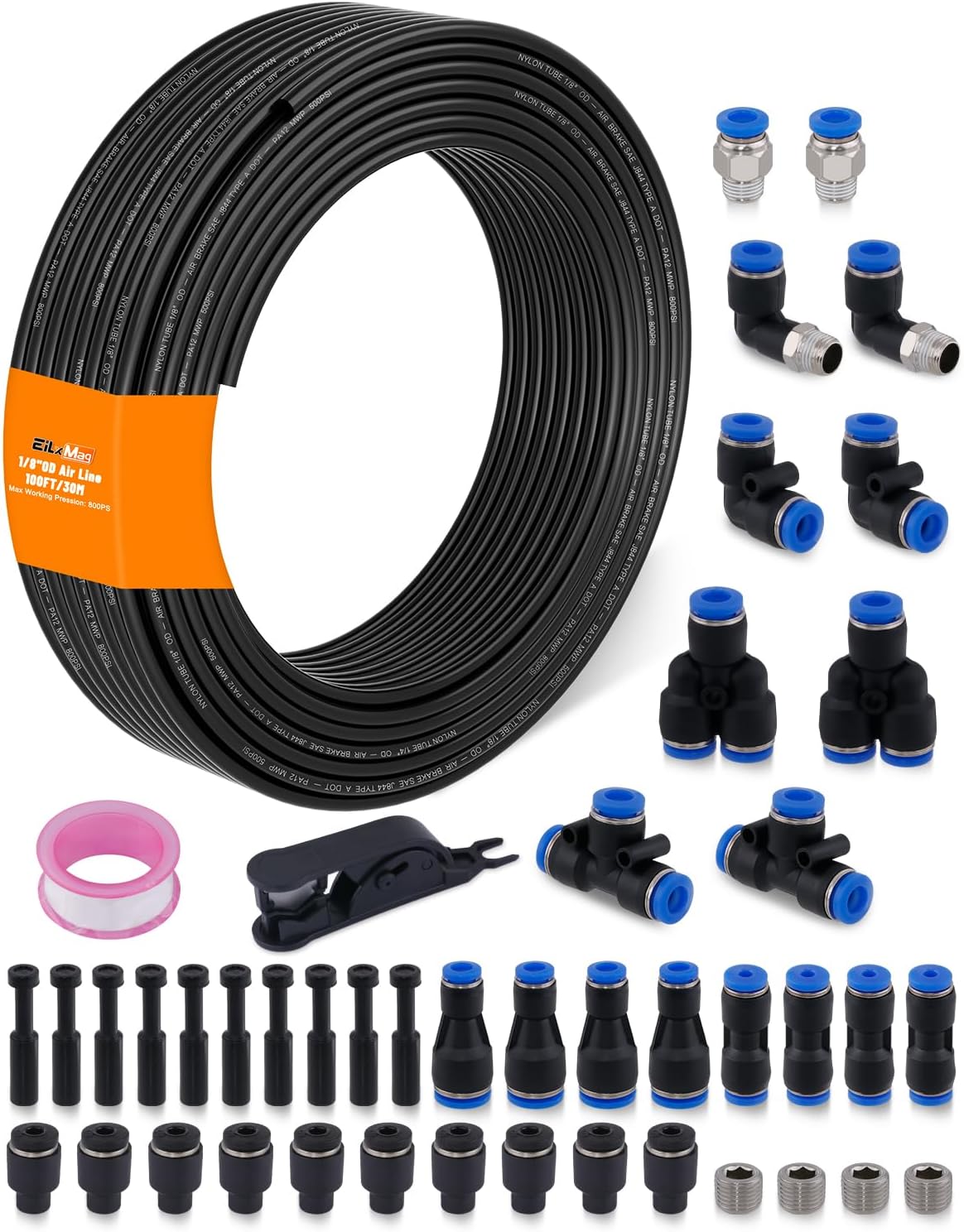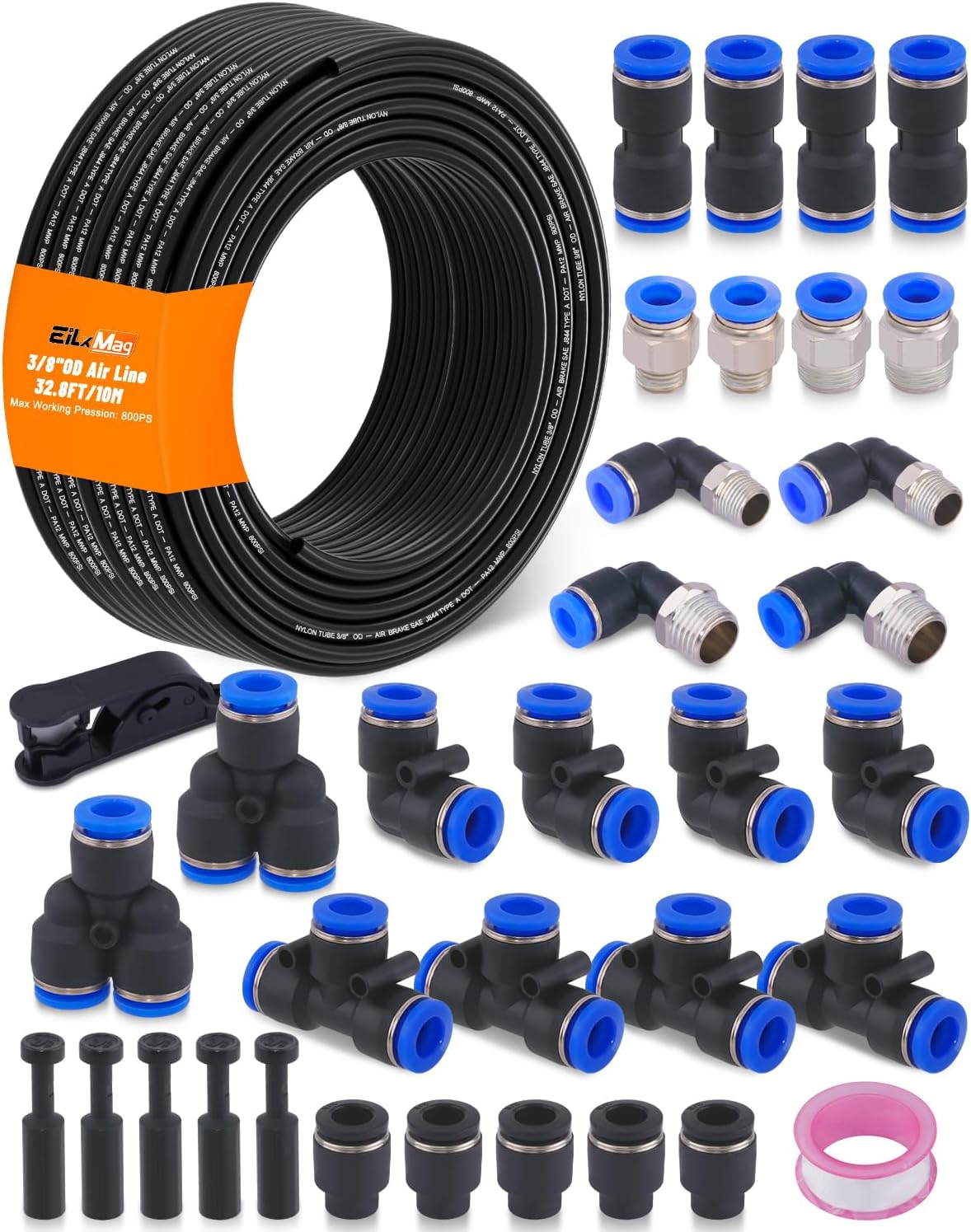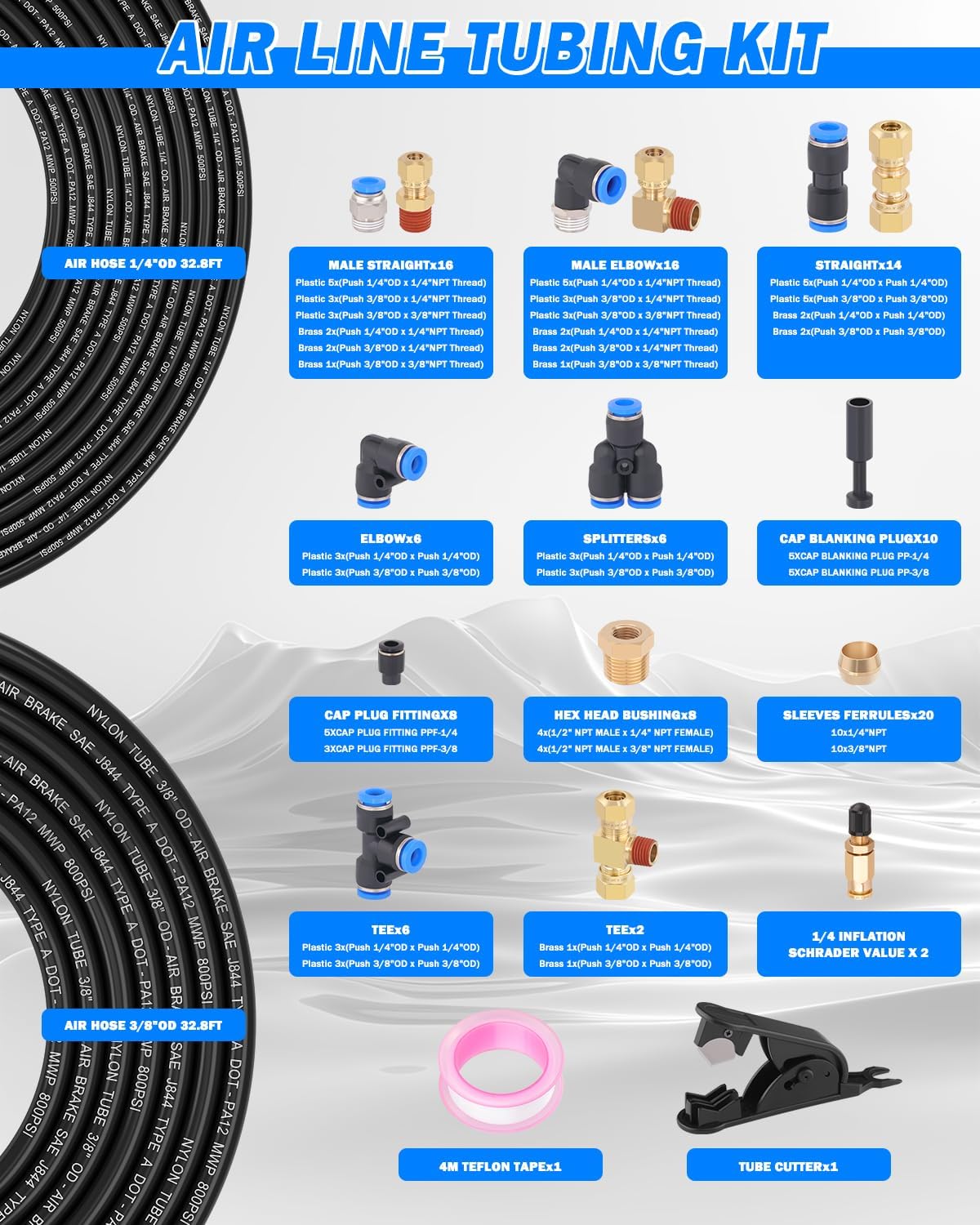 118PCS AIR LINE TUBING KIT: Package includes 32.8FT(10M) 1/4" tube OD DOT air line, 32.8FT(10M) 3/8" tube OD DOT air line, 16pcs Male Straight Unions, 16pcs Male Elbows, 14pcs Straight Unions, 6pcs Elbows, 8pcs Tees, 6pcs Splitters, 8pcs Hex Head Bushing, 8pcs Cap Plug Fitting, 10pcs Cap Blanking Plug, 20pcs sleeves ferrules, 1pc 1/4 inflation schrader value, 1pc tube cutter, 1pc Teflon tape