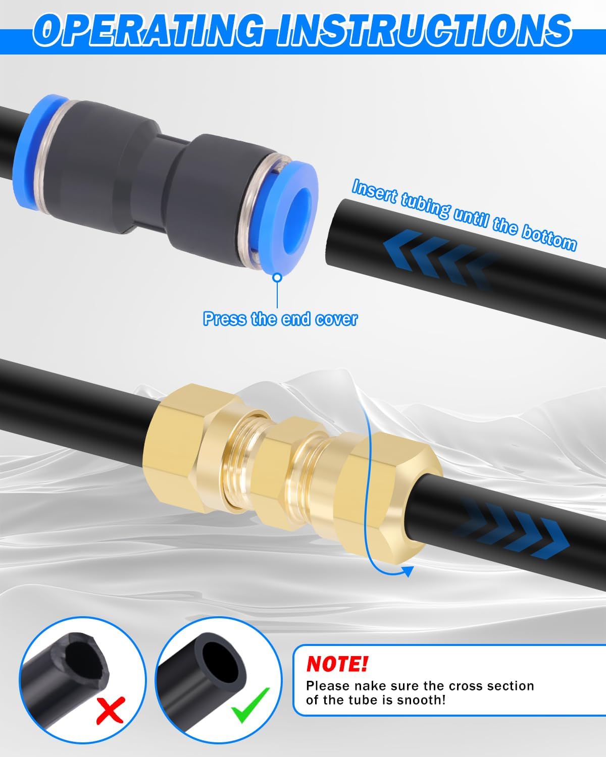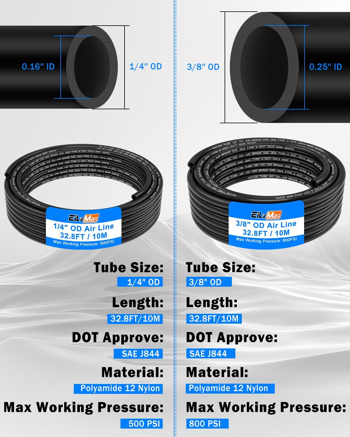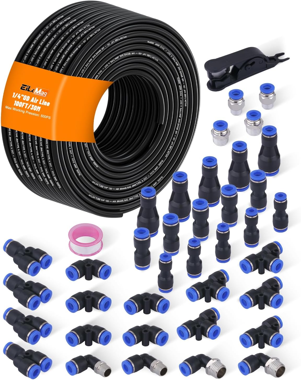118PCS AIR LINE TUBING KIT: Package includes 32.8FT(10M) 1/4" tube OD DOT air line, 32.8FT(10M) 3/8" tube OD DOT air line, 16pcs Male Straight Unions, 16pcs Male Elbows, 14pcs Straight Unions, 6pcs Elbows, 8pcs Tees, 6pcs Splitters, 8pcs Hex Head Bushing, 8pcs Cap Plug Fitting, 10pcs Cap Blanking Plug, 20pcs sleeves ferrules, 1pc 1/4 inflation schrader value, 1pc tube cutter, 1pc Teflon tape
