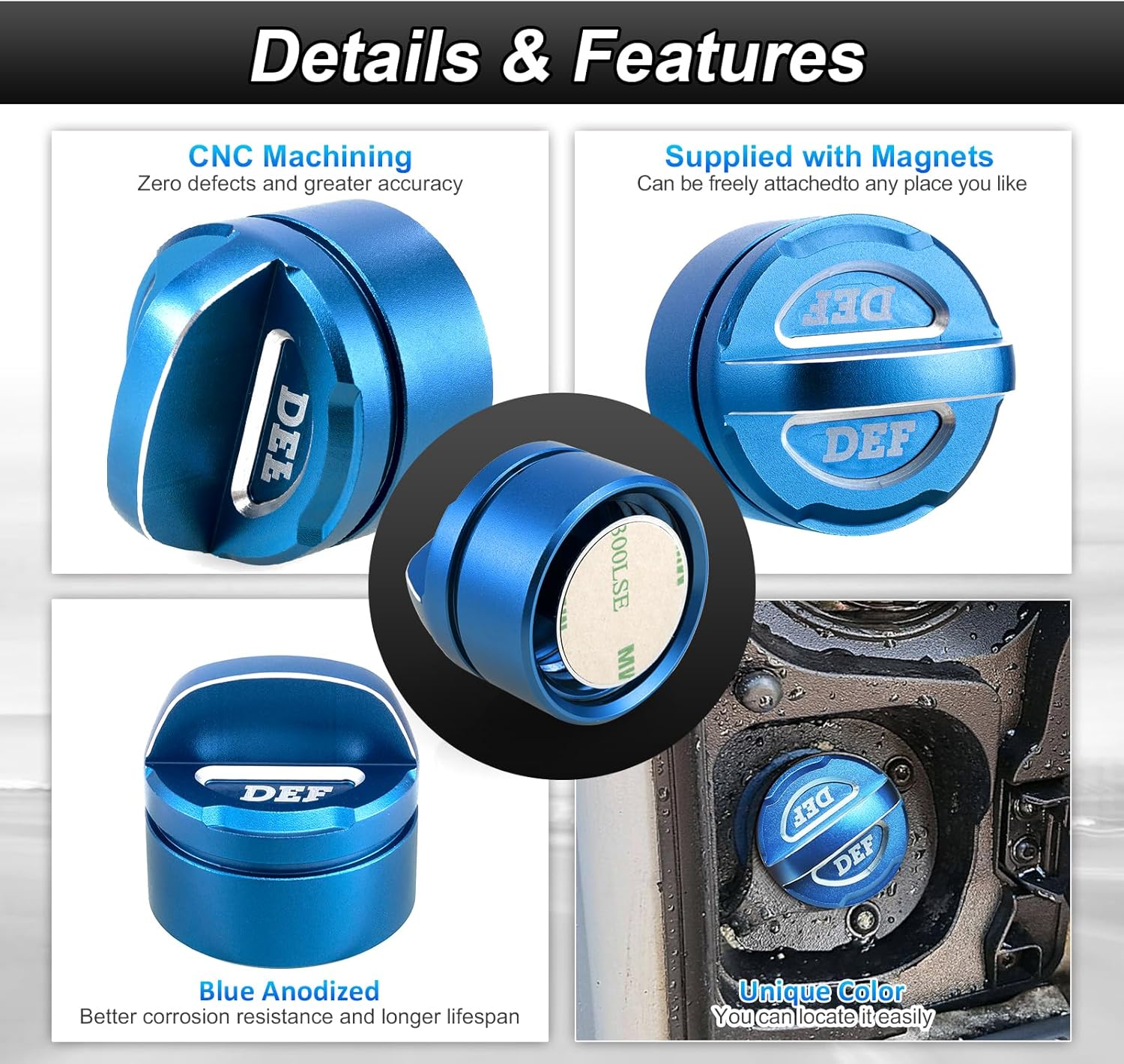 Fitment List Fit Ford F150 DIESEL 2018 Fit E350/450 Super Duty DIESEL 2010 Fit F250/350/450/550 Super Duty DIESEL Fit F650/750 DIESEL 2010-2012 Fit Transit 150/250/350/350 HD DIESEL 2015-2019 Fit Transit (Mexico) DIESEL 2015-2016 Fit Transit (Mexico) DIESEL 2018-2020 Fit Transit Custom (Mexico) DIESEL 2017-2020 Specifications Item: DEF Cap Material: 6061 Aluminum Color: Blue Package Included 1 x DEF Cap