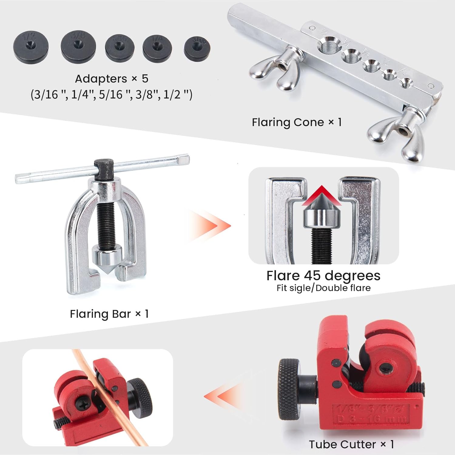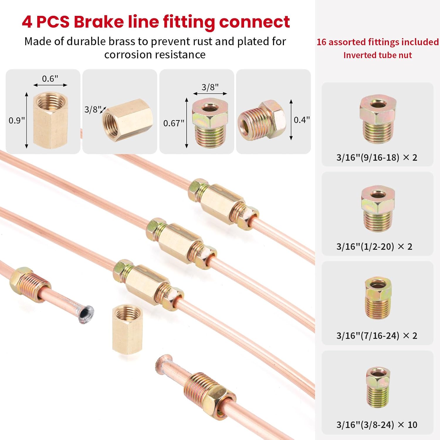 | Included Components | 25 ft 3/16 Copper Coated Brake Line Kit (Includes 16 Fittings and 4 Unions Brake Line Fittings) + Double & Single Flaring Tool Kit |