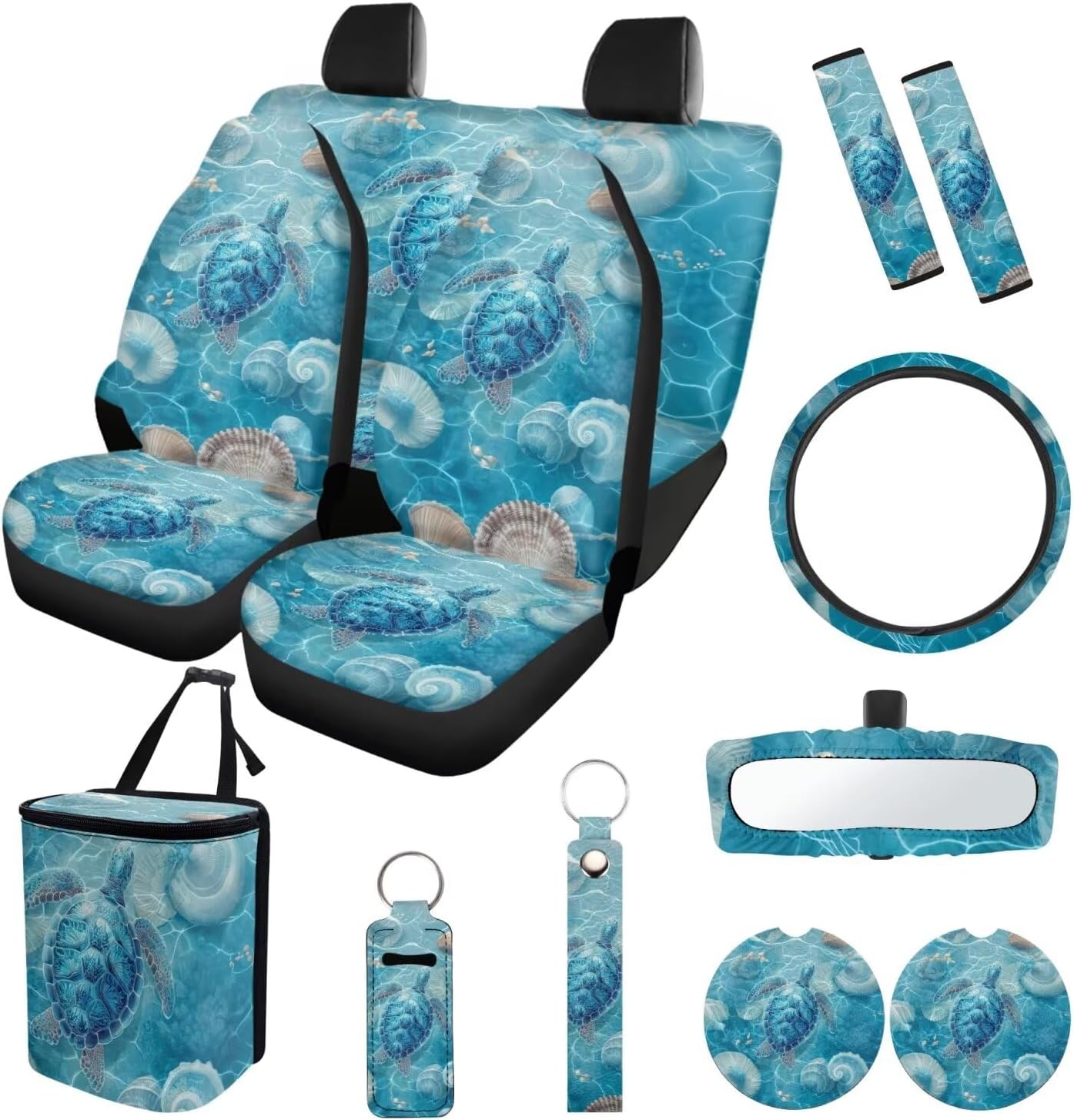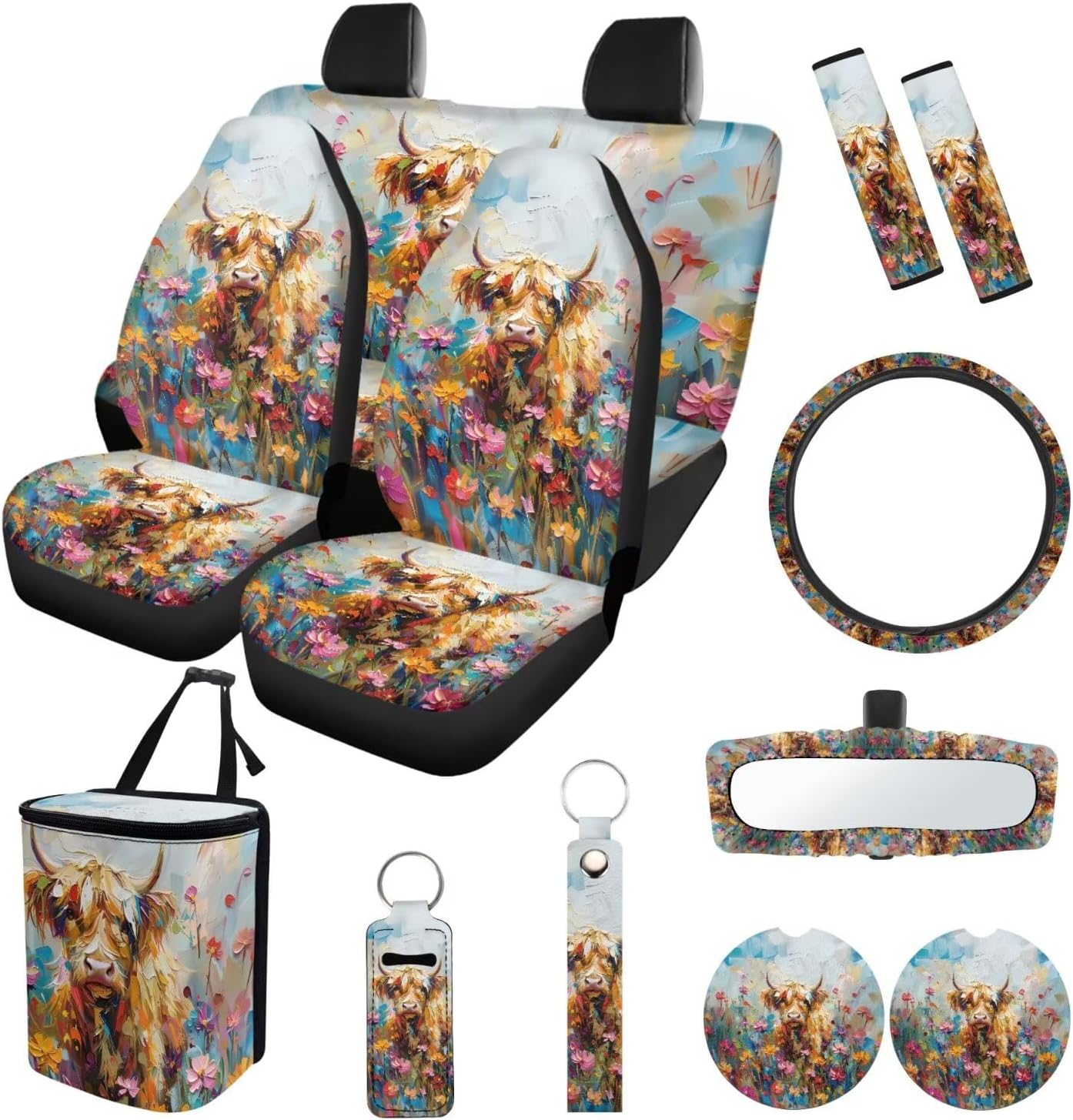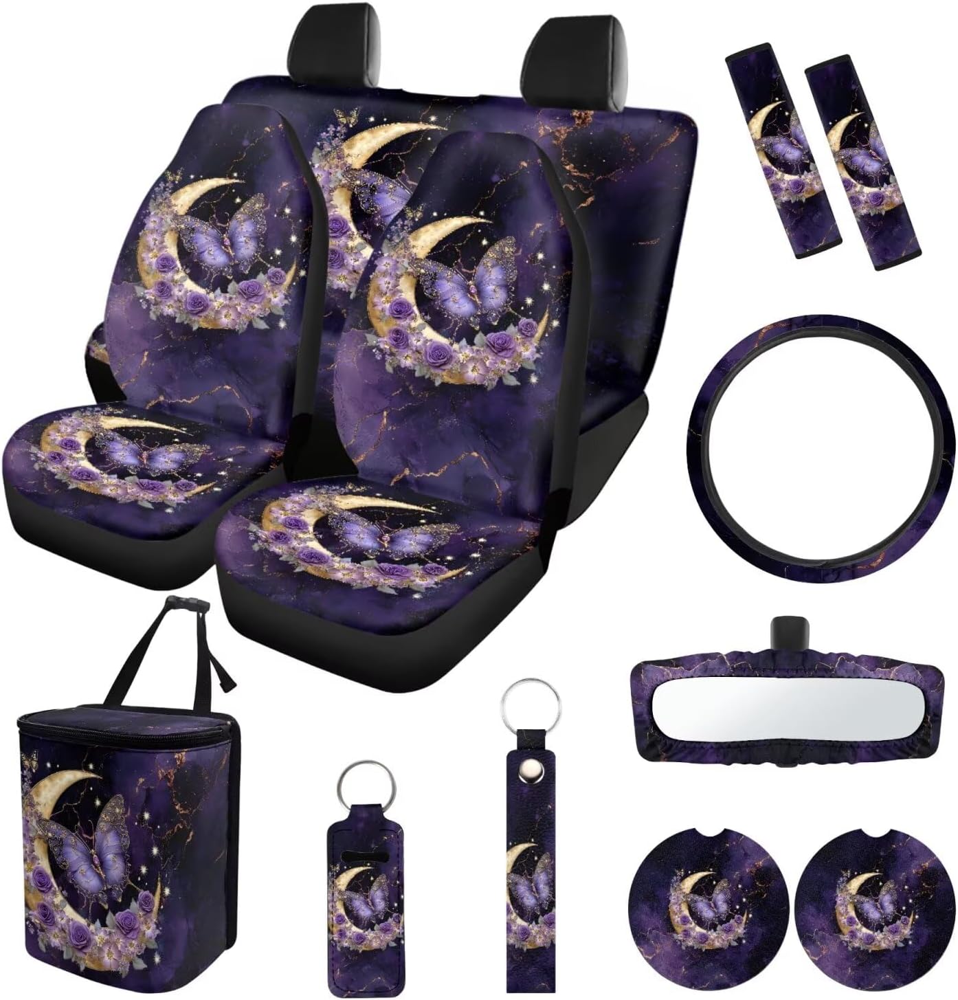 Upgrade your car interior with this comprehensive Car Accessories Set of 13. It includes everything you need to transform your vehicle's look while ensuring cleanliness and comfort. The set features 2 front seat covers, 1 rear backrest cover, 1 rear bottom bench cover, 1 steering wheel cover, 2 seat belt pads, 1 rear view mirror cover, 1 car trash can, 2 car coasters, and 2 key chains. Designed to fit most cars, trucks, sedans, and SUVs, these seat covers are easy to install and remove without the need for any tools. The soft and breathable polyester material offers a pleasant sitting experience, keeping you cool and comfortable during your drive. The covers are water-absorbent, elastic, and durable, ensuring long-lasting performance. Not only do these car accessories enhance the appearance of your vehicle, but they also provide practical benefits. They protect your seats from cuts and scratches caused by pets, and they prevent dust accumulation, keeping your car interior clean and tidy. With their unique and stylish patterns, these car accessories add a touch of beauty to your car's interior. They create a relaxed and cozy atmosphere, making your driving experience even more enjoyable. This set makes a great gift for special occasions such as Valentine's Day, birthdays, or as a surprise gift for your family, friends, or colleagues. Upgrade your car's style and functionality with this all-inclusive Car Accessories Set of 13. Order now and enjoy the benefits of a clean, comfortable, and beautiful car interior.