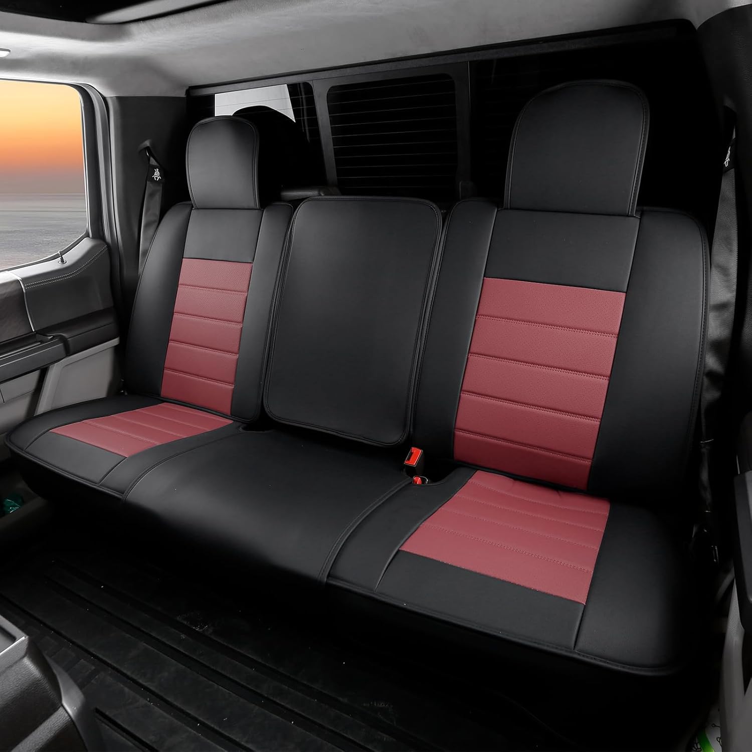 IKON MOTORSPORTS CAR SEAT COVERS are the perfect accessory for those vehicle owners needing an extra layer of protection for their vehicle seating. A much needed accessory to prevent scratches, damage or spills from ruining the seat surface for the family road trip warriors or pet car ride companions. ITEM SPECIFICATION: Fitment: Fits 2009-2025 Ford F150 Crew Cab Color: Black, Red Material: Leather, PU - Polyurethane Package Includes: 1x Full Set of Seat Covers (Front + Rear, 5 Seats) ITEM FEATURES: High grade materials protect the original car seat from damage; Tight fit to resist slippage even after extended use; Good water resistance and easy to clean.