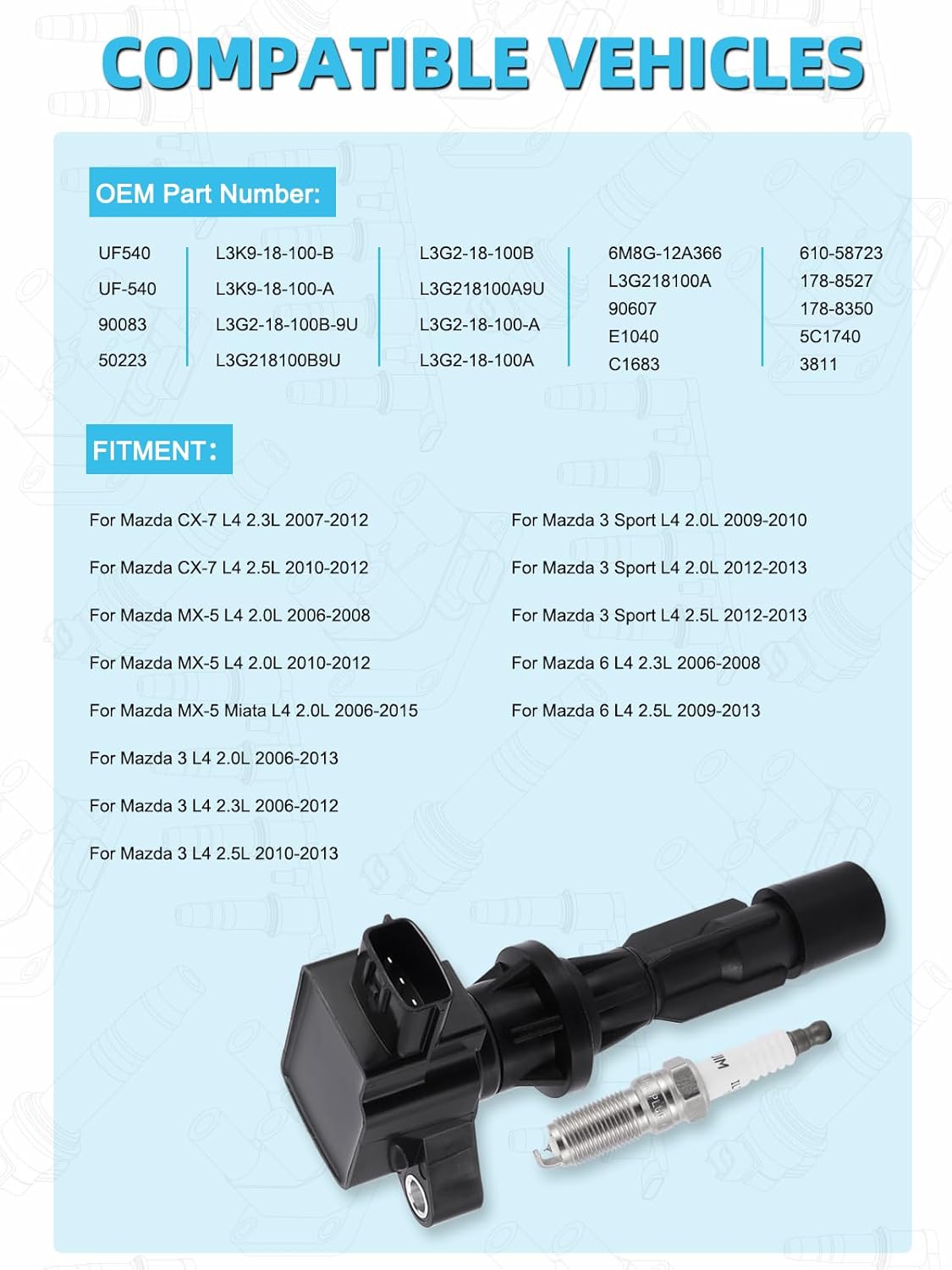 | Part Interchange Info | This ignition coil can be used as a direct replacement for the following OEM ignition coil part numbers on compatible Mazda vehicles: UF540, UF-540, 50223, L3K9-18-100-B, L3K9-18-100-A, L3G2-18-100B-9U, L3G218100B9U, L3G2-18-100B, L3G218100A9U, L3G2-18-100-A, L3G2-18-100A, L3G218100A, E1040, C1683, 6M8G-12A366, 610-58723, 5C1740, 178-8527, 178-8350. It can also replace the following OEM spark plug part numbers: 90083, 3811, 90607. |