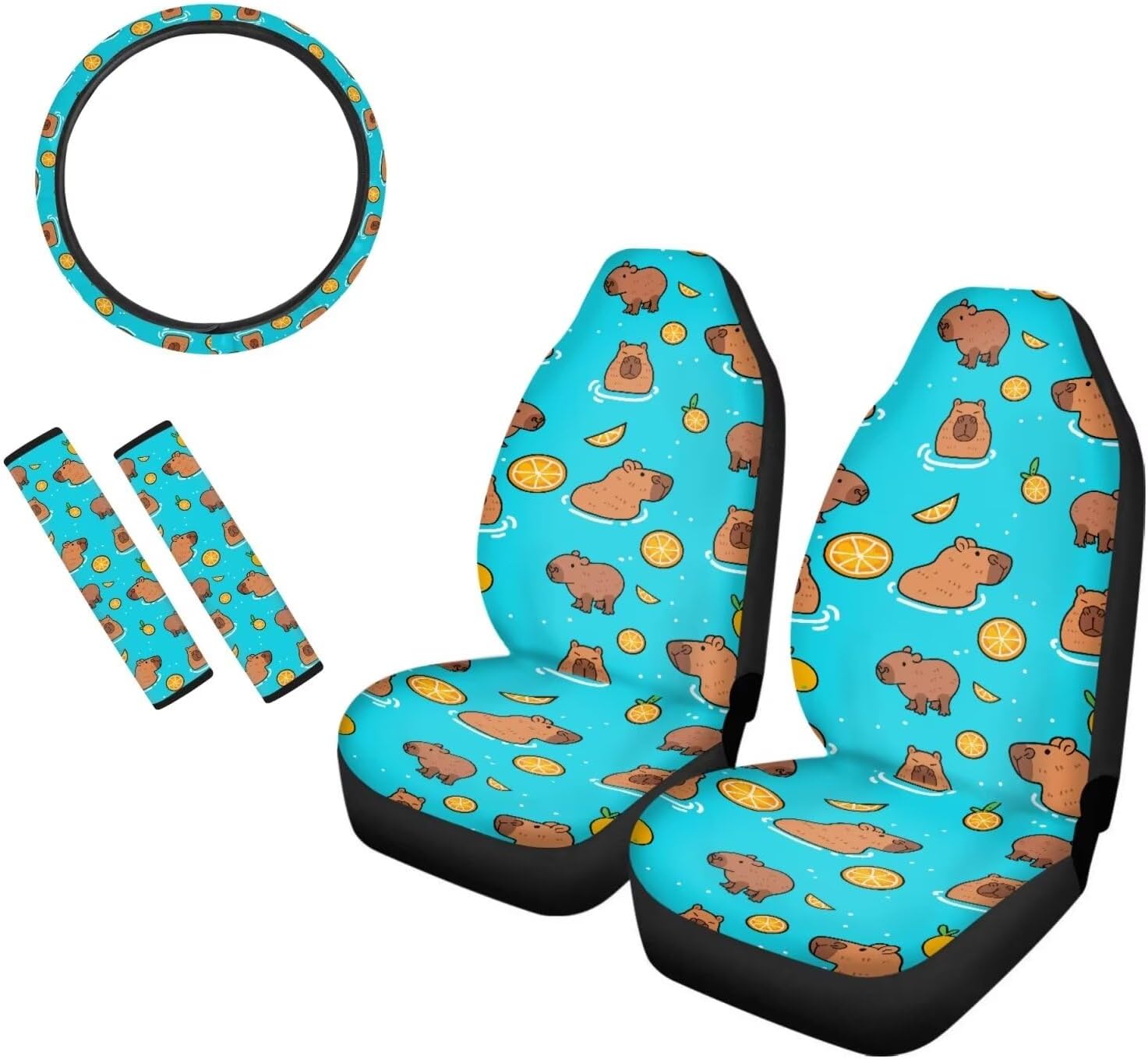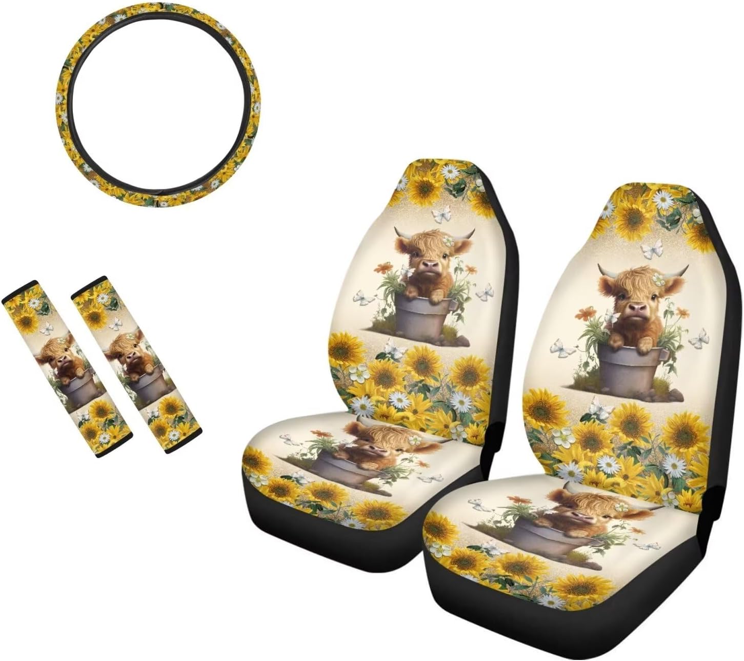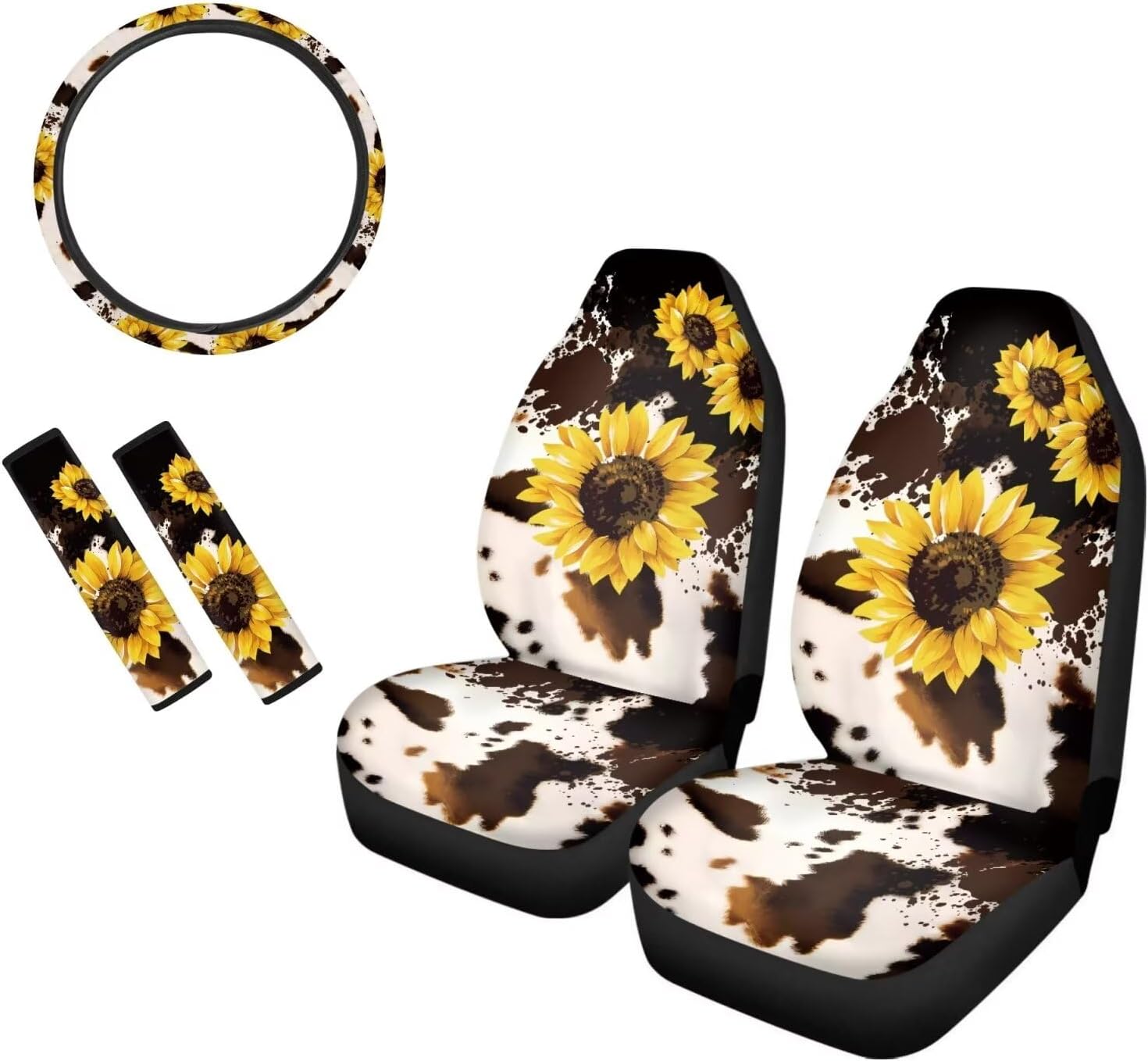 Package Include: Set of 2 front car seat covers + 1 Steering Wheel Cover + 2 Car Seat Belt Pad Universal: Compatible with 90% vehicles, fits for cars , sedan, trucks & suvs. Features of Car Seat Covers -Seat Covers can keep your interior looking new, cover existing damage. -Protect your cars seats from dirt and spills, UV rays, spills, kids, pets, tools, entry/exit friction, food, sweat, ect. -Easy to install and remove,machine washable. -Trendy and charming car interior deocrations. Great gifts for women, girls, friend and family. Features of Steering Wheel Cover -Protect the steering wheel cover and make it fashion looking. -Stretchable fabric with high-density good quality anti-slip backing. -Easy to install and washable. -High quality elastic banding with 100% tensil rate. Features of Car Seat Belt Pad -Great for protecting your shoulder and reducing the pressure from the safety seat belt. -Easy to install, use velcro for fixing the belt cover. -Provides comfort and helps relieve chafing. -Velcro closure, high grinding and abrasion resistant. Quality Guarantee: If you have problems, please email us firstly about your concerns. We commit to offer you the best product and service.