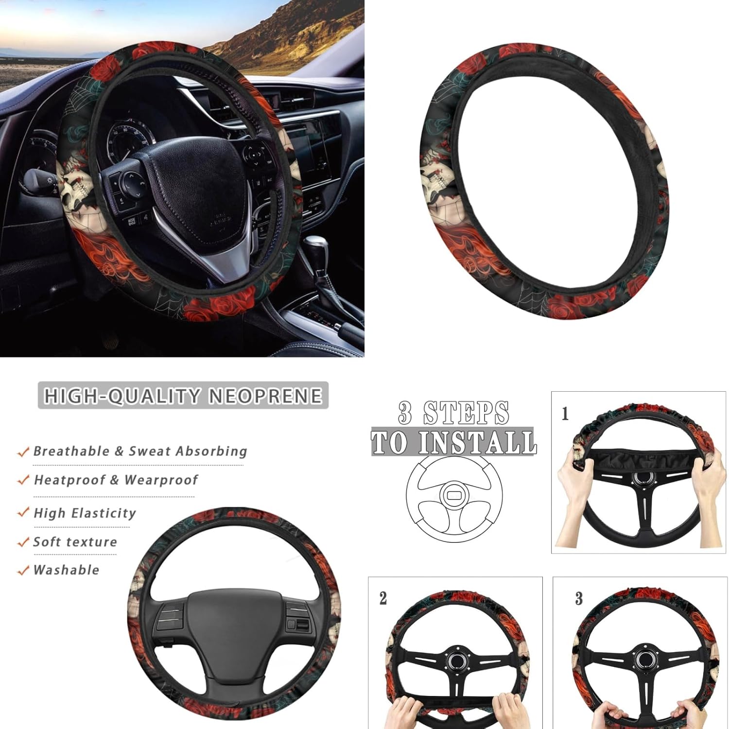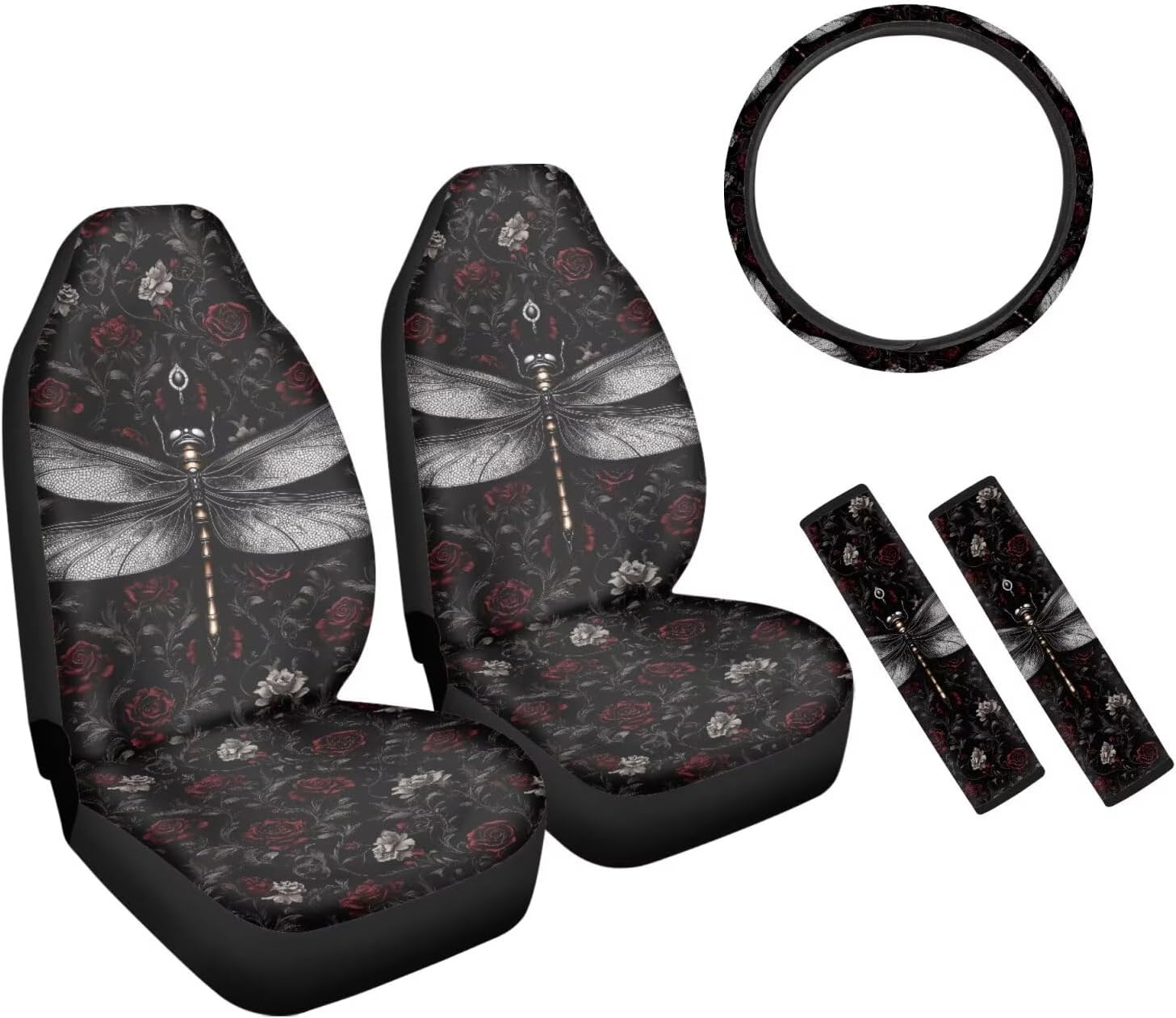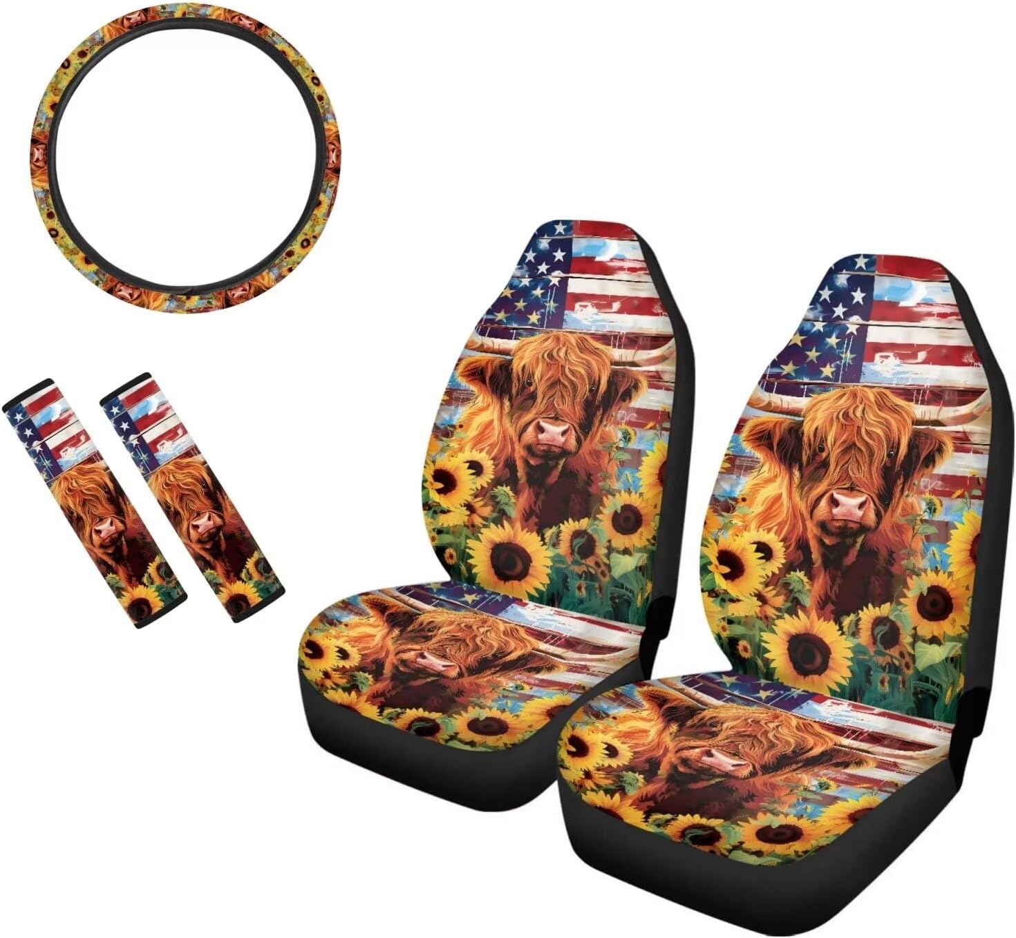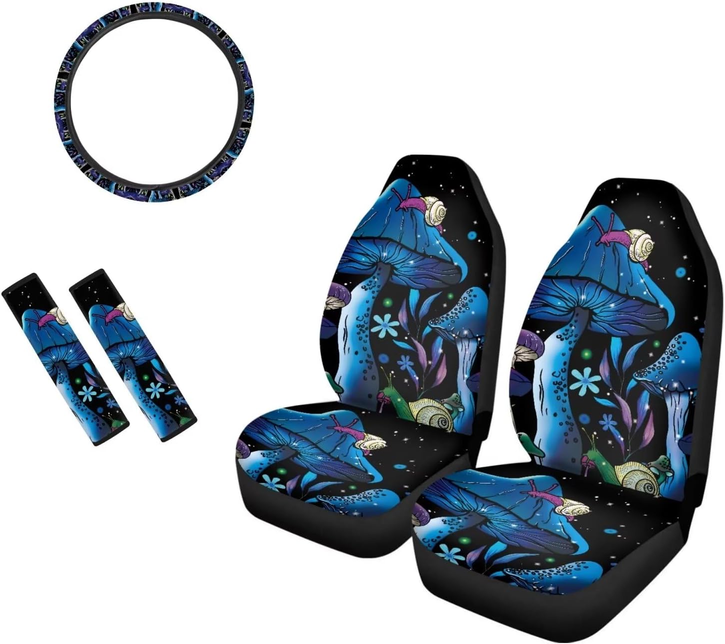 Package Include: Set of 2 front car seat covers + 1 Steering Wheel Cover + 2 Car Seat Belt Pad Universal: Compatible with 90% vehicles, fits for cars , sedan, trucks & suvs. Features of Car Seat Covers -Seat Covers can keep your interior looking new, cover existing damage. -Protect your cars seats from dirt and spills, UV rays, spills, kids, pets, tools, entry/exit friction, food, sweat, ect. -Easy to install and remove,machine washable. -Trendy and charming car interior deocrations. Great gifts for women, girls, friend and family. Features of Steering Wheel Cover -Protect the steering wheel cover and make it fashion looking. -Stretchable fabric with high-density good quality anti-slip backing. -Easy to install and washable. -High quality elastic banding with 100% tensil rate. Features of Car Seat Belt Pad -Great for protecting your shoulder and reducing the pressure from the safety seat belt. -Easy to install, use velcro for fixing the belt cover. -Provides comfort and helps relieve chafing. -Velcro closure, high grinding and abrasion resistant. Quality Guarantee: If you have problems, please email us firstly about your concerns. We commit to offer you the best product and service.