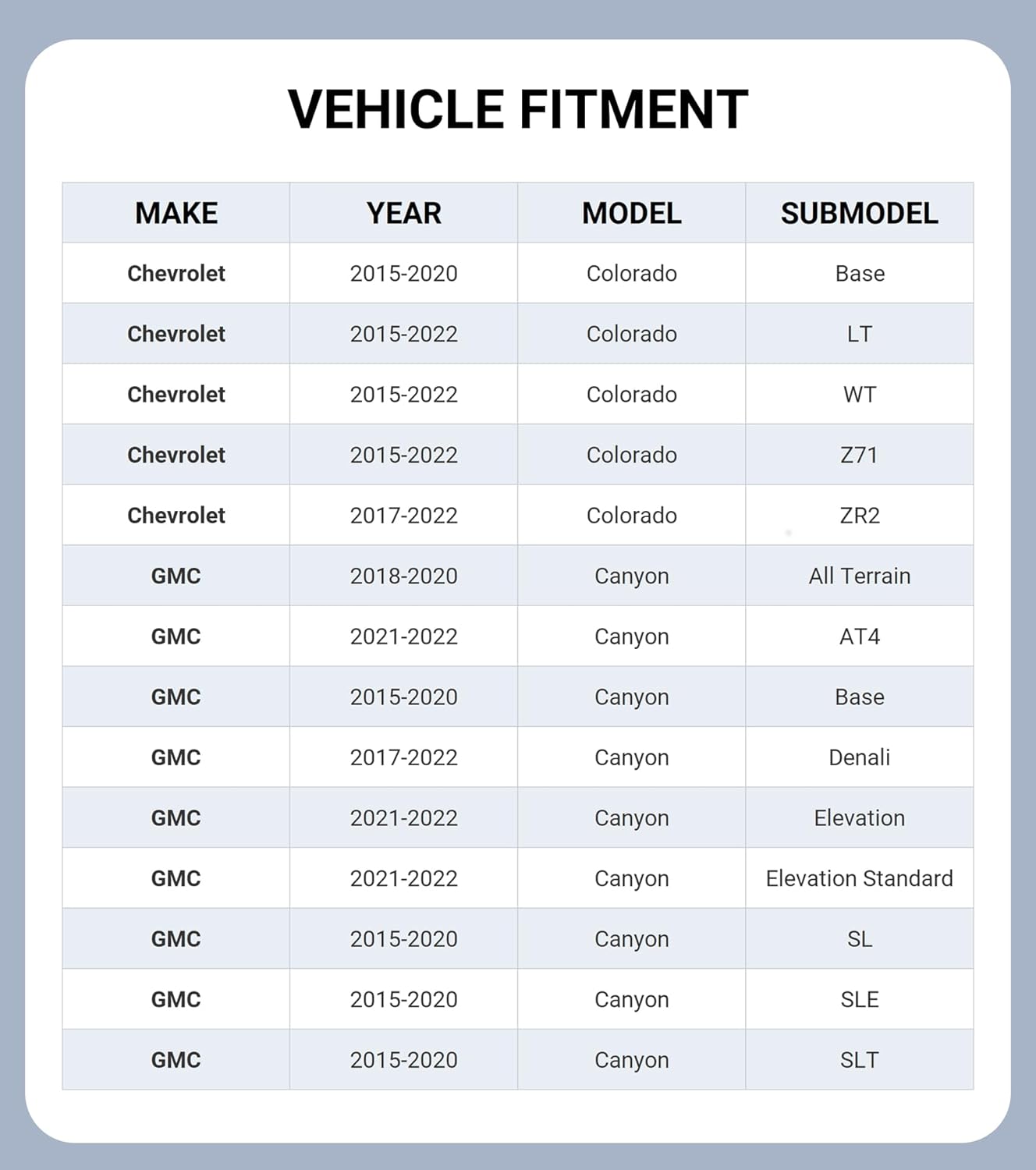 | Compatible with Vehicle Type | for Chevy Colorado 2015-2022, for GMC Canyon 2015-2022 |