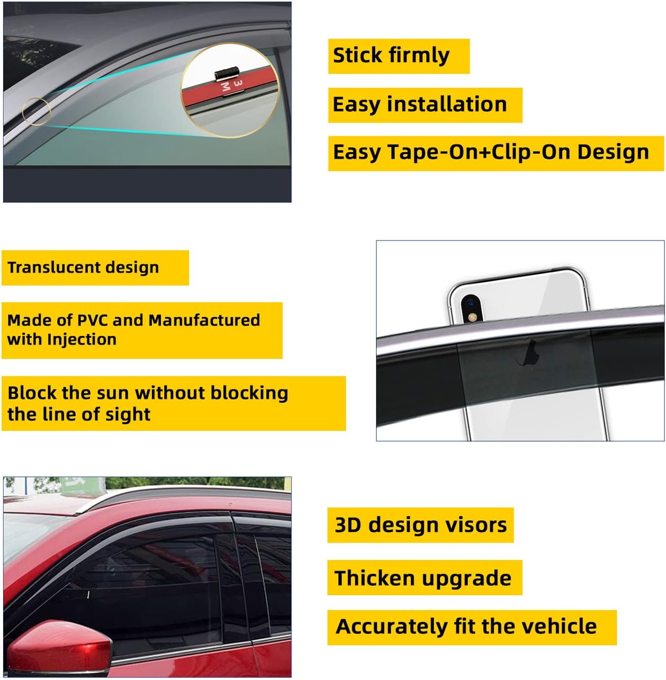 Warranty: We provide 6 months warranty on manufacturer defects. Features * 100% Brand new in box. * Fully window protected from sun shade, wind, rain, snow deflector. * Help reduce heat buildup in park vehicles by allowing air in when partially open. * Long lasting material designed to withstand the rigors of the elements. * Make it possible to leave the windows down a few inches to get fresh air even on rainy days. * Comes With Genuine 3M Automotive-Grade Double-Sided Tapes.Easy Installation. * Dramatically Improve Styling & Appearance.