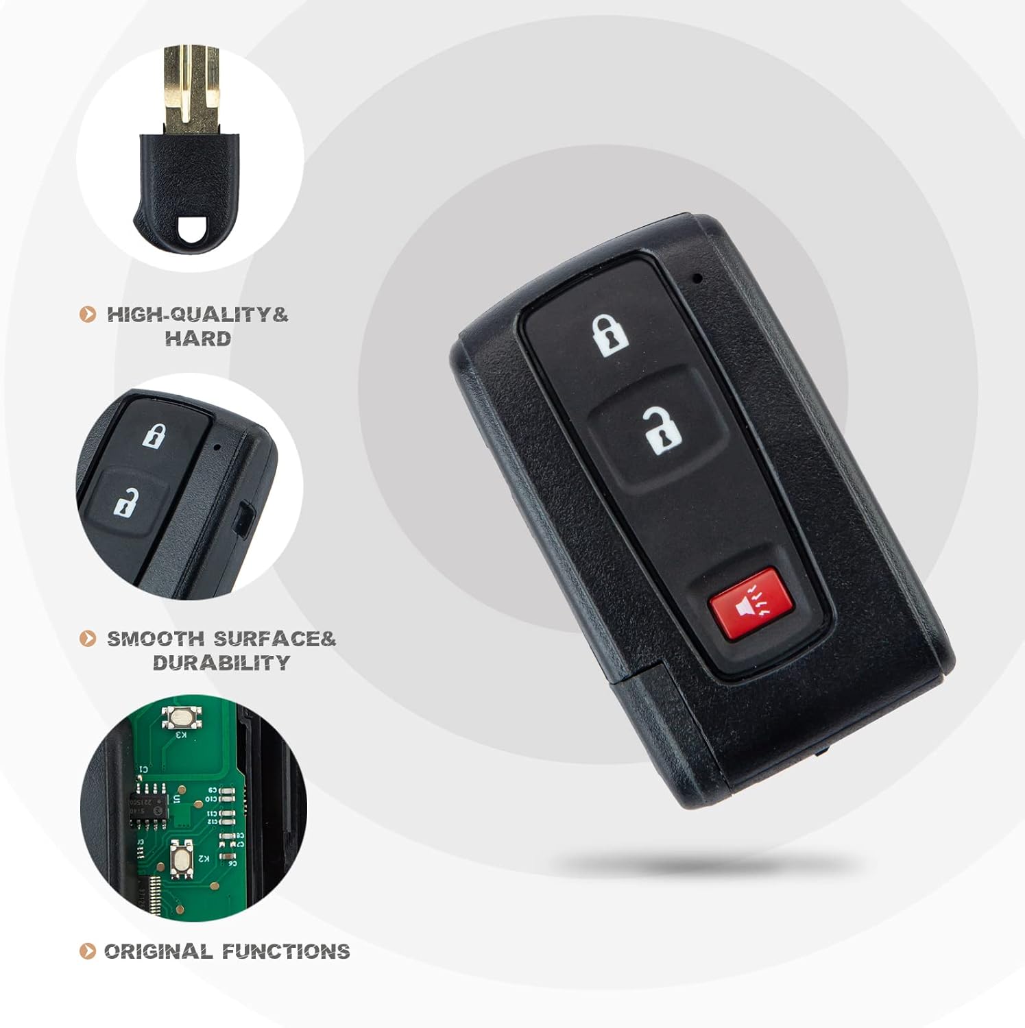 The Best Affordable Brand New Proximity Smart KeyUSAKeys provides you with brand new replacement for Proximity Smart Key remote for select vehicles, remote comes with a battery already installed in the device.We test every single remote before we send it to make sure it is transmitting and functioning just like the original one. Keep in mind: The original key must have EXACTLY the same buttons, for it to work.Compatible with:2004/2005/2006/2007/2008/2009 Toyota PRIUS---SILVER LOGO ONLYReplacement for:FCC ID: MOZB31EG 315 MHz CHIP:4D-70E