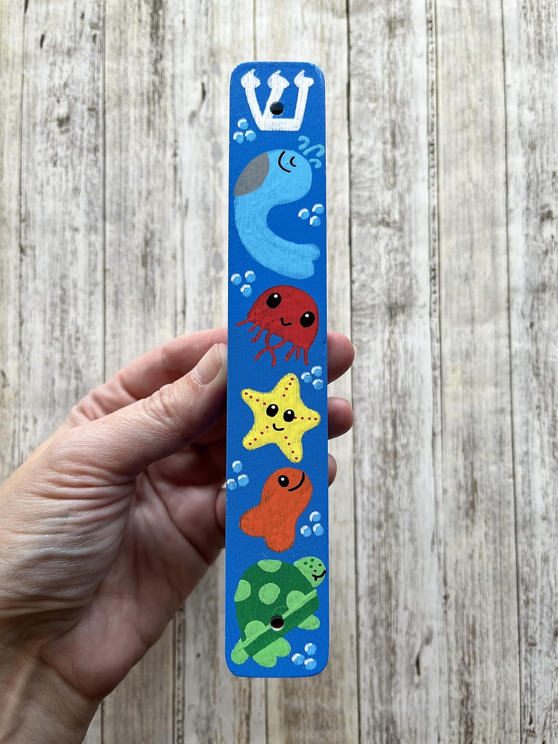 A mezuzah makes a great gift for a Jewish baby naming, housewarming, wedding, bris, shower, children's birthday or Hanukkah gift. This mezuzah features an adorable, hand painted sea creatures theme. DETAILS: ► Made out of a lightweight wood. ► Measures 6 inches in height and has a space for a 4 inch scroll (optional). ► Can be installed with screws through the top and bottom holes or it can be hung with double sided tape (not included).