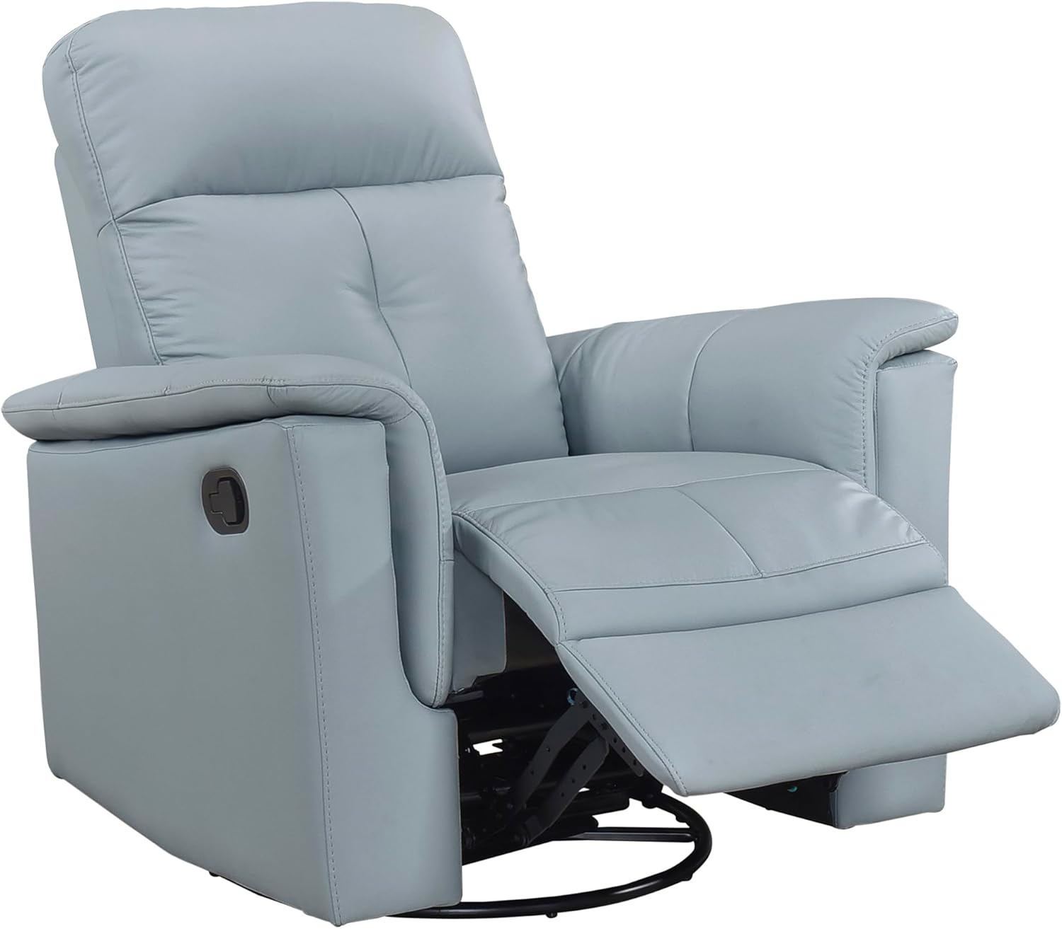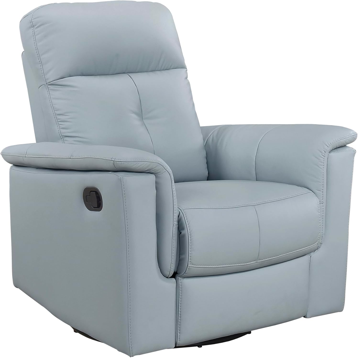 Experience ultimate relaxation with the Lexicon swivel glider reclining chair. Built with a solid wood and plywood frame reinforced with metal, this chair ensures lasting durability. High-density foam padding over pocket coils provides exceptional comfort, while the luxurious 100% top-grain leather where the body touches and faux leather upholstery on other areas adds elegance and durability. The attached back and seat cushions offer a seamless look, and the convenient tab pull reclining motion allows you to adjust the chair to your preferred angle. Enjoy smooth 360-degree swivel and gentle gliding motions for added comfort and versatility. Perfect for living rooms, family rooms, or reading corners, this recliner is designed to offer both style and functionality.