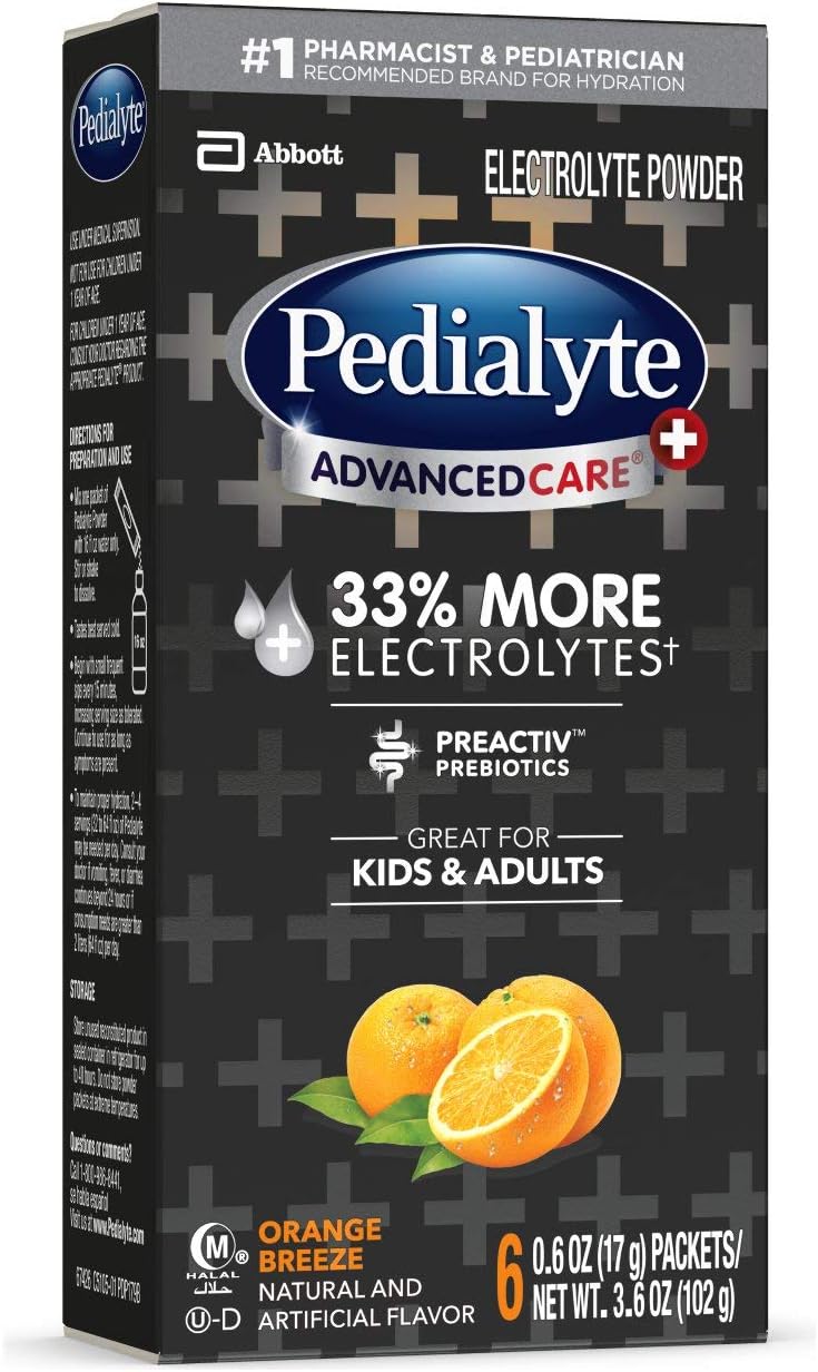 Pedialyte AdvancedCare Plus electrolyte powder packets have 33% more electrolytes* than original Pedialyte. This electrolyte powder has PreActiv Prebiotics to help promote digestive health and immune support. When you’re dealing with dehydration† due to vomiting, diarrhea, or extreme sweating caused by excessive heat or prolonged exercise, try Pedialyte, the #1 doctor-recommended brand for hydration. It’s great for kids and adults. These hydration packets are a convenient, on-the-go option to help replace lost fluids and electrolytes so you can feel better fast. * 60 mEq sodium electrolytes per liter vs 45 mEq in original Pedialyte. † Mild to moderate dehydration. ‡ Pedialyte AdvancedCare Plus has 1380mg sodium and no more than 25g sugars per liter; leading sports drink has460mg sodium and58g sugars per liter.