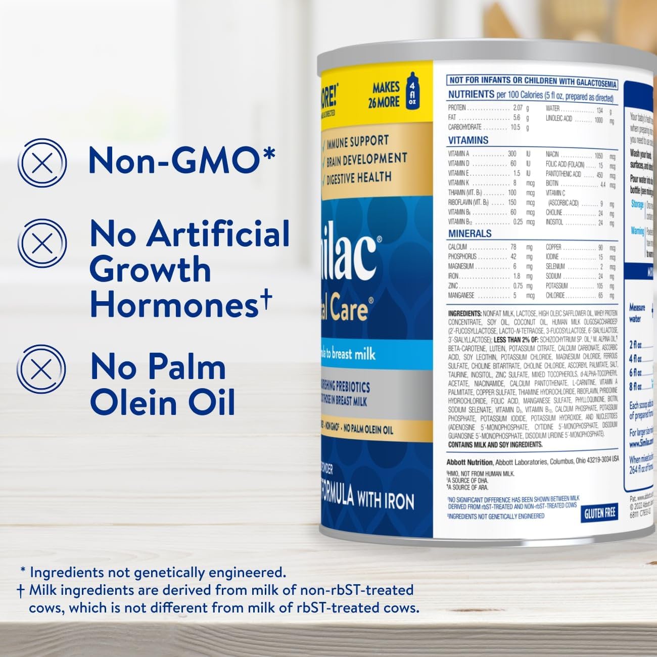 Similac 360 Total Care* infant formula is made with an exclusive blend of 5 HMO prebiotics structurally identical to those in breast milk. Our formula also has nutrition designed for immune support, brain development, and digestive health. Similac is the #1 brand fed in hospitals. Ingredients in Similac 360 Total Care have no artificial growth hormones† and are non-GMO.‡ * Not for infants or children with galactosemia. † No significant difference has been shown between milk derived from rbST-treated and non-rbST-treated cows. ‡ Ingredients not genetically engineered. § Offers may vary.