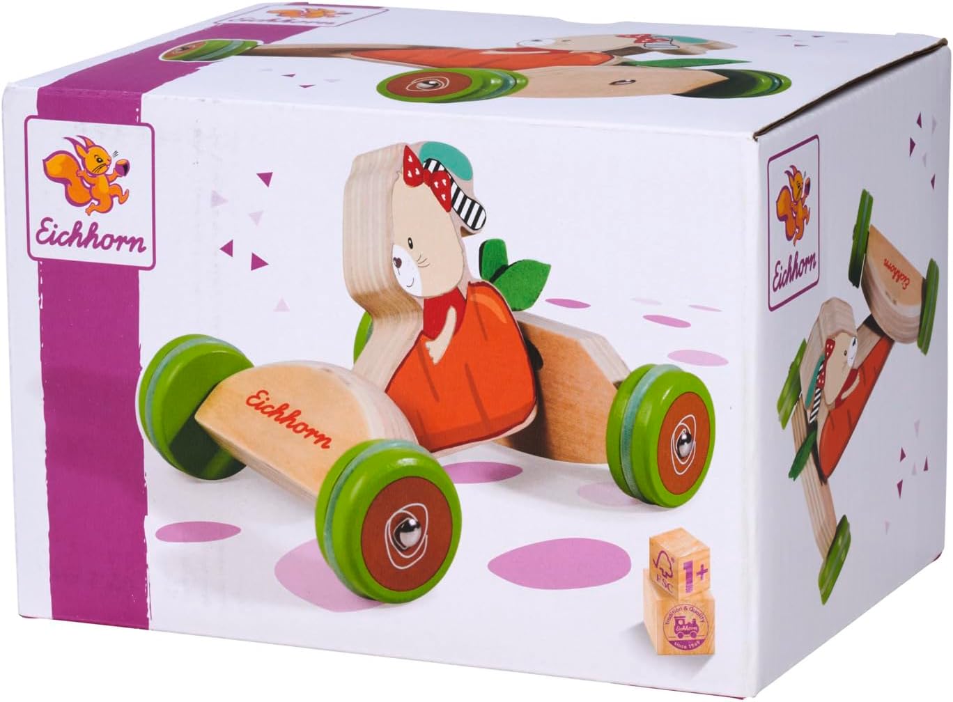 The high-quality birch wood push vehicle is perfect for small baby hands, the shape is comfortable to grip and push. The 16 cm large toy has a fun swivel function that allows the vehicle to be steered, and inspires little children's eyes with the cute rabbit carrot motif. The silicone tyres are silent and leave no marks. Only FSC® 100% wood from sustainable forestry is used for the production of the Eichhorn sliding vehicle. Suitable for children over 1 year old.