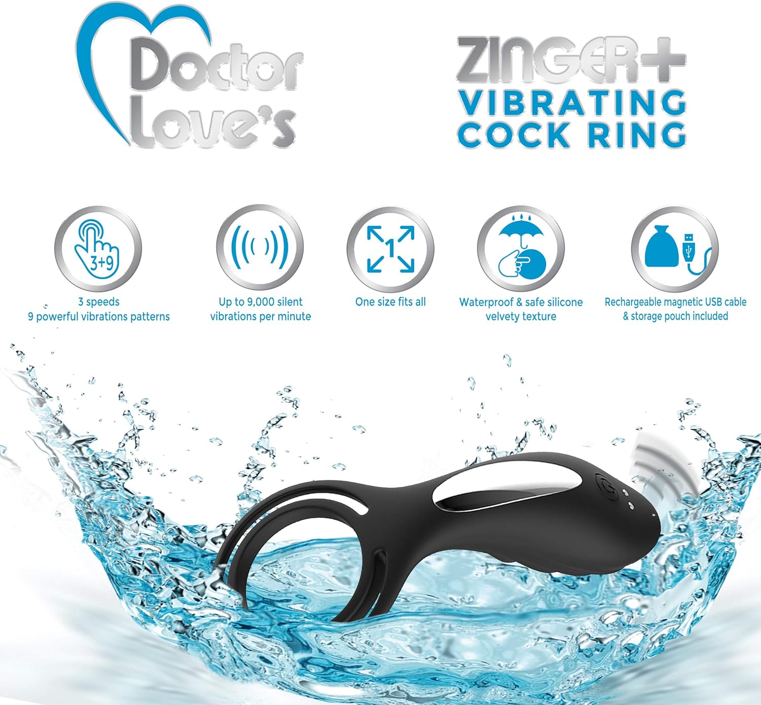 Doctor Love Zinger + Vibrating Rechargeable Cock Ring with Remote Control Black. 3 speeds of powerful vibration patterns. 9 powerful vibrations. Up to 9,000 silent vibrations per minute. One size fits most. Waterproof for play outside the bedroom. Silicone with a velvety texture. Made using body safe, latex free, phthalate free materials Silicone cock ring. Remote control ABS Plastic. Rechargeable via USB. Magnetic charge. Cable included. Includes a storage, travel pouch. Size 4.5 inches in total length by 2 inches in width. Inner ring diameter 1.5 inches.