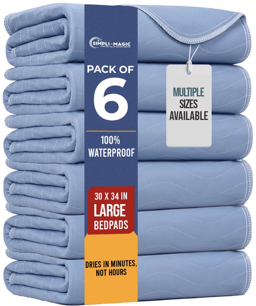 Simpli-Magic Washable Underpads, 34" x 36" (Pack of 6) - Heavy Absorbency Reusable Bedwetting Incontinence Pads for Kids, Adults, Elderly, and Pets - Waterproof Protective Pad for Bed, Couch, Sofa, Floor