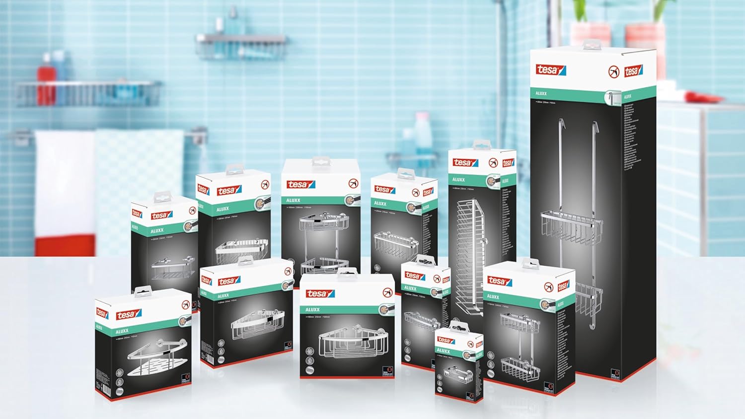 tesa Aluxx wide shower storage caddy - adhesive glue solution, chrome-plated aluminium, round style When you think of mounting bathroom accessories reliably, you think of drilling, dirt and noise. But there is a powerful alternative: the tesa Power.Kit adhesive glue technology which doesn’t require drilling. With it, the tesa wide shower storage caddy can be mounted without any damage to walls or tiles. After 12 hours, the bond is rock solid. * The packaging provides everything needed for application, so no other tools are necessary. * The wide shower storage caddy is swiftly removable without a trace at any time. * Only a new adapter BK43-2 is required to remount it in another location. * The tesa Power.Kit glue technology is long-lasting and powerful. The attractive grid design of the tesa Aluxx wide shower storage caddy, along with the curved strip bracket and round wall plates, creates a timeless look that will be at home in your shower compartment. As the chrome finish is waterproof and stainless, it will continue to shine for a long time. Effortless fastening 1. Use the included cleaning tissue to thoroughly clean the surface. Let it dry. Otherwise, the adhesive glue's strength may be reduced. 2. Connect the adapters and secure them with the cap heads. Remove the protective films and stick the adapters to the wall. 3. Detach the basket. For each adhesive, Fill adhesive glue into the large hole until it starts showing up in the small hole. 4. Give the adhesive 12 hours to set. Cover the adapters with the caps, apply the basket and secure it by screwing in the cap heads. Whenever you like, you can take the tesa Aluxx wide shower storage caddy down again. Remove the accessory from the adapters. Twist them off the wall with pliers. Remove left-over adhesive with a scraper. With the tesa Aluxx wide shower storage caddy, you can enjoy the many benefits of the tesa Power.Kit adhesive glue technology!