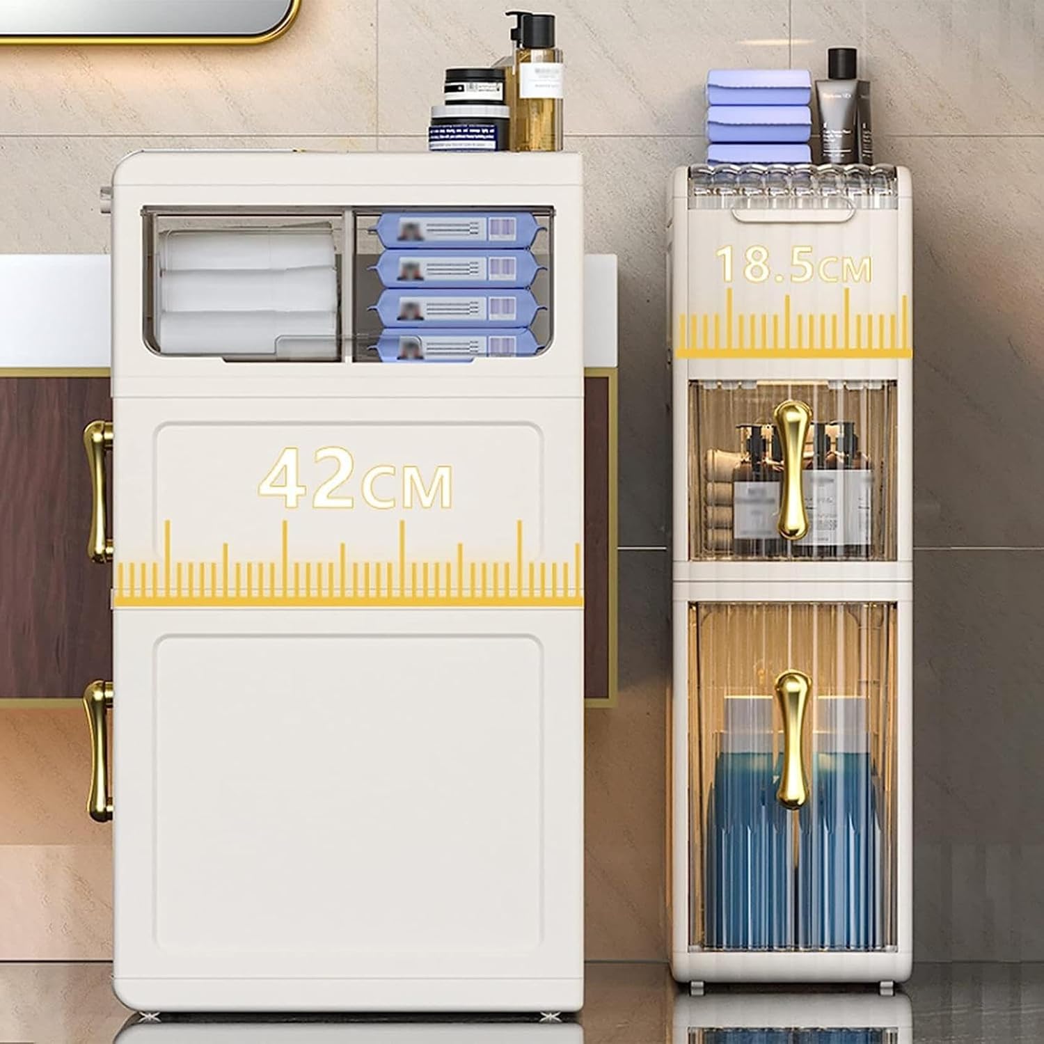 Home Furniture Storage Cabinet. Make Home More Attraction and Different, Thin Toilet Vanity Cabinet is a fantastic addition to any household. This beautiful piece of furniture has a universal look allowing it to match any preexisting decor, it will look fabulous in any home office, family room, living room or playroom. Drawer Cart Storage Tower Features: 1. Storage drawers of different sizes are convenient for sorting and storing items. 2. There are recessed armrests on the outside of the drawer, which is labor-saving and convenient to extract. 3. Fully enclosed, dust-proof and splash-proof, high-quality PP is easy to clean. 4. The ultra-thin bathroom cabinet has an extra paper pumping design, please pay attention to the size of the toilet paper. 5. Stable structure and light weight,with casters,easy to carry. 6. Not only can be used as an ultra-thin bathroom cabinet, but also can be used as a side table and bedside table in bedrooms, living rooms, kitchens. Product Specifications: Name: Multifunctional Slim Storage Tower Type: 2 Tier,3 Tier,4 Tier Material: Plastic Color: White Overall Size: 57.5x42.5x18.5cm(22.6×16.7×7.3inch),76.5x42.5x18.5cm(30×16.7×7.3inch),95x42.5x18.5cm(37.4×16.7×7.3inch) Weight: 3kg,4kg,5kg Package include: 1 x Toilet Tissue Storage Tower