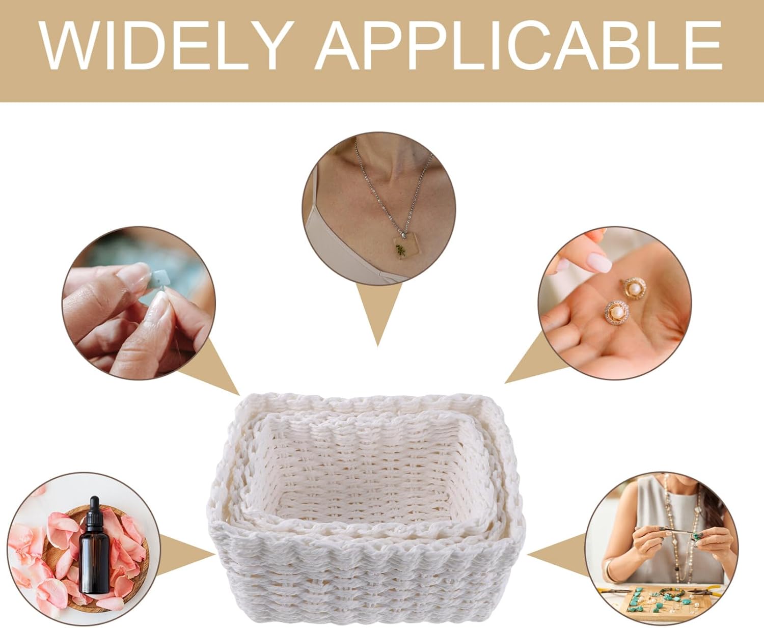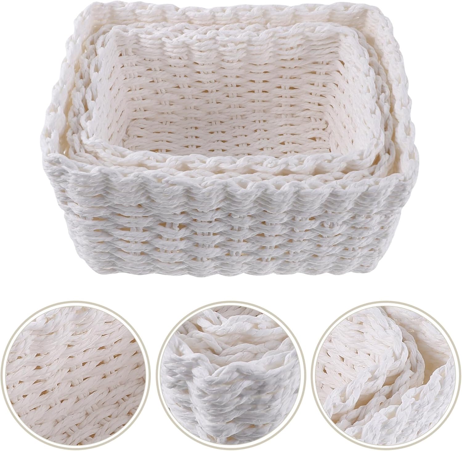 DescriptionThis paper rope woven basket has a minimalist design, round shape and a stylish aesthetic that fits seamlessly into home decor. Decorative baskets can help you organize and keep your room organized, and keep it clean better, and can bring much help for your home.FeaturesColor:WhiteMaterial:Paper stringSize:25.50X19.50X13.50cm /10.02X7.66X5.31in(L)Size:23.00X16.50X12.00cm /9.04X6.48X4.72in( )Size:21.00X15.00X11.00cm /8.25X5.89X4.32in(S)- Large capacity: The woven baskets set has a large capacity, can hold of items, and is suitable for families.- Practical and convenient: The baskets are easy to access and take out items, making it easy to find what you need.- placing on the counter or toilet tank and are toilet paper, toiletries, perfume and more.- In shape, these woven baskets can bring a elegant look to any space, both practical and decorative.- Use our storage basket to virtually any room in your house, simplicity and rustic style makes this basket elegant.Package Including1 pcs x L paper rope basket1 pcs x paper rope basket1 pcs x S paper rope basket