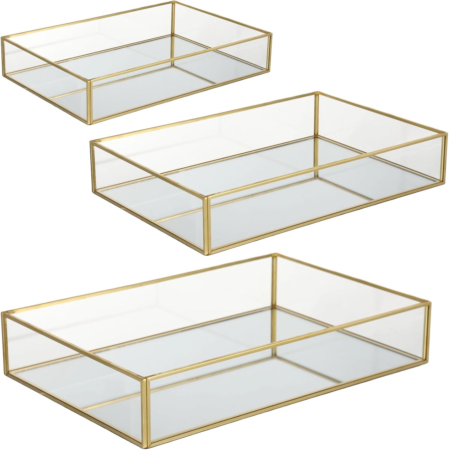 3 PCS Mirror Glass Vanity Tray Set, Golden Metal Edge Decorative Dresser Trays with Velvet Bottom, 3 Sizes Rectangular Makeup Perfume Jewelry Organizer for Bedroom Bathroom