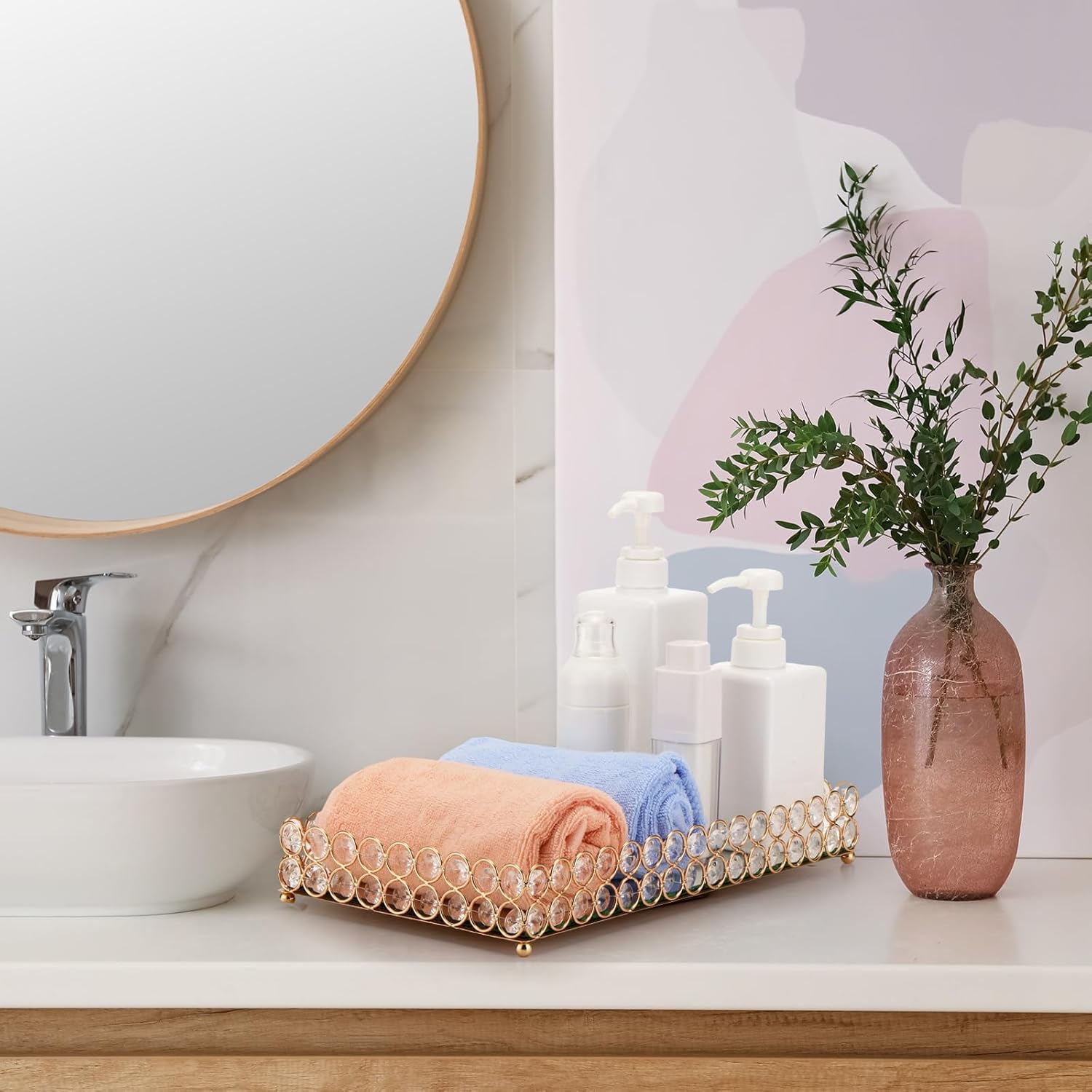 Features: The perfumes holder tray can be served as a novel ornament placed on the table top, dresser, sink, vanity, and anywhere you like, making your home more modern and beautiful. Of course, you can use the mirror tray for perfume to keep your perfume and makeups organized, convenient for you to take, a good addition for bedroom, bathroom or dressing room. Specifications: Material: gold plated metal and handmade quality crystal Color: gold Size: about 13.8 x 7.9 x 2.4 inches/ 35 x 20 x 6 cm, 11.8 x 7.9 x 2.4 inches/ 30 x 20 x 6 cm and 9.8 x 5.9 x 2.4 inches/ 25 x 15 x 6 cm Package includes: 3 x Perfume trays for vanity Notes: Manual measurement, please allow slight errors on size. The color may exist a slight difference due to different screen displays.