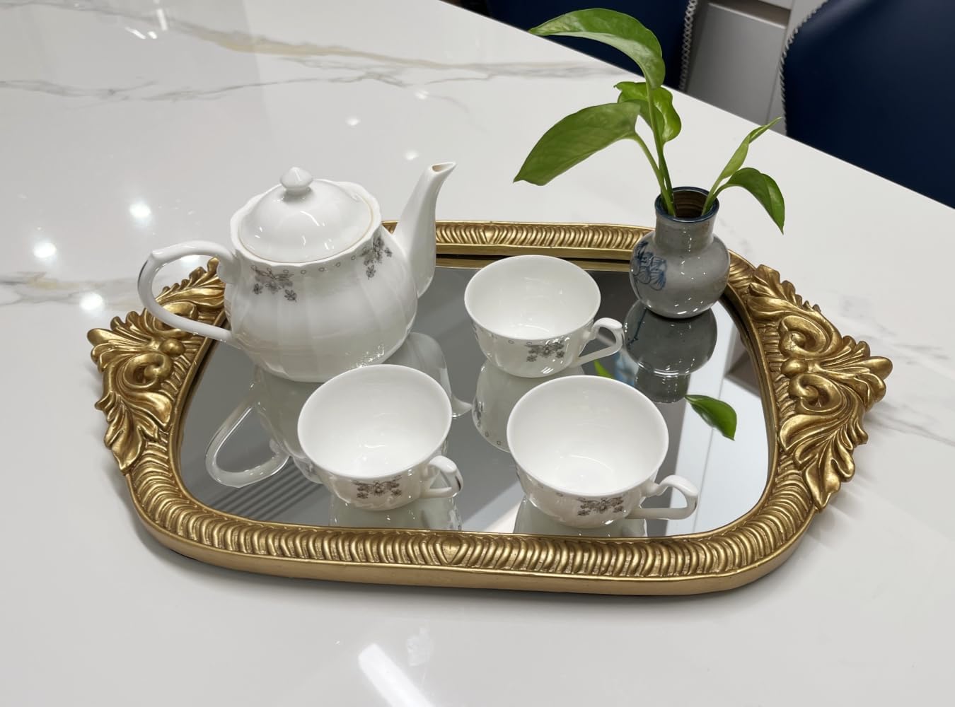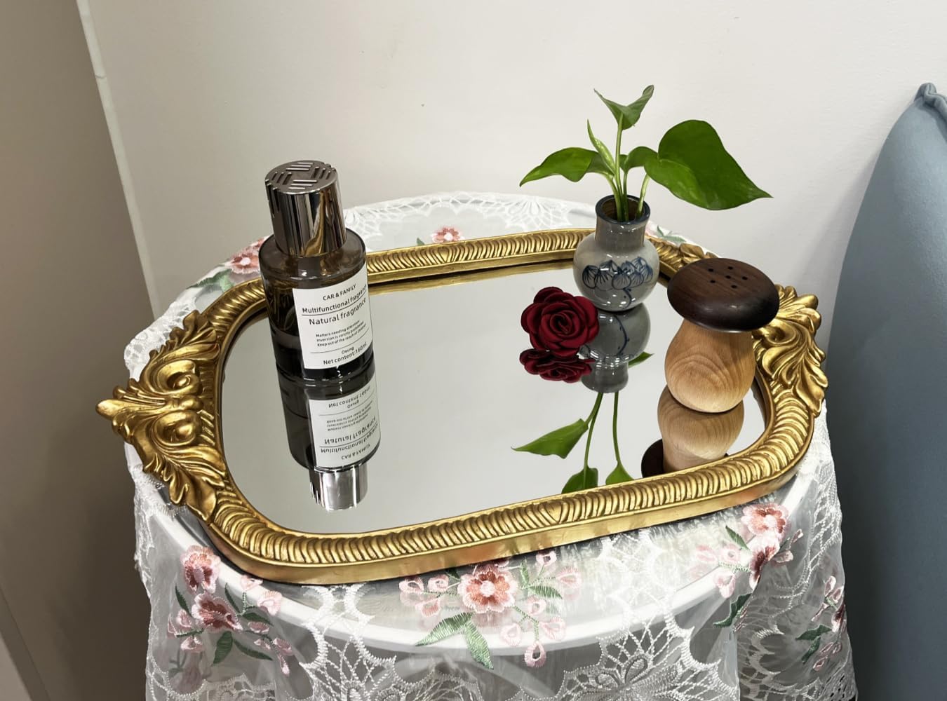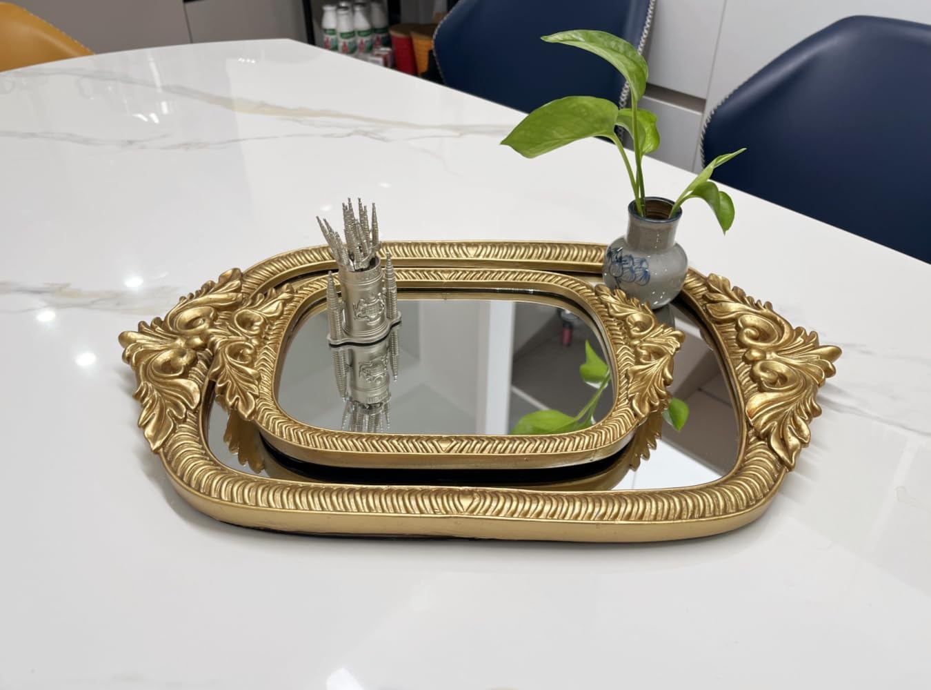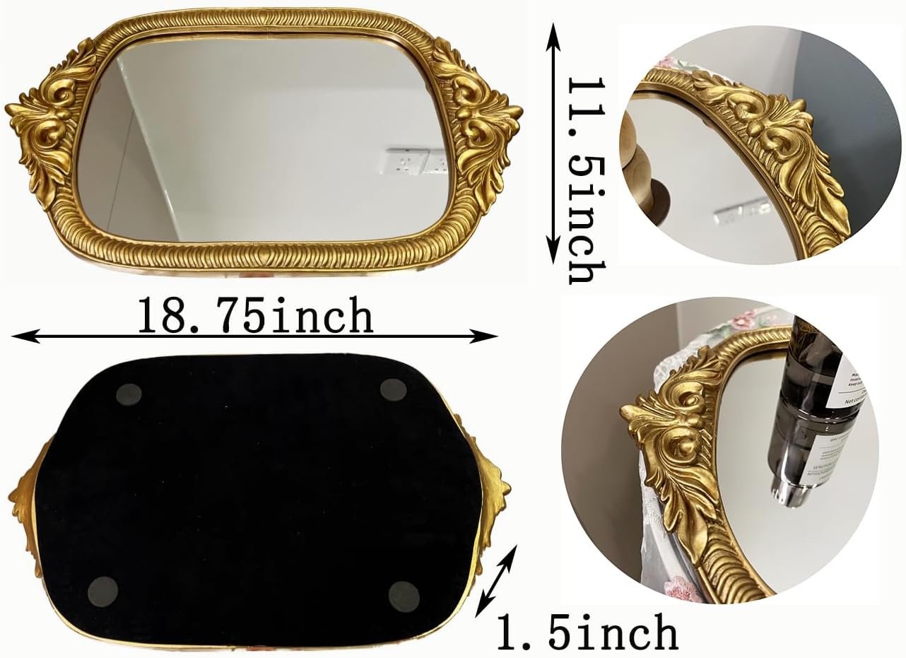 This large vintage gold mirror tray is perfect for those who need extra space to organize their beauty essentials or display decorative items. The high-definition mirror provides clarity and elegance, while the handcrafted resin frame in gold ensures durability. Measuring 18.75" x 11.5", this tray is ideal for larger spaces and adds a luxurious touch to your vanity, coffee table, or bathroom. Handmade craftsmanship guarantees that each tray is unique, making it a perfect gift for any occasion.