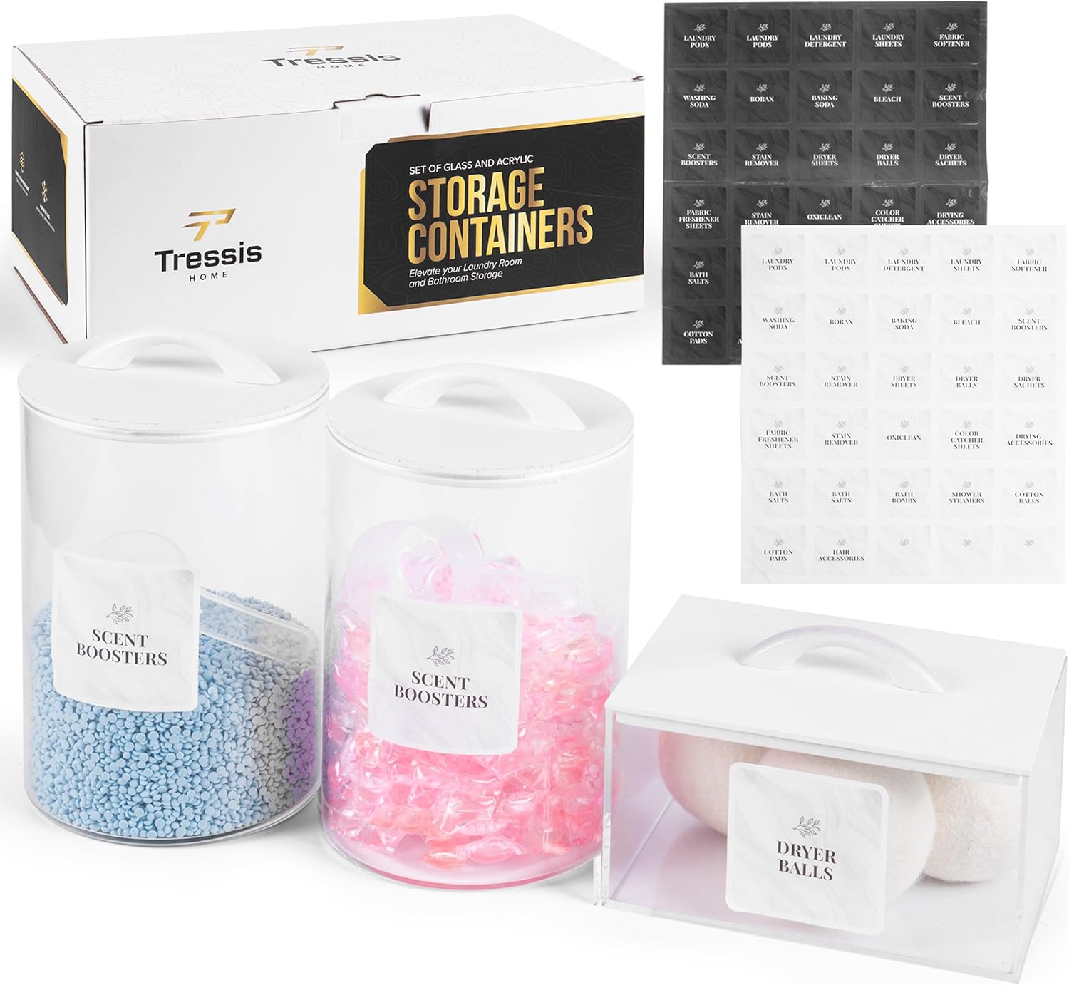 Laundry doesn’t have to be messy or boring. The Tressis glass laundry detergent dispenser set is designed to make your space feel organized, simple, and a little more stylish. Inside the box, you’ll find two large 3L glass jars for laundry room organization and one acrylic dryer sheet dispenser, each with a fitted lid. They’re the perfect size for pods, powder, scent boosters, or dryer sheets, finally giving everything a place. Think of them as storage jars with lids that actually look good on your counter or shelf. To make life easier, each set includes two scoops with etched measurement lines for quick, accurate portioning. Paired with the 3L glass jars, you’ll have a reliable laundry powder dispenser that looks as good as it works. The glass jars are dishwasher safe (because nobody has time for complicated cleanup). The laundry sheet holder and lids just need a quick hand wash. And since everything comes packed in a foam lined box, it’s just as ready to gift as it is to upgrade your own laundry room. With Tressis, a laundry storage organizer isn’t just about holding supplies, it’s about making everyday routines easier and your space a whole lot better looking.