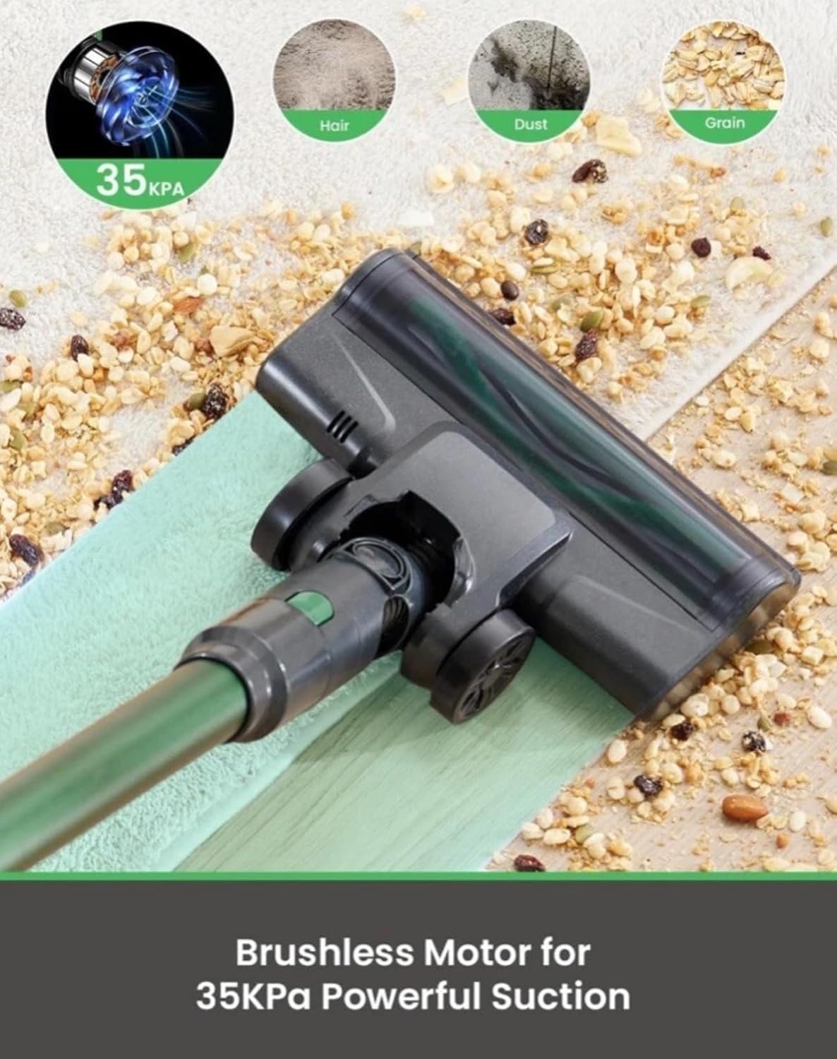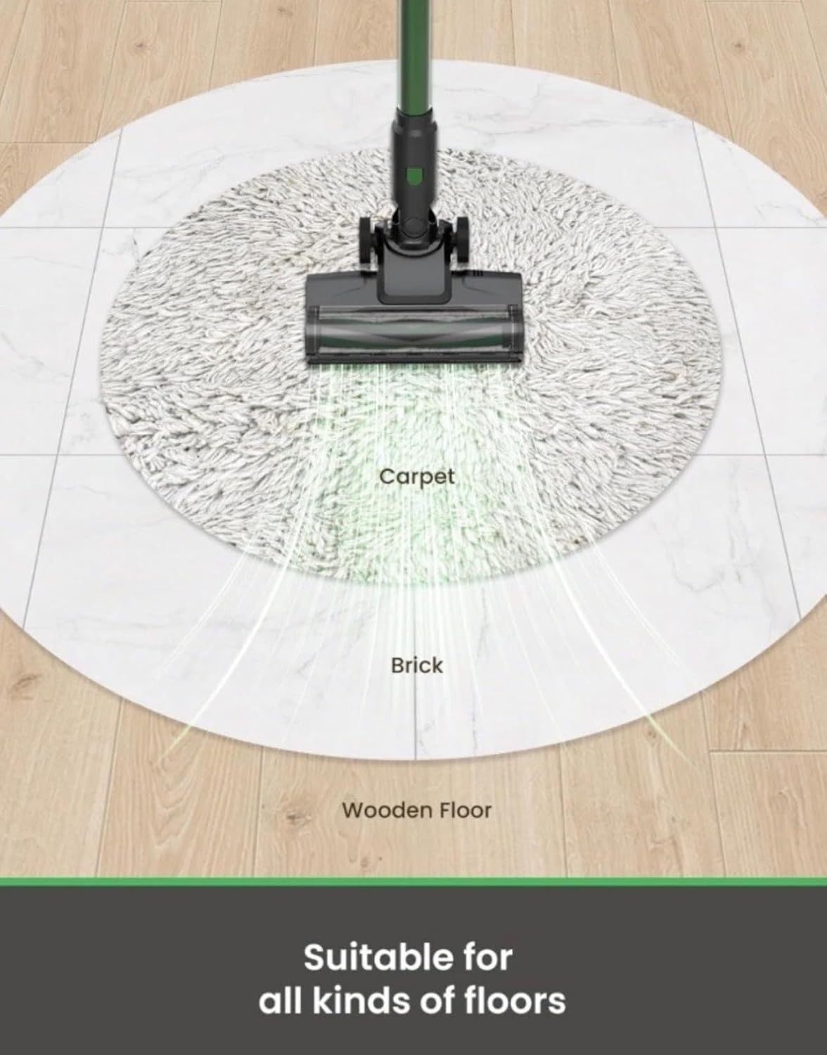 Transform your cleaning routine with this Vactidy Blitz V9 versatile cordless stick vacuum cleaner. The sleek black and green design features a waterproof construction and adjustable telescoping handle for comfortable use at any height. Perfect for whole-home cleaning, this vacuum tackles multiple surfaces with ease - from floors to furniture, mattresses, curtains, and hard-to-reach crevices. The specialized brush attachments make quick work of pet hair, crumbs, and everyday dirt. Its cordless design offers unrestricted movement while cleaning, and the thoughtful engineering allows you to convert it into different configurations for various cleaning scenarios. Whether you're cleaning couch cushions, desktop surfaces, or reaching high corners, this vacuum adapts to your needs. The lightweight construction and ergonomic handle ensure comfortable operation during extended cleaning sessions. Keep your living spaces pristine with this powerful and adaptable cleaning companion that brings convenience and efficiency to every corner of your home.