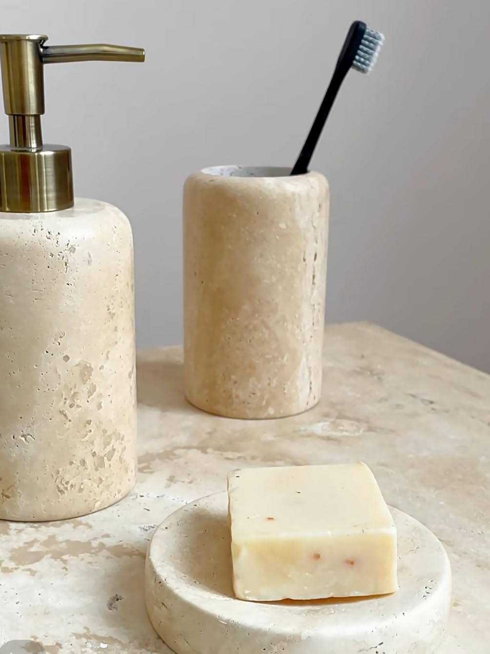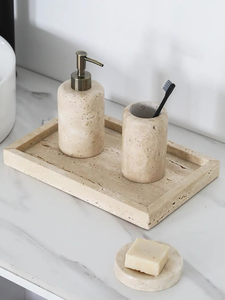 This toothbrush/toothpaste bucket is made of 100% natural travertine. It is not only durable and environmentally friendly, but also very beautiful and unique. It highlights the owner's taste and dresses up your bathroom. Packaging: 1pc toothbrush holder If you need other products (soap bottles, soap dish), please go to our store to find them.