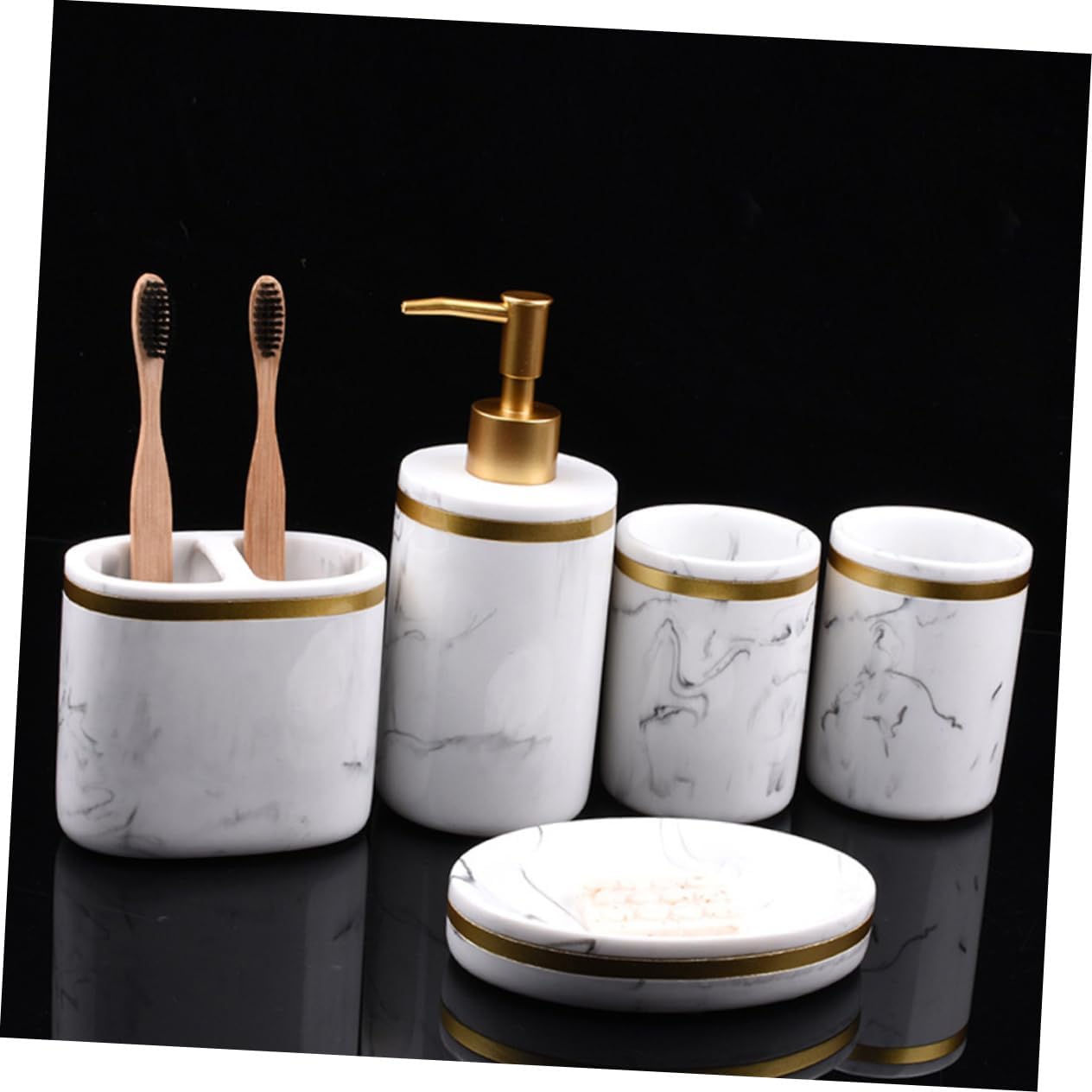 Package Include 1 x Set of 5Pcs Bathroom Accessories Features -Size Mouthwash Cups: Approx. 7.7 x 9.9 cm / 3.03 x 3.89 inch Dish -Material: Resin Hand Bottle -Color: Assorted Color Sanitary Ware -Size Dish: Approx. 14.4 x 9.5 cm / 5.67 x 3.74 inch Toothbrush Holder -Size Lotion Dispenser: Approx. 7.9 x 18.5 cm / 3.1 x 7.27 inch Mouthwash Cups -Size Toothbrush Holder: Approx. 9.6 cm / 3.78 x 4.33 inch Marbling Bath Accessories - Made of resin material for and use Brushing Cups. - , smooth surface, texture, not easy to deform and break, fashionable and decorative Imitation Marbling Lotion Dispenser. - Stylish design will bring elegance and charm to any bathrooms Pump Bottles. - Easily organize of bathroom supplies, and keep the bathroom clean and orderly Household Holder. - Simple but , this 5 pieces bathroom set can meet your daily washing needs Resin Toothbrush Holder.Goods InformationImitation Marbling Lotion Dispenser This simple, elegant and stylish bathroom accessories set will bring character and life to any bathroom.Mouthwash Cups They help you organize your washing tools and keep your bathroom tidy and organised.Toothbrush Holder Modern marbling appearance will well blend with bathroom decorative style.Marbling Bath Accessories All items are made of resin material
