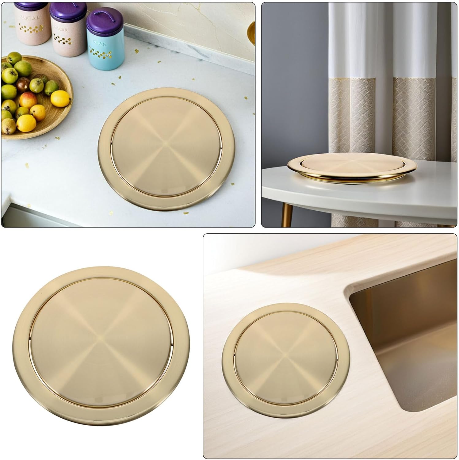 Package List 1 x Recessed trash can lid Characteristics -Size:23.80X23.80X3.30cm/9.35X9.35X1.30in(Maximum diameter) -Effortless operation: the balance flap cover opens smoothly, allowing for quick disposal while the swing trash can lid mechanism enhances user convenience with one handed access flap lid for trash bins -Product Info: Embedded trash can lid -feature: the flush trash can lid’s embedded design helps reduce odors within the bin, keeping your indoor spaces hygienic and comfortable countertop-mounted trash lid -reliable material for longevity: this stainless steel trash lid offers a robust solution for everyday use, making it the fit countertop trash can lid for kitchen or bathroom -Space efficient recessed lid: with a cabinet recessed bin lid, installation takes up minimal space, making it ideal for compact homes or office break rooms countertop embedded garbage lid -Color:Golden -Material:Stainless steel -Note: For 19.3-23cm Opening recessed trash lid -Size:18.30X18.30X3.30cm/7.19X7.19X1.30in(lid diameter) - and pet resistant: the recessed trash lid is engineered to close firmly, preventing easy opening or access by curious or pets for added home security kitchen counter trash flapGoods Informationcountertop embedded bin lid Upgrade your space with a countertop embedded garbage lid that incorporates a non-slip, balance flap cover for safe operation.worktop waste lid fit for kitchen counters and bathroom worktops, this stainless steel trash swing lid prevents odor spread and is engineered to keep small and pets from easy access