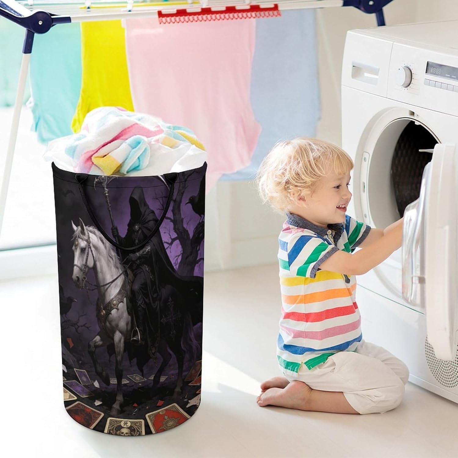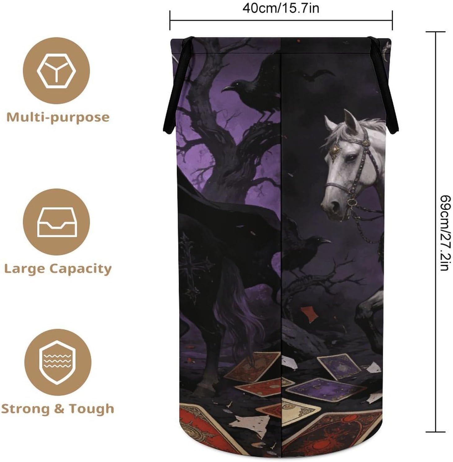 The pattern of the Tarot hamper is printed with exquisite patterns, which makes the product more attractive.Chic design allows it to be used in the living room to hold throw blanket, pillows, and reading materials, as well as in the bathroom for towels, or as a laundry hamper.The laundry hamper adopted collapsible design, equipped with handles. It is lightweight and portable for using, storing, and moving conveniently.Tarot Clothes hamper is suitable to store dirty clothes washing, place in the room to store toys, and other household goods, keep the house clean and tidy. Perfect laundry hamper for home, office, closet organizer, bedroom, bathroom, college dorm, etc.Gets out of your way when you need it to. This storage basket or laundry hamper is a good gift, which not only meets everyday storage needs but also carries deep care and love, a perfect way to turn thoughtfulness into warmth.