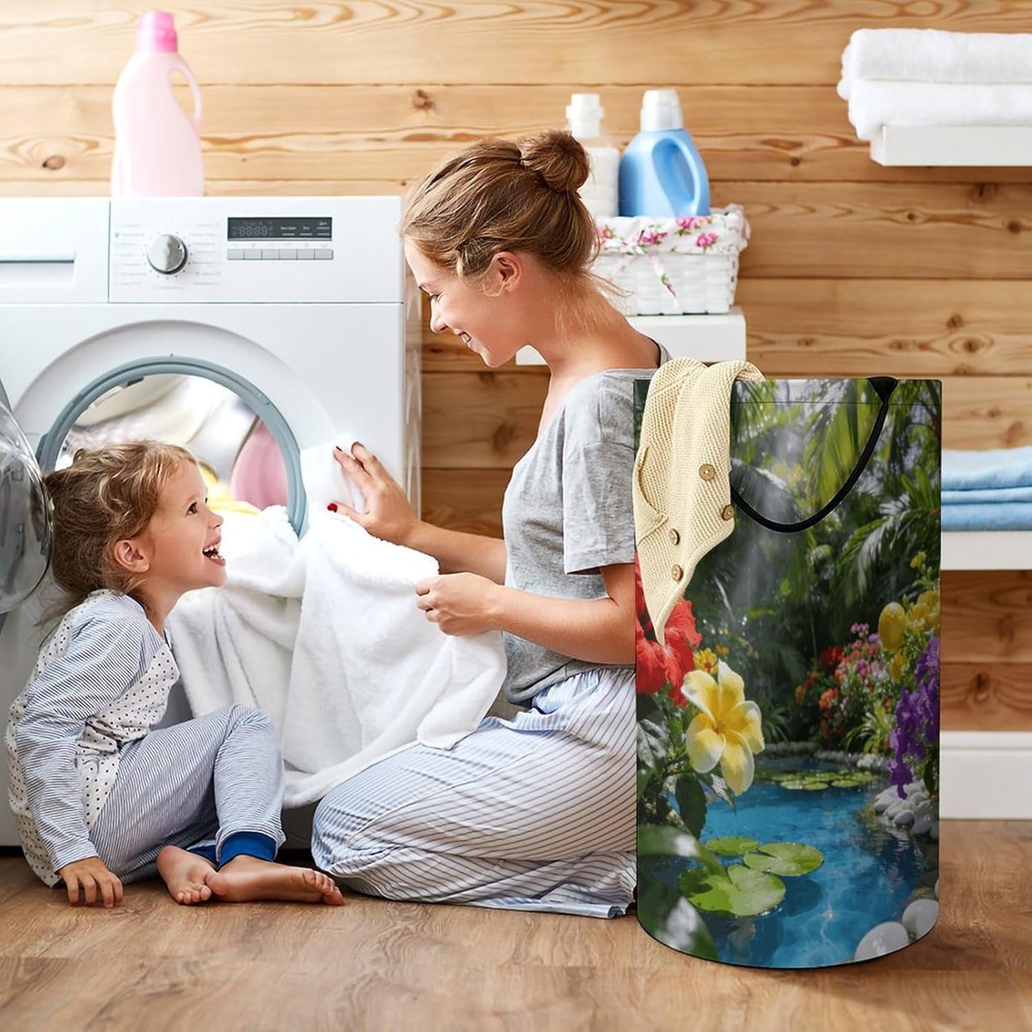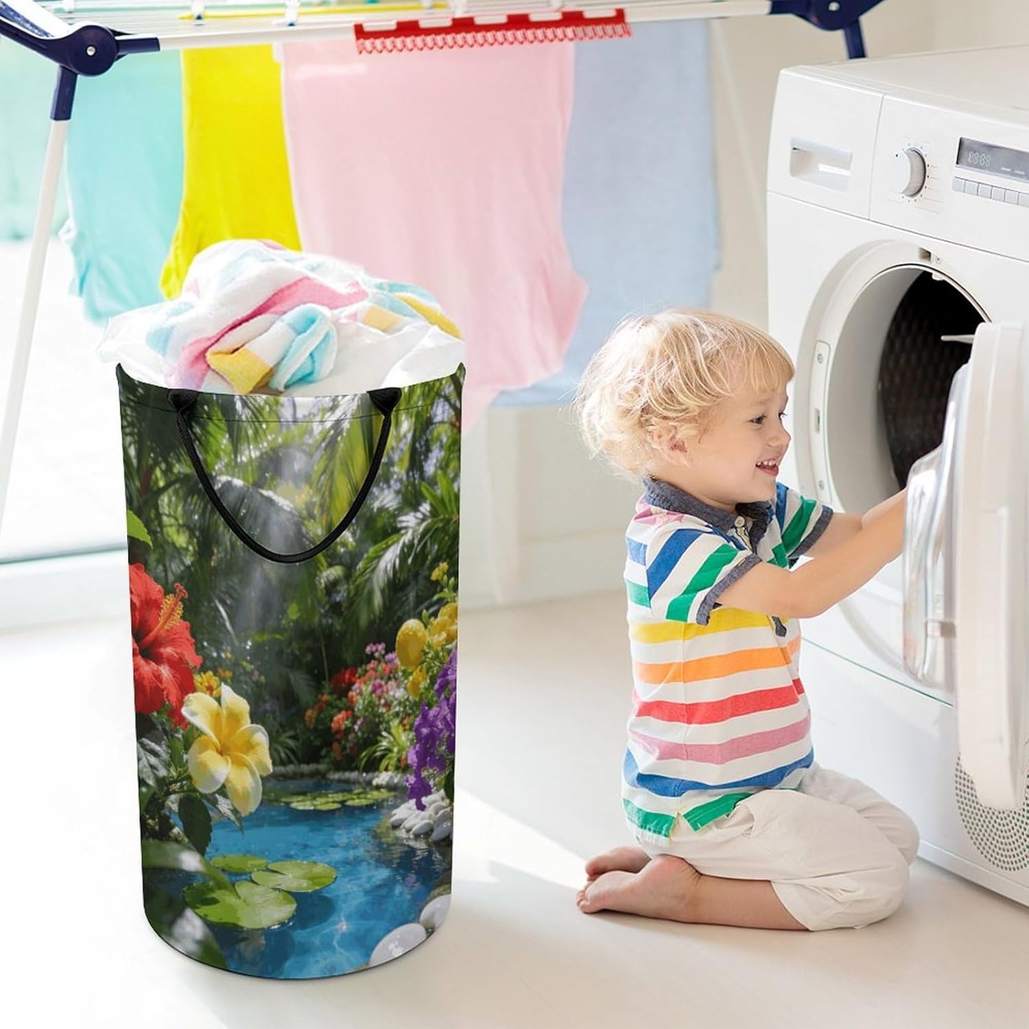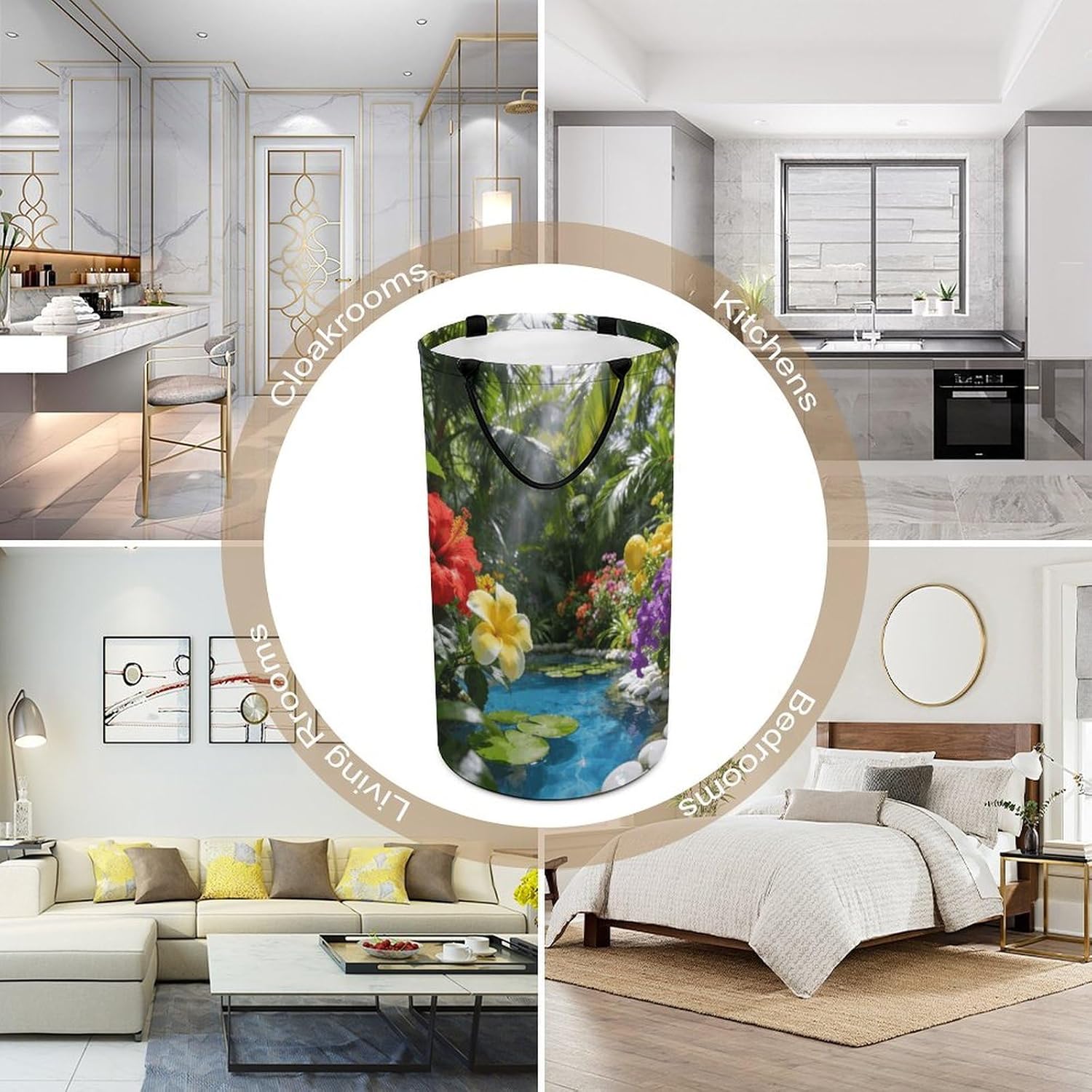 The pattern of the Tropical Garden hamper is printed with exquisite patterns, which makes the product more attractive.Chic design allows it to be used in the living room to hold throw blanket, pillows, and reading materials, as well as in the bathroom for towels, or as a laundry hamper.The laundry hamper adopted collapsible design, equipped with handles. It is lightweight and portable for using, storing, and moving conveniently.Tropical Garden Clothes hamper is suitable to store dirty clothes washing, place in the room to store toys, and other household goods, keep the house clean and tidy. Perfect laundry hamper for home, office, closet organizer, bedroom, bathroom, college dorm, etc.Gets out of your way when you need it to. This storage basket or laundry hamper is a good gift, which not only meets everyday storage needs but also carries deep care and love, a perfect way to turn thoughtfulness into warmth.