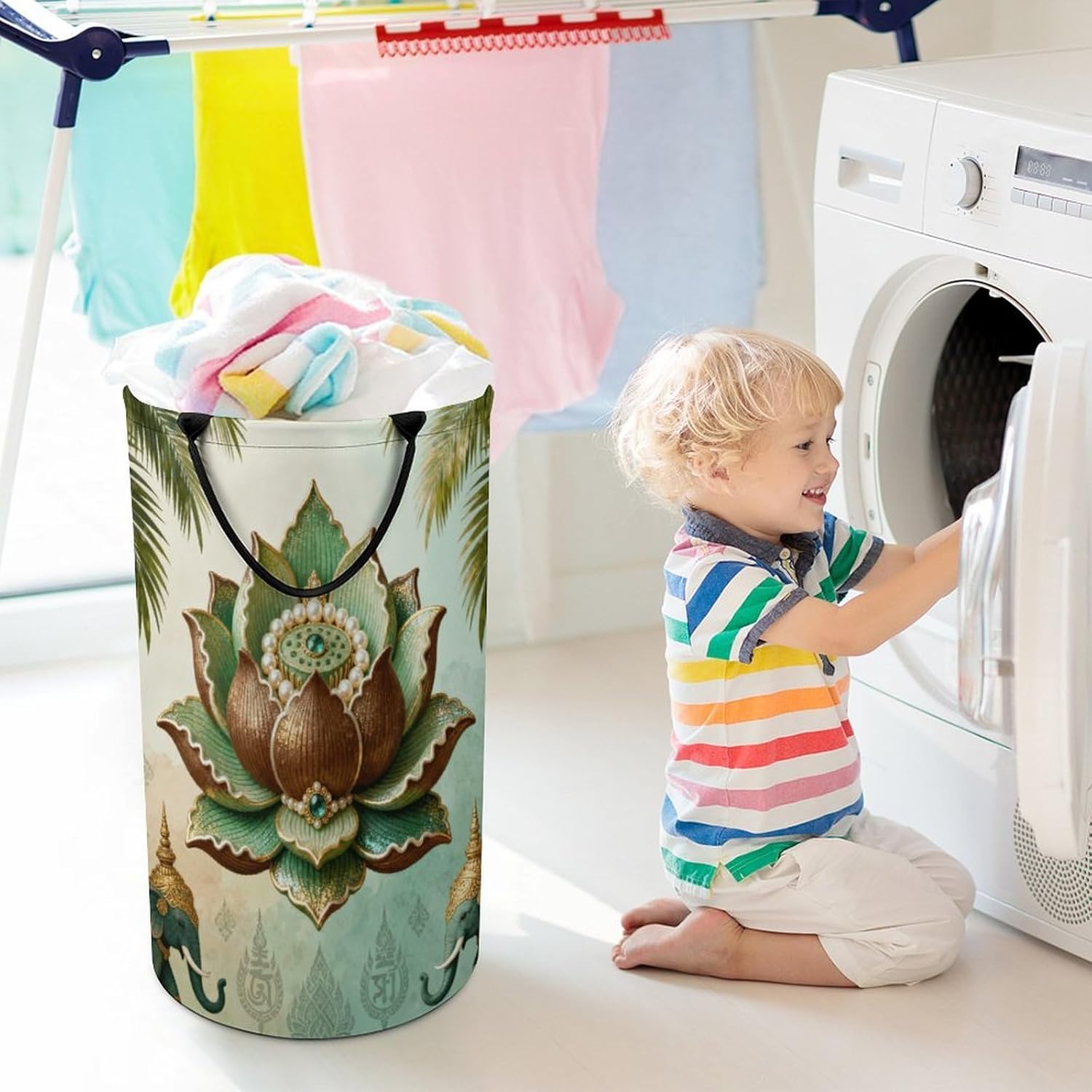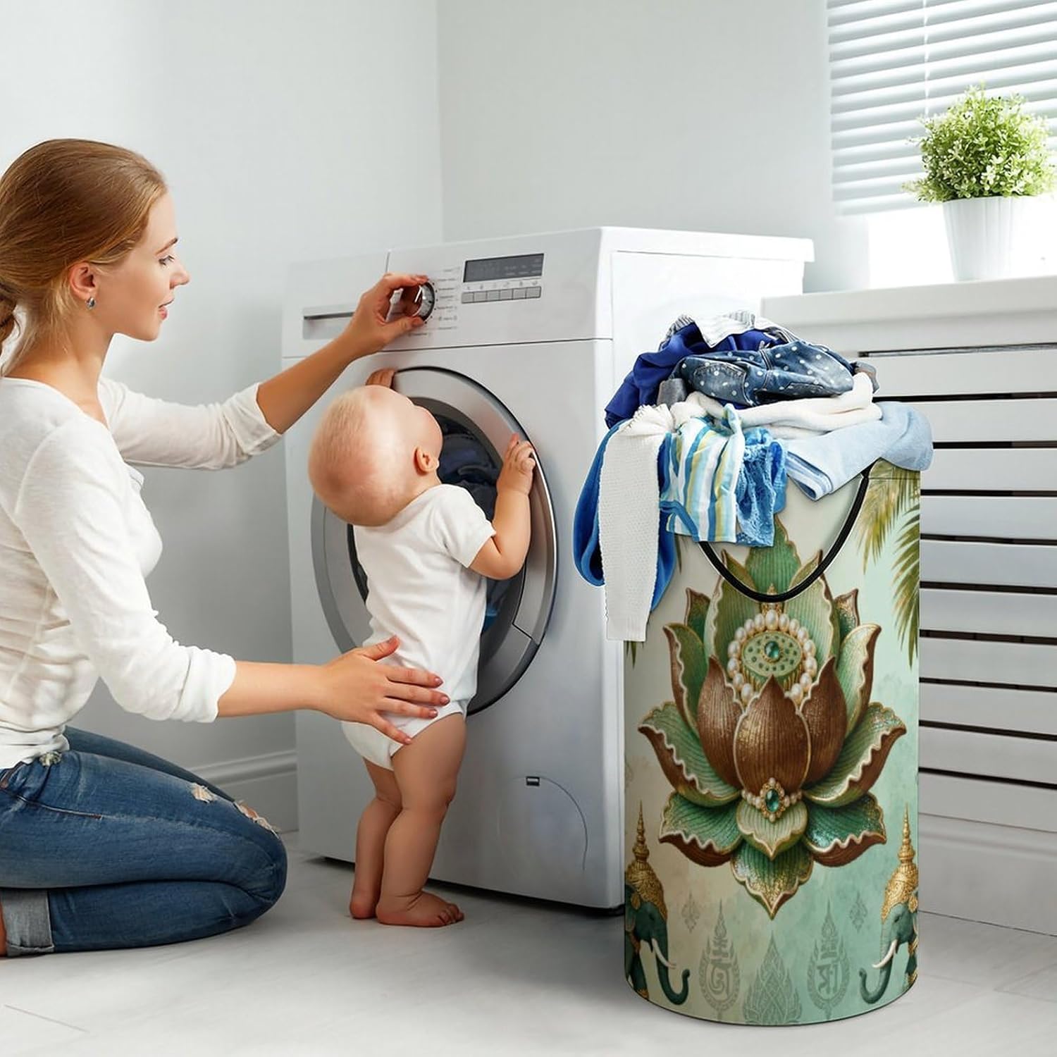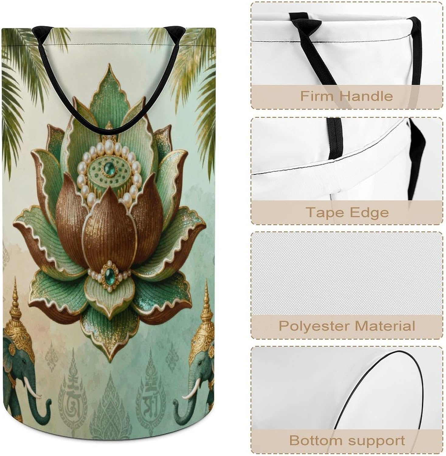 The pattern of the Green Lotus Golden Elephant hamper is printed with exquisite patterns, which makes the product more attractive.Chic design allows it to be used in the living room to hold throw blanket, pillows, and reading materials, as well as in the bathroom for towels, or as a laundry hamper.The laundry hamper adopted collapsible design, equipped with handles. It is lightweight and portable for using, storing, and moving conveniently.Green Lotus Golden Elephant Clothes hamper is suitable to store dirty clothes washing, place in the room to store toys, and other household goods, keep the house clean and tidy. Perfect laundry hamper for home, office, closet organizer, bedroom, bathroom, college dorm, etc.Gets out of your way when you need it to. This storage basket or laundry hamper is a good gift, which not only meets everyday storage needs but also carries deep care and love, a perfect way to turn thoughtfulness into warmth.