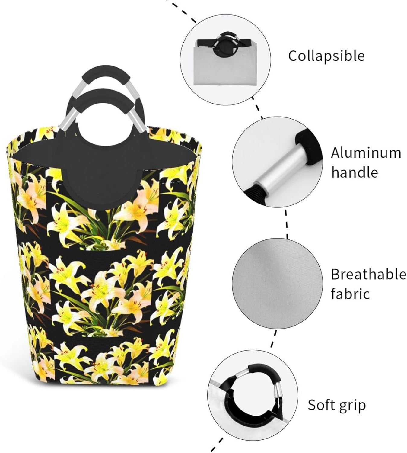 Our A bouquet of lilies dirty clothes storage bag is made of polyester, which is lightweight and flexible. It can maintain a stable shape even under heavy pressure and collision. At the same time, the incorporation of Oxford cloth material significantly improves the durability of the product, and it is resistant to wear, bumps and pulling. The storage bag is designed with a large capacity, which can easily carry winter clothes, daily clothes and a variety of sundries. It is easy to carry and store, and fits tightly into the gap of the suitcase after folding. The aluminum handle is sturdy and reliable, supports hanging, and is suitable for a variety of places. In terms of design, it adopts leak-proof technology, combined with waterproof coating and precision sewing, which is effectively waterproof. The exterior uses cutting-edge transfer technology, and a PE board support is added at the bottom to ensure stable load-bearing and prevent tipping. This storage bag is practical and easy to use, and is an ideal choice for travel and home.