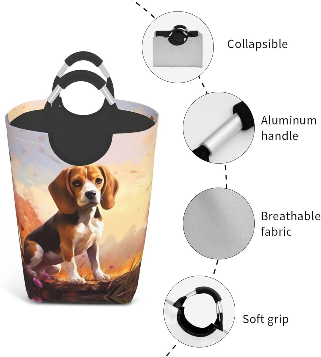 Our Nerdy Beagle dirty clothes storage bag is made of polyester, which is lightweight and flexible. It can maintain a stable shape even under heavy pressure and collision. At the same time, the incorporation of Oxford cloth material significantly improves the durability of the product, and it is resistant to wear, bumps and pulling. The storage bag is designed with a large capacity, which can easily carry winter clothes, daily clothes and a variety of sundries. It is easy to carry and store, and fits tightly into the gap of the suitcase after folding. The aluminum handle is sturdy and reliable, supports hanging, and is suitable for a variety of places. In terms of design, it adopts leak-proof technology, combined with waterproof coating and precision sewing, which is effectively waterproof. The exterior uses cutting-edge transfer technology, and a PE board support is added at the bottom to ensure stable load-bearing and prevent tipping. This storage bag is practical and easy to use, and is an ideal choice for travel and home.