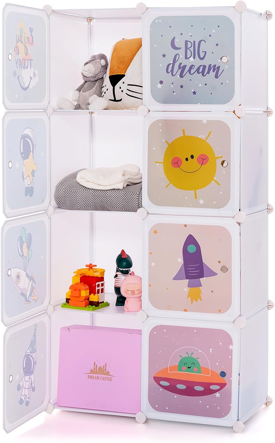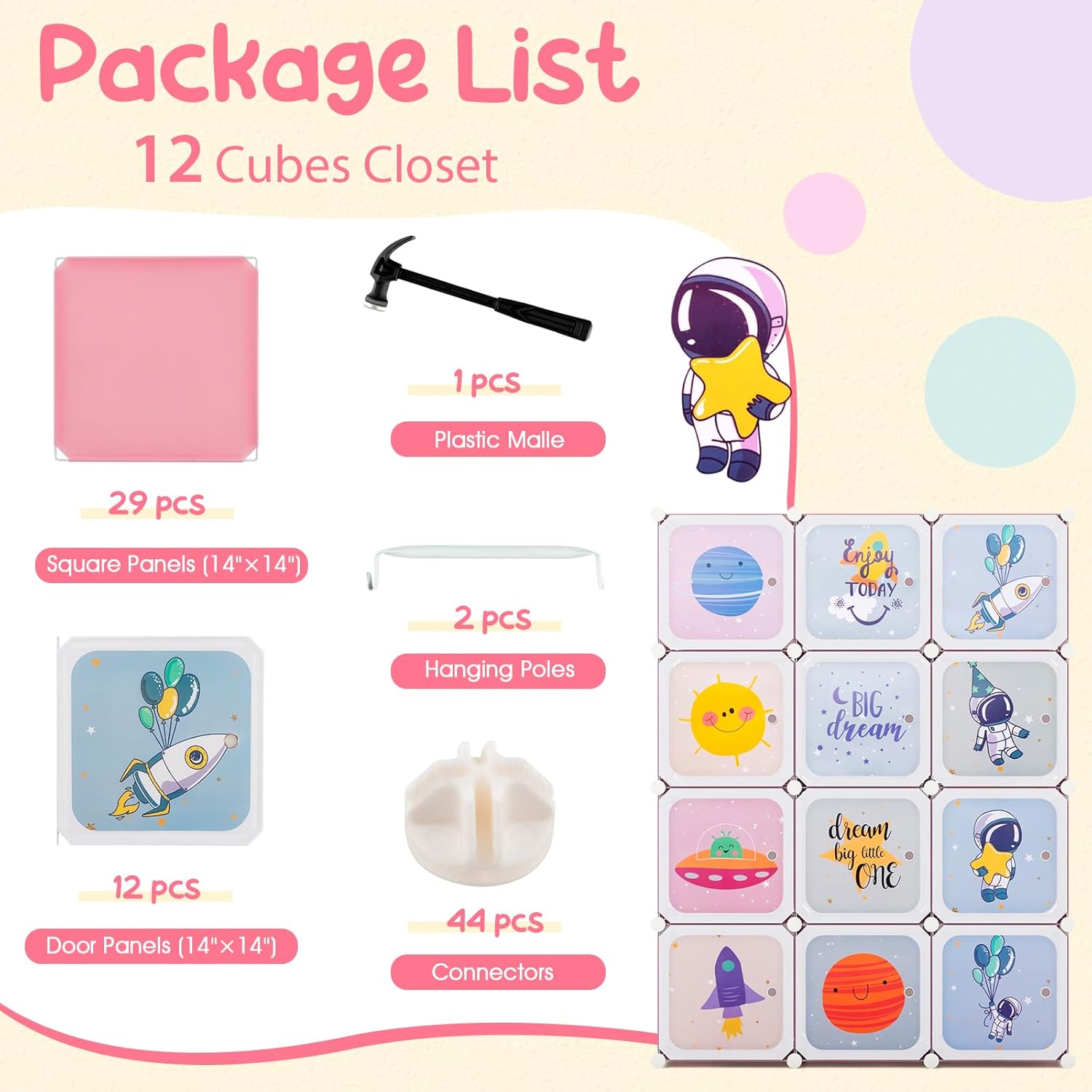 Why do you choose INFANS children wardrobe? The toddler closet comes with 12 cubes & 2 extra hanging rods. Cubes can be used separately or stacked, combined into a variety of different blocks to suit your various needs. Allow you can to make customizable designs for different spaces or rooms. The size of baby clothes storage cabinet is 42"x 14"x 56", which can help you easily store a variety of children's clothes, books, toys, household items and so on. Each cube size is: 14"x 14"x 14". Fits storage bins that is smaller than 13" x 13". Features: More durable and sturdier than fabric wardrobes Multi angle connectors are easily attachable on the panels The clothes closet comes with 12 cubes and 2 extra hanging rods Portable closet can help you easily store a variety of children's clothes, books, toys, household items and so on The high quality PP material has the function of waterproof and easy to clean, which is easy for your daily cleaning Cubes can be used separately or stacked, combined into a variety of different blocks to suit your various needs Specification: Color: Blue Product Size: 42"x 14"x 56" Size for Each Cube: 14"x 14" x 14" Each Cube Can Hold Max 10 lbs Material: Steel Iron Wire, PP Plastic Sheets, ABS Plastic Connectors Package Includes: 41x Rectangular Panels 12 x Square Doors 44 x ABS connectors 2 x Hanging Rail 1 x Hammer 1 x Instruction Manual