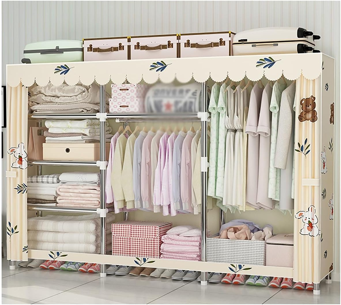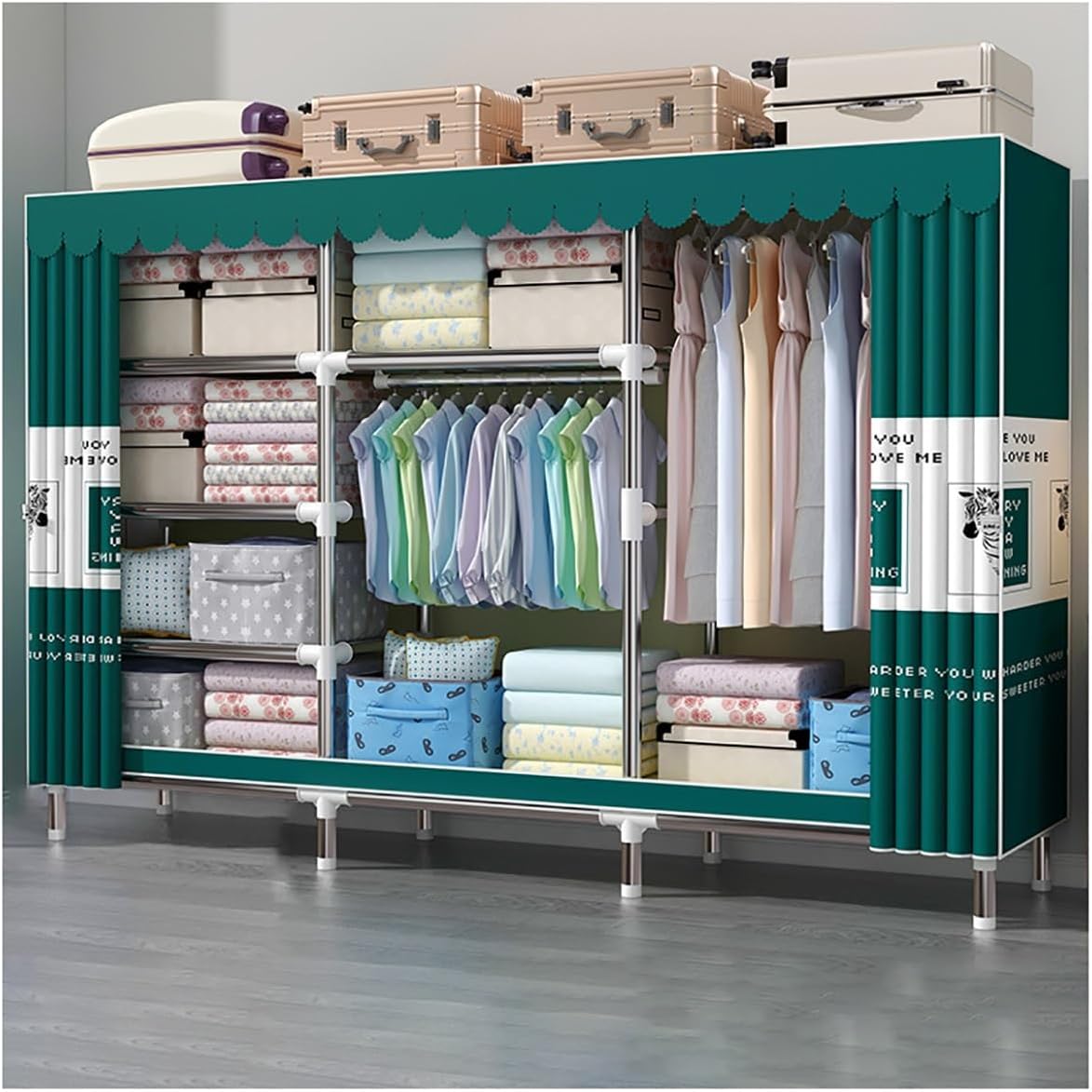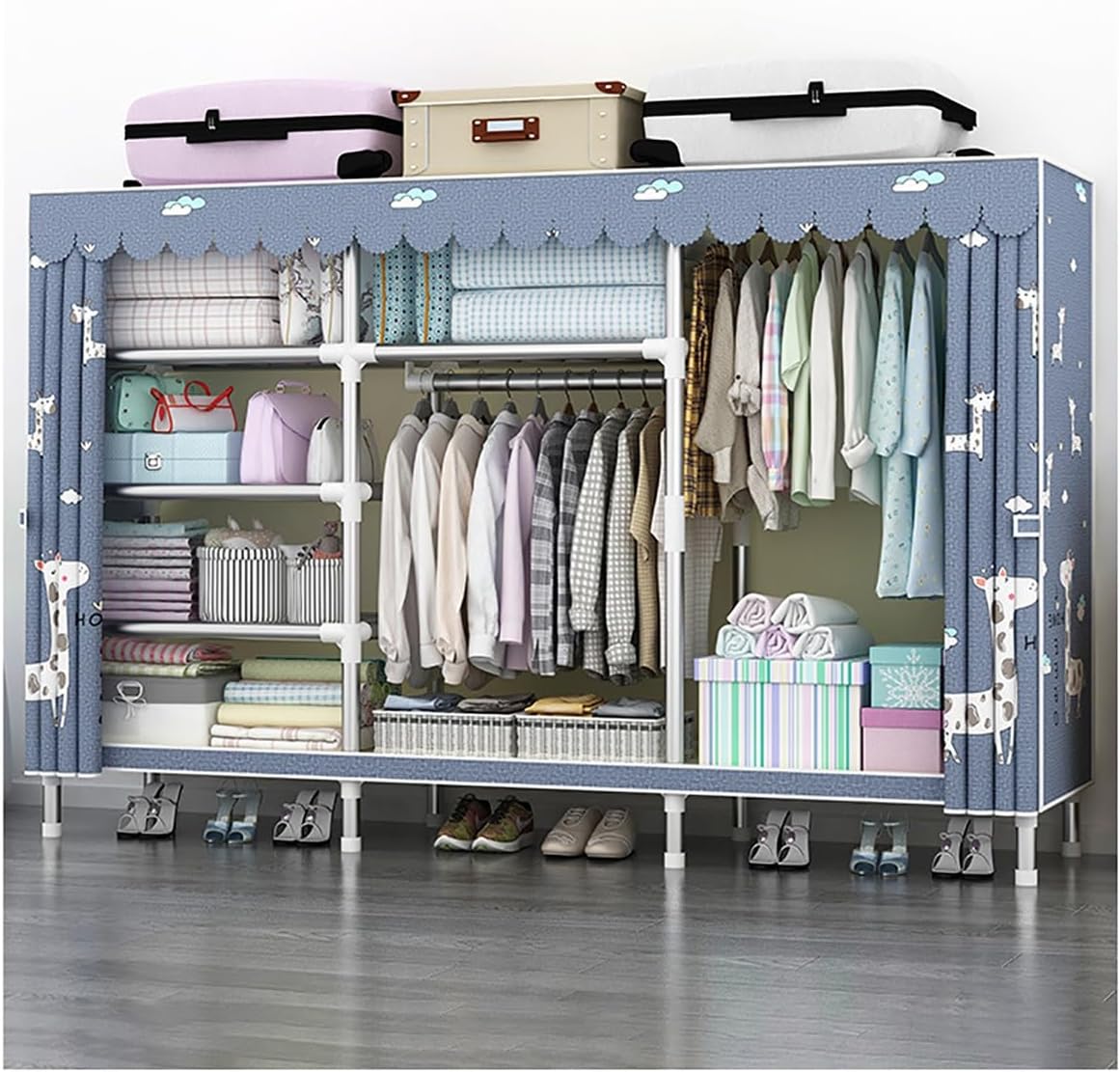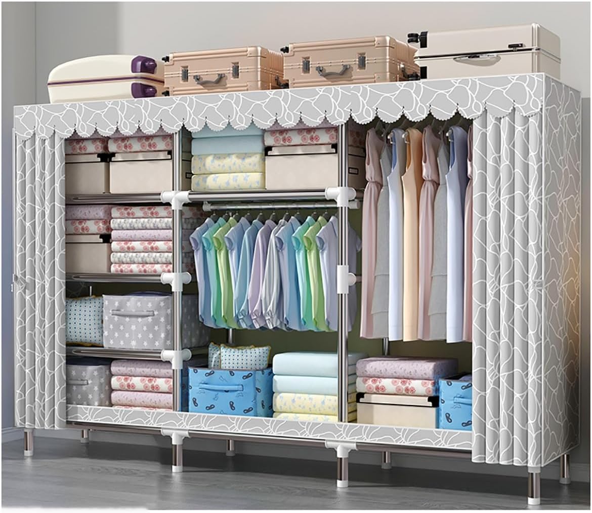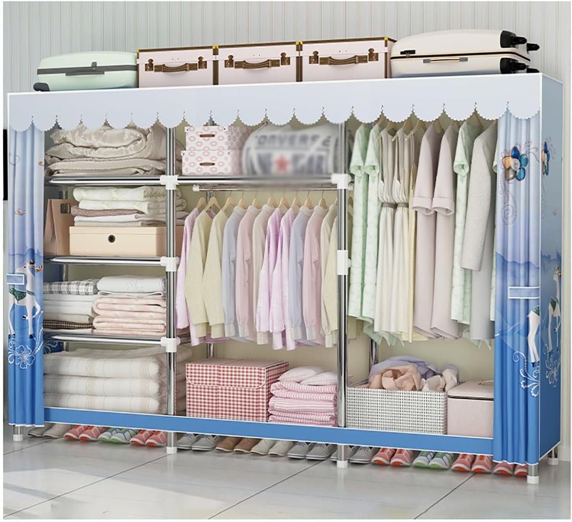 Portable Closet with Cover measures 250x45x170cm, providing ample storage space, our clothing rack is built to last and support all of your clothing, shoes, and other household items.With 5 compartments, it adds more space for all your clothes and accessories and makes your home neatly organized. Specifications:Color: Blue-A , Blue-B , Blue-C , Green-A , Green-B , Green-C , Beige-1 , A , Gray AMaterial: Fabrics + 26mm steel Tube+ABSProduct Size(LXWXH):250x45x170cm/98.42x17.71x66.92inPackage Contents:1 x Portable Closet with Zipper1 x Non-Woven Fabric CoverNote:1. Please note that the color tone of the picture may be slightly different from the actual product due to lighting effects, brightness/contrast settings of the monitor, etc.2. This size information is just for reference only. Allow 1-2cm error due to manual measurement.3. Please don't overload the rack, otherwise it may tilt or fall down.