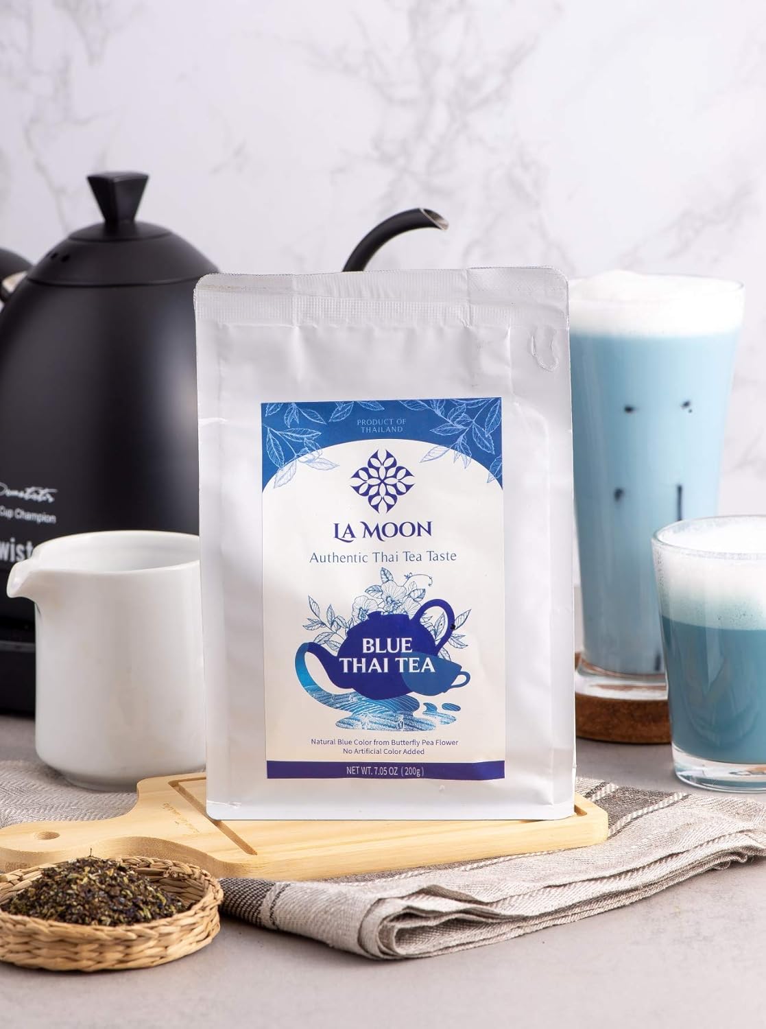 • NATURAL BLUE COLOR: La Moon Blue Thai Tea is made with only natural blue pea flower tea butterfly powder. Say goodbye to harmful commercial food coloring! Our product delivers the vibrant blue color you love.