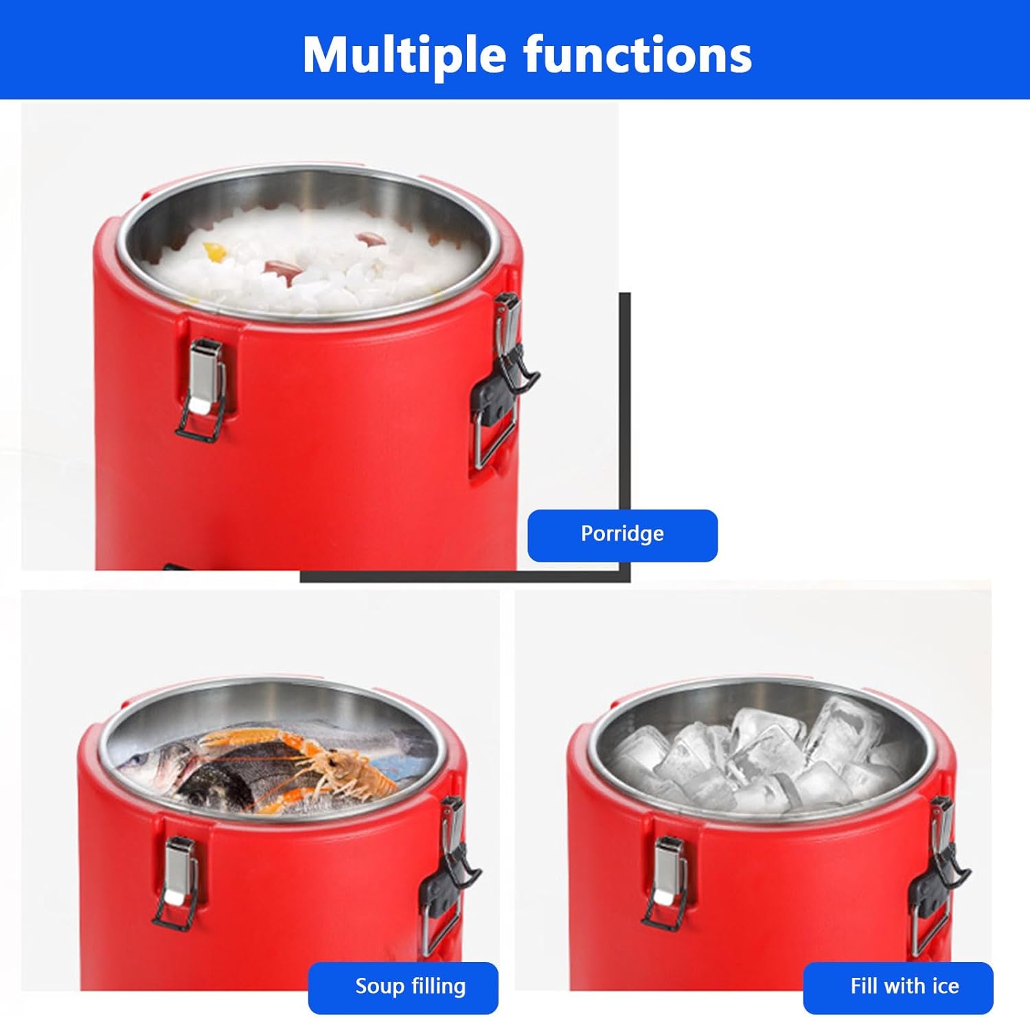 This insulated beverage dispenser can keep warm and cold, drink warm coffee in winter, and enjoy ice-cold delicious juice in summer.This ice bucket can be added to coffee, tea, water, milk, soup, etc. And beer tub can be used in cafes, buffets, offices, hotels, kindergartens, outdoor, tea houses, camping, gardens, wedding receptions, construction sites, or various large events or celebrations.SpecificationCapacity: 20L,30L,40L,50L,60L,70L,80LColor: redInsulation Material: PU Full FoamInner Liner Material: Stainless SteelKeep Warm Time: Up to 6-24HPackage Included1* Insulated Beverage Dispenser