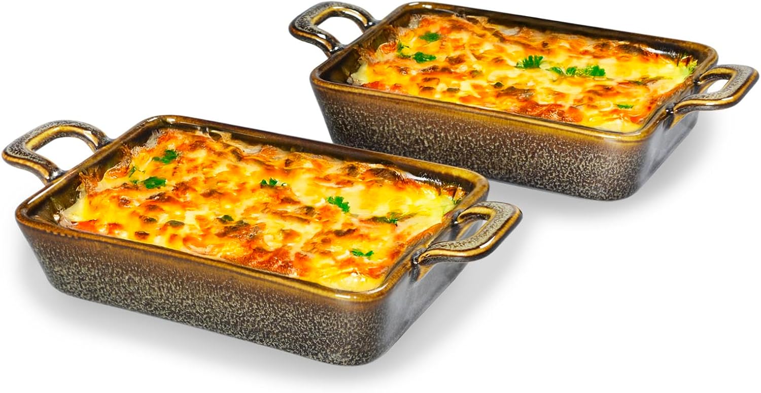 Packaging includes: 2 x Ceramic Au Gratin Pans, Bakers, Casseroles. dingdaer Au Gratin Baking Dishes for Oven Safe and Microwave Cooking and Baking, 2 piece, Heat Resistant Ceramic with Handles for Serving, Small Casserole Dish Set for 1 or 2 person servings Rectangular design: The size is 7.3"L x 4.7"W 1.9"D, 10 in with Double Handle, 23.7 oz / 700ml. Baking dish set for 1 or 2 person servings, Ceramic material: This Baking Dish is made of ceramic,The surface is smooth and bright, and it is very easy to clean, It can be used in the oven, microwave, freezer and dishwasher.NOTE: No induction cooker and direct fire Different occasions: You can use it as a housewarming gift. At the same time, the classic porcelain is not only suitable for family use, but also suitable for cafes, restaurants, parties, etc This durable and elegant baking dish, designed by a Michelin-starred chef, transcends simple baking utensils, combining beautiful design, superior craftsmanship, and powerful functionality. We believe the kitchen is the heart of every home. Each of our cookware collections blends ingenious innovation and exquisite craftsmanship, designed to bring you unforgettable cooking experiences.