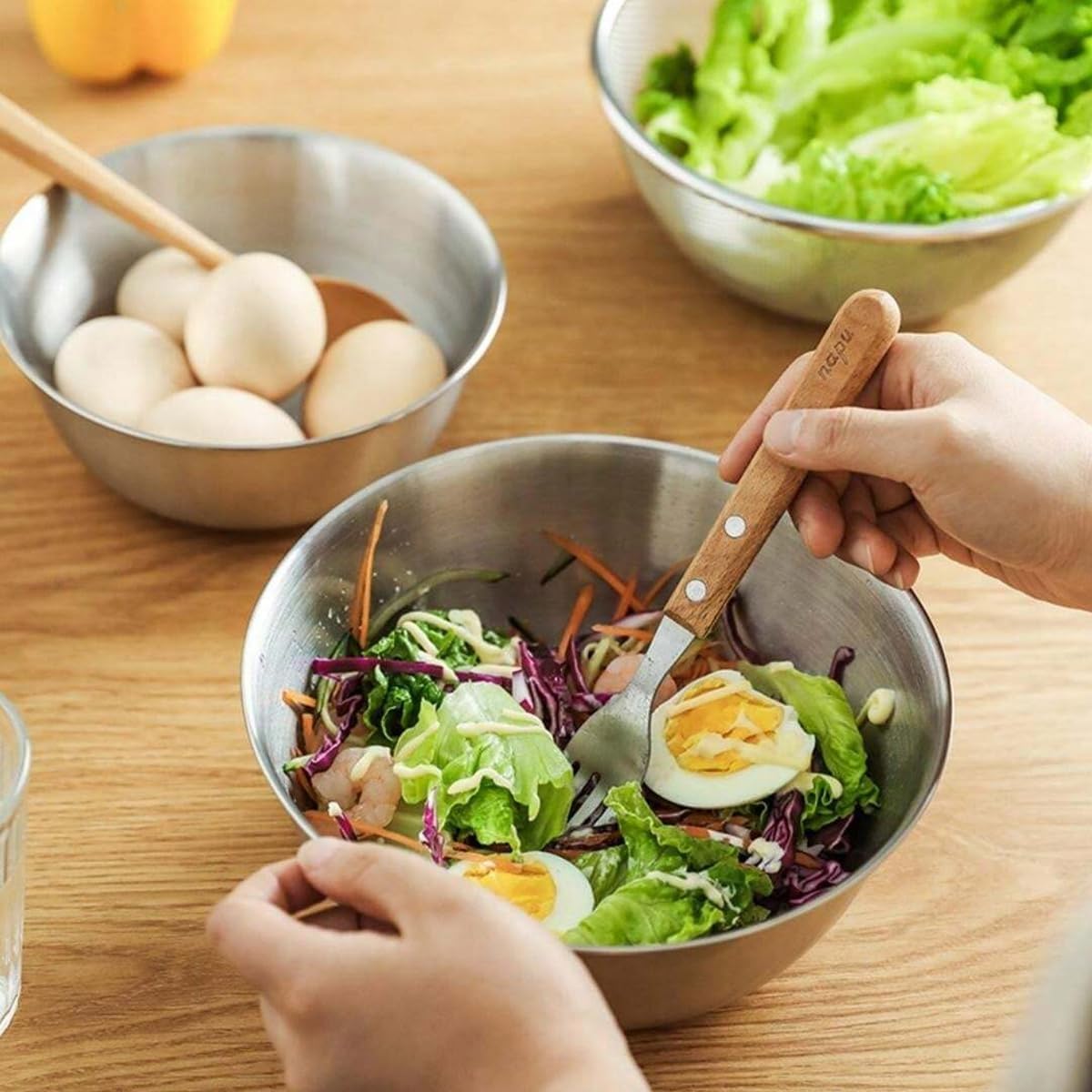Elevate your food preparation with this premium SOULVZA mixing bowl set featuring stunning white and yellow colourways. Crafted from professional-grade 304 stainless steel, these versatile bowls are perfect for mixing salads, preparing ingredients, or serving dishes at your table. The sleek dual-tone design combines functionality with modern aesthetics, while the durable stainless steel interior ensures long-lasting performance and easy cleaning. The set includes multiple sized bowls that nest together for convenient storage. The lightweight yet sturdy construction makes these bowls ideal for daily use in both home and commercial kitchens. The smooth interior prevents food from sticking, while the wide rim design allows for comfortable handling and pouring. Whether you're tossing a fresh salad, mixing cake batter, or serving snacks, these multipurpose bowls will become an essential part of your kitchen arsenal.Instructions and instructions for use.1. After using the tableware for some time, there may be a layer of mist on the surface. You can use a soft cloth dipped in a cleaning powder to wipe it and restore its brightness.2. When cleaning, it is important to avoid surface scratches. Do not use detergents with bleach or abrasive ingredients, steel wool, sanding tools, etc.3. Never use baking soda to clean.4. After using stainless steel tableware, do not leave it to soak in water for a long time without washing. Clean and dry them immediately and avoid allowing them to air dry. If stains appear on the surface, you can wipe them with wax.Package includes:Bowl 1 - Diameter 19 cm - 1.2L(1.27 Qt)Bowl 2 - Diameter 22 cm - 1.8L (1.9Qt)Bowl 3 - Diameter 24 cm - 2.5L(2.64 Qt)
