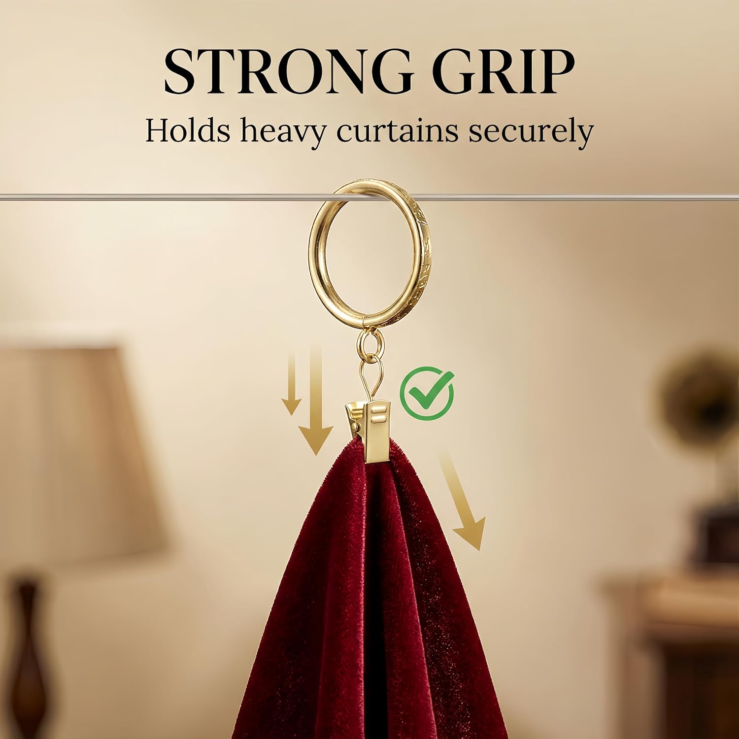 XHLTTBD 24 Pack 1.5 Inch Gold Curtain Rings - Cloud Carving & Dual-Use Design, Perfect for Light Luxury Standard Windows Looking for reliable dual-use gold curtain rings for 1.2-1.4 inch medium rods and standard window installation with light luxury decor? Tired of separate clips and eyelets that cost extra, or low-quality rings that rust and fade easily? Our 24-pack 1.5 inch gold cloud pattern carved curtain rings (clips & eyelets dual-use) are tailored for medium-large windows, combining heavy-duty performance with luxury bright gold design, perfect for 2-3 standard windows or 1 large floor-to-ceiling window. We focus on medium-diameter precision matching: 1.5 inch precise inner diameter, high-quality iron, 12lb stable load-bearing, perfectly fits 1.2-1.4 inch medium-diameter curtain rods for living rooms, bedrooms and dining rooms. No more loose or tight installation—slide on and use directly, eliminating the frustration of mismatched hardware for medium rod needs. The exclusive dual-use design avoids clip detachment and hook incompatibility, keeping your curtains hanging neatly and securely for daily frequent use, luxury gold details never fade. Luxury design meets practicality: The smooth bright gold outer ring features exquisite cloud pattern carving, infusing traditional Chinese delicate charm into modern light luxury home decor. It seamlessly matches light luxury, new Chinese, French minimalist, classic and other styles, enhancing the overall noble and sleek texture of your home windows. The professional gold electroplating coating provides all-round protection—resists oxidation, rust and scratches, maintaining the smooth bright finish for years without frequent maintenance, even in humid areas like kitchens and bathrooms. Daily use is effortless: The smooth polished surface reduces friction between the ring and medium-diameter rod, ensuring quiet gliding every time you pull the curtain, no annoying noises disturbing your rest or work. The heavy-duty iron structure ensures long-lasting sturdiness—no bending, no breaking, even when supporting heavy curtains like thick linen drapes or double-layer sheers. With 24 rings per pack, it’s a perfect quantity for small whole-house or single space light luxury use, no redundant purchase, saving your time and budget for home decoration. Installation is a breeze—no drilling, no complex tools. Just slide the half-round rings onto your 1.2-1.4 inch medium-diameter rod and choose between the metal clips (for rod-pocket curtains) or eyelets (for hook-style curtains). It’s perfect for renters (no wall damage) and homeowners (time-saving light luxury window decor). We stand behind our products with strict quality control—each ring undergoes rigorous testing before leaving the factory. If you have any questions about size, installation or use, our professional team will respond within 24 hours. Warm Tips ① Please confirm your curtain rod diameter is 1.2-1.4 inches before purchase; ② Clean with a soft dry cloth—avoid water washing or hard scraping to protect the electroplating coating and keep the smooth bright gold finish.