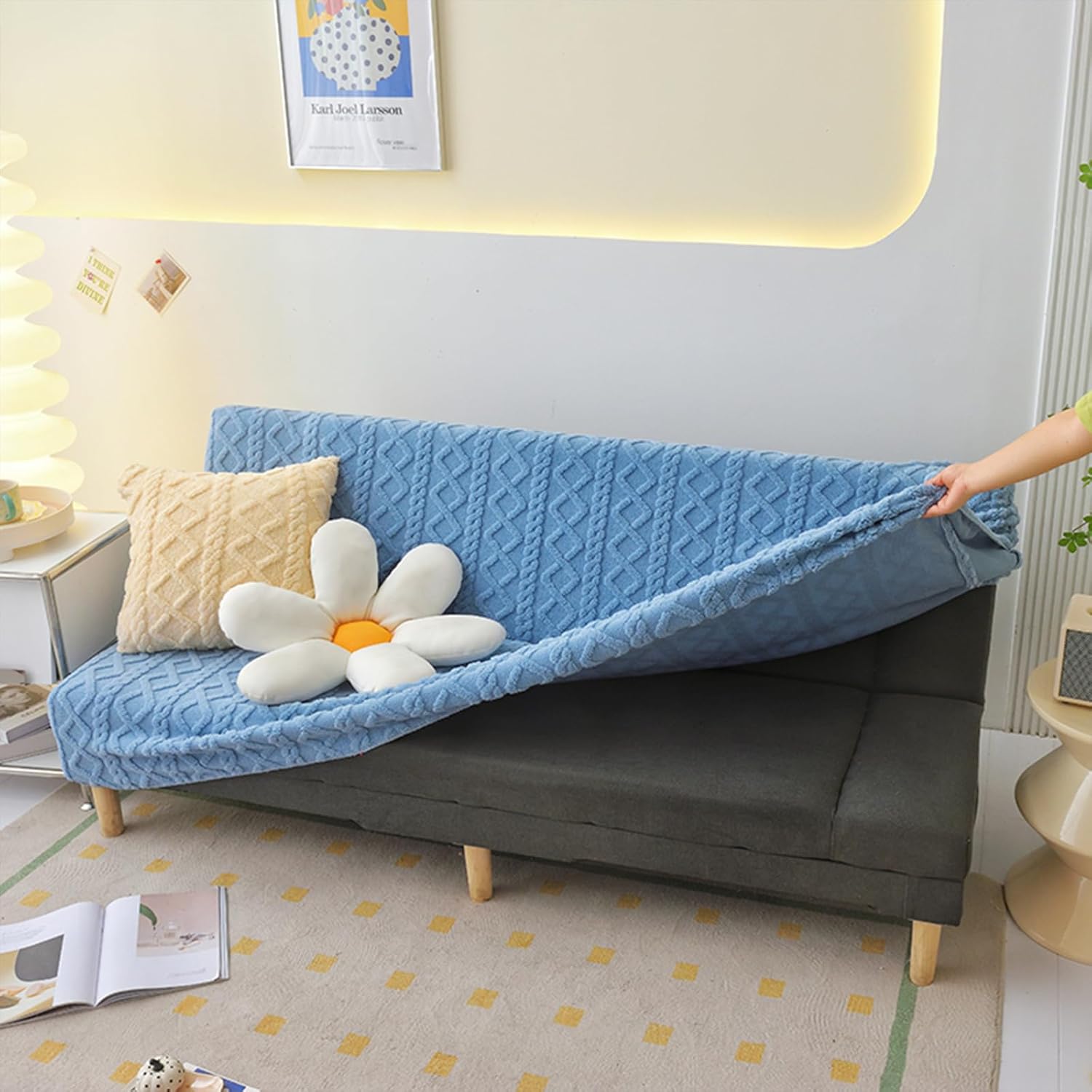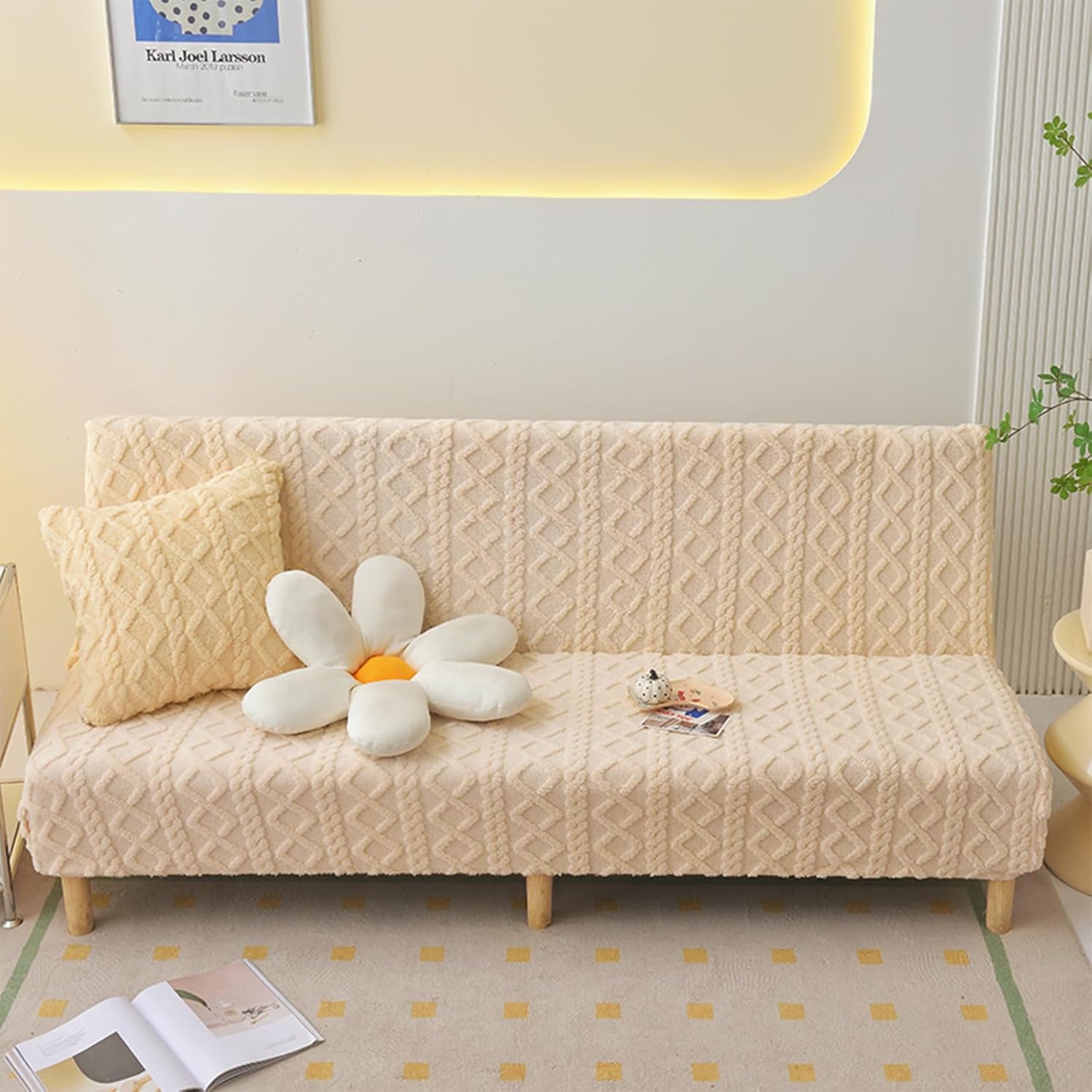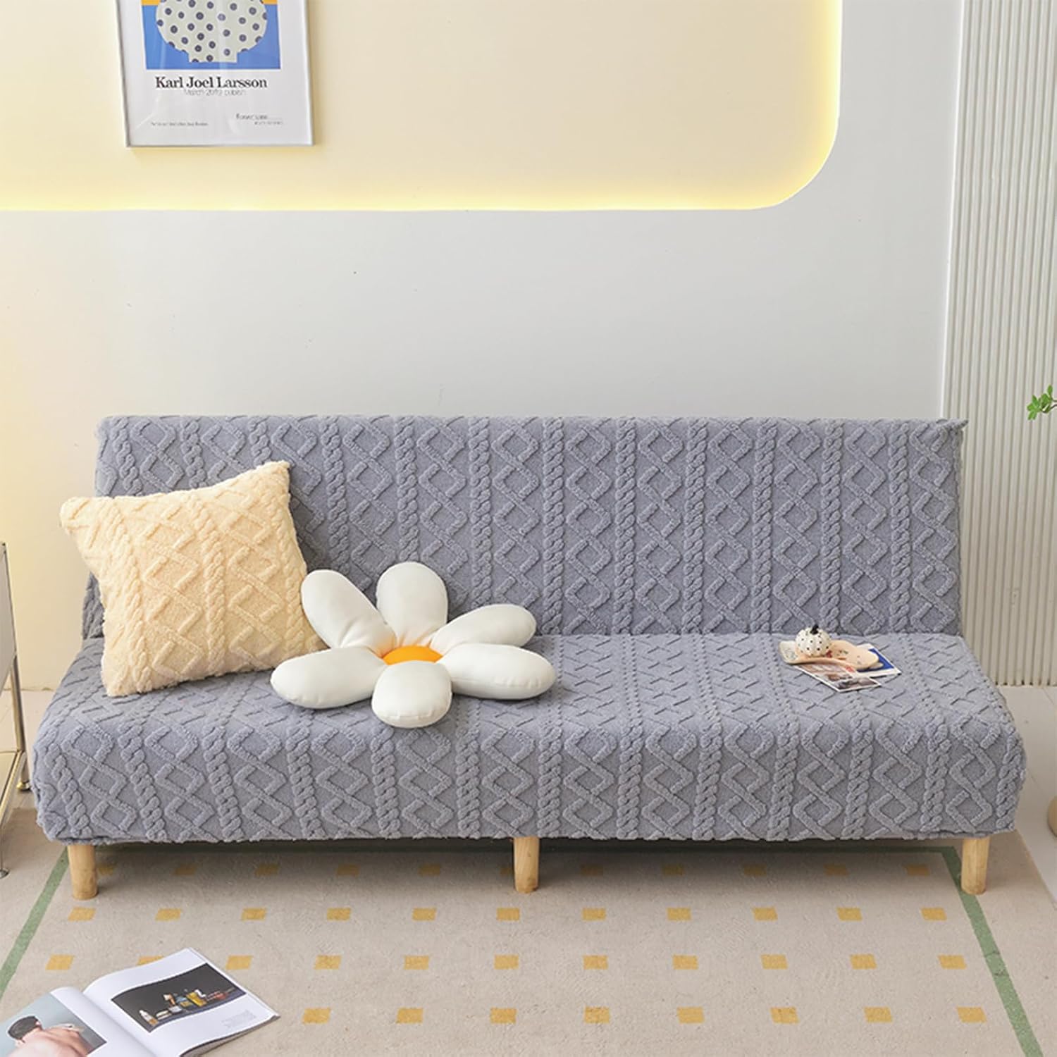 Flannel- Sizes Available: - S: Sofa length 120-145 cm/47-57 inch, width 50-60 cm/19-23 inch, backrest height 50-60 cm/19-23 inch, cushion thickness 20-25 cm/8-10 inch - M: Sofa length 150-185 cm/59-73 inch, width 50-60 cm/19-23 inch, backrest height 50-60 cm/19-23 inch, cushion thickness 20-25 cm/8-10 inch - L: Sofa length 190-230 cm/75- 90 inch, width 50-60 cm/19-23 inch, backrest height 50-60 cm/19-23 inch, cushion thickness 20-25 cm/8-10 inchPackage includes: 1x sofa bed coverNote:1. This sofa cover is suitable for non-armrest sofas/armless futons/folding sofa beds. It is not suitable for sofas with armrests. Please carefully check the style of your sofa bed and refer to our size guidance before purchasing.2. Easy maintenance with wrinkle-free fabric. Machine wash in cold water, do not bleach, tumble dry low, and do not iron.3. Please allow for 0.4-1.2 size differences due to manual measurement. The slipcover size should be slightly larger than the sofa size.4. The color of the slipcover may vary due to lighting and screen differences.