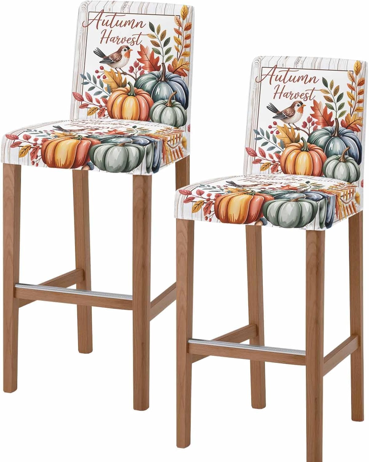 Will you be happy when you face worn-out cushions, messy chair backs, and flawed bar stools every dayWhen your guests visit your home on Halloween, Thanksgiving, or Christmas, would they be disappointed to see these dirty chairsThis sounds upset.People need to dress up, and so do chairs.You need counter height chairs backrest covers for bar pub kitchen dining room cafe furniture, as fall table decorations, christmas decorations indoor outdoor.Printed bar stool covers with back will give your bar stool a new look, fit for any holiday party decorations.Integrated counter stool pub cover, one-size-fits-most, allowing you to have both chair seat back cover and chair seat cushion cover at the same time.Beautiful Decorations:Stretch Counter Height Chair Covers are perfect for matching with your decor theme.Colorful and cute patterns, beautify your space, guests can notice bar stool seat covers as soon as they enter.Changed the look of your table set. Give your house a whole new look.Creating a strong festive atmosphere in your house or yard, allowing your neighbors to appreciate and praise you.Adds a seasonal atmosphere to your home and is a necessary autumn or winter outdoor decoration for the courtyard.Great gift idea.Information:Made with a blend of 95% polyester and 5% spandex, swivel barstool is soft and elastic, antipilling, no wrinkles.Fits like a glove, full coverage, provide all around protection, from chair back to seat cushion, middle low back chair covers extend the life of your counter chair.With elastic band in edge, great bar stool covers for older barstool chairs fit well, makes the stool slipcover stays in place.Removable stool seat cover is a must-have home protector for families with kids and pet.Stretch barstool slipcovers are easy to put on and remove.Indoor outdoor furniture cover has great elasticity, fit for suitable sized reclining chairs.